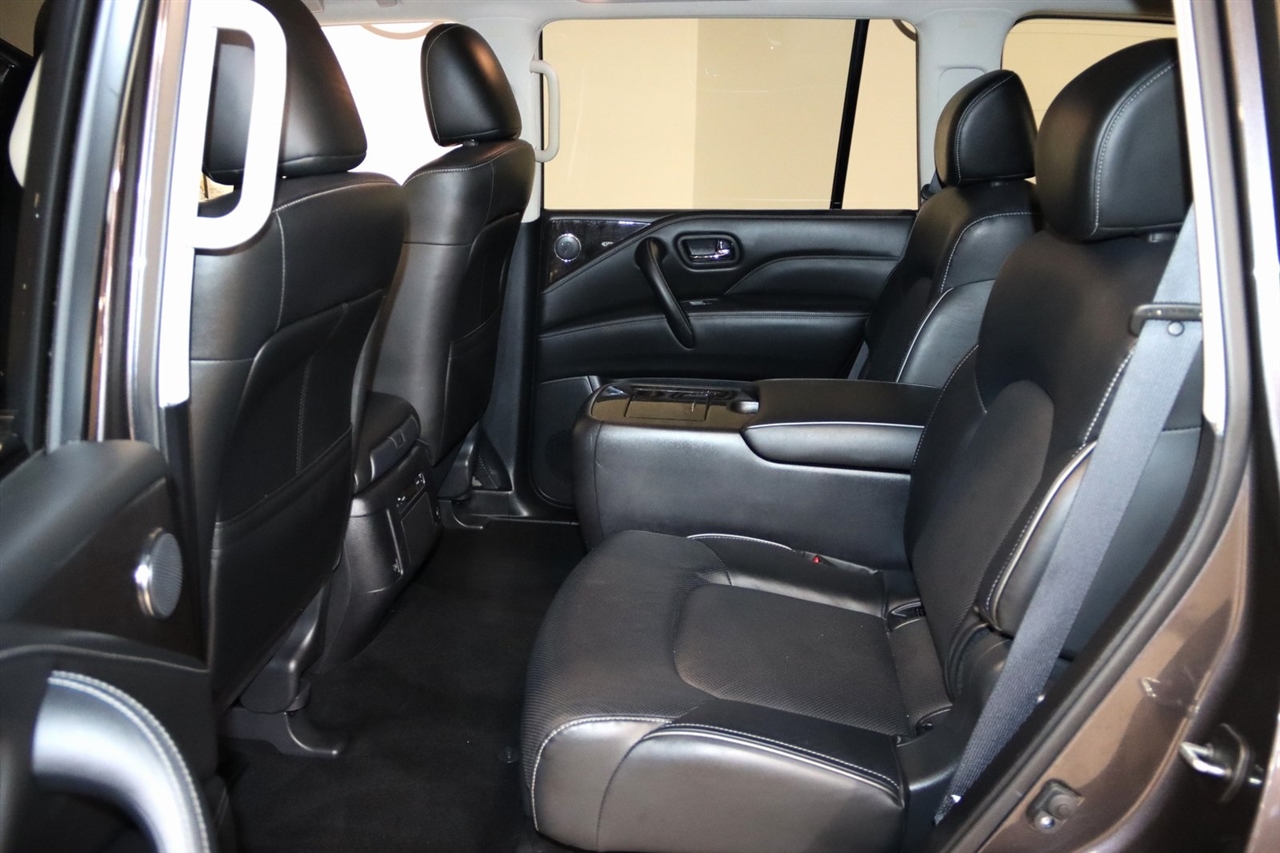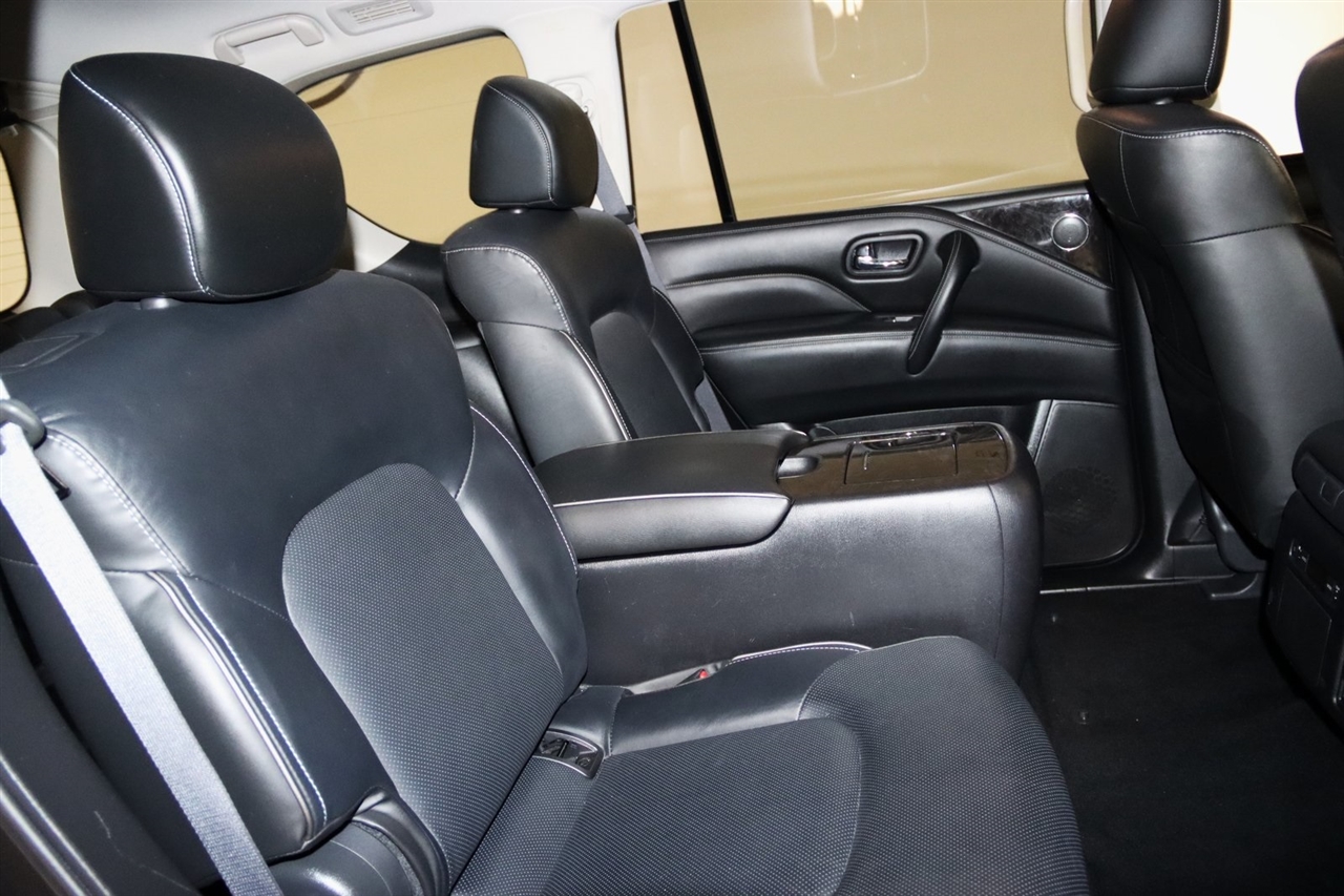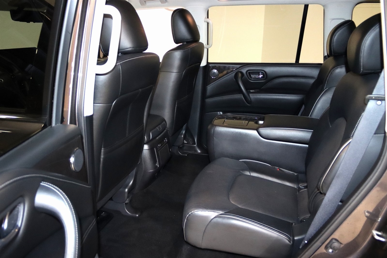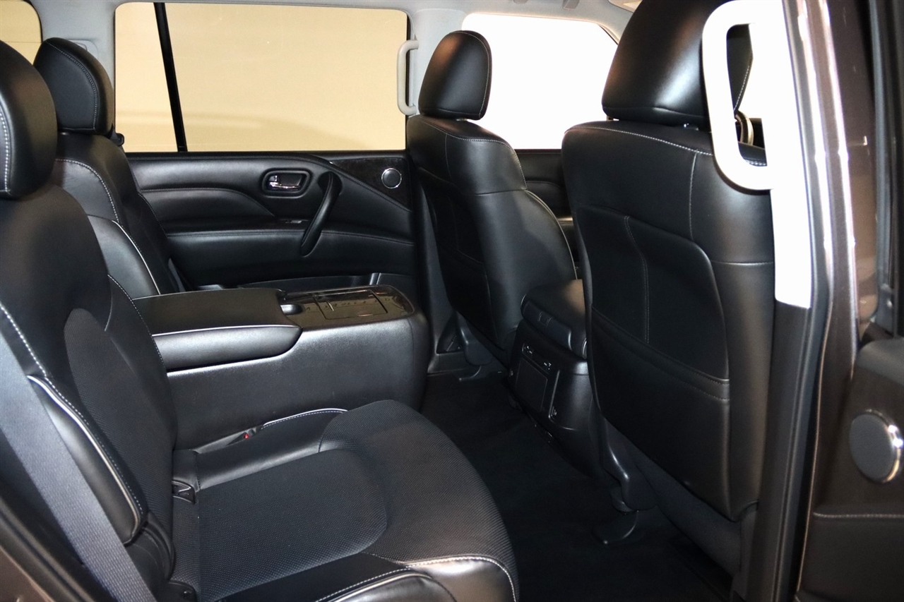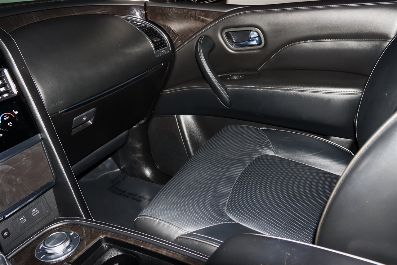 Navigation, Bluetooth, Back Up Camera, Sun/Moon Roof, 3rd Row, Heated Seats, Touch Screen, 13 Speakers, 2.937 Axle Ratio, 20" Aluminum Alloy Wheels, 3rd row seats: bench, 4-Wheel Disc Brakes, ABS brakes, Air Conditioning, Alloy wheels, AM/FM radio: SiriusXM, Anti-whiplash front head restraints, Apple CarPlay/Android Auto, Auto High-beam Headlights, Auto tilt-away steering wheel, Auto-dimming door mirrors, Auto-dimming Rear-View mirror, Auto-leveling suspension, Automatic temperature control, Brake assist, Bumpers: body-color, Compass, Delay-off headlights, Driver door bin, Driver vanity mirror, Dual front impact airbags, Dual front side impact airbags, Electronic Stability Control, Emergency communication system: INFINITI InTouch, Four wheel independent suspension, Front anti-roll bar, Front Bucket Seats, Front Center Armrest, Front dual zone A/C, Front fog lights, Front reading lights, Fully automatic headlights, Garage door transmitter: HomeLink, Heated door mirrors, Heated Front Bucket Seats, Heated front seats, Heated steering wheel, Illuminated entry, Leather Shift Knob, Leather steering wheel, Leather-Appointed Seats, Low tire pressure warning, Memory seat, Navigation System, Navigation system: INFINITI InTouch Navigation, Occupant sensing airbag, Outside temperature display, Overhead airbag, Overhead console, Panic alarm, Passenger door bin, Passenger vanity mirror, Power door mirrors, Power driver seat, Power Liftgate, Power moonroof, Power passenger seat, Power steering, Power windows, Radio data system, Radio: Bose Premium Audio System w/13 Speakers, Rain sensing wipers, Rear air conditioning, Rear anti-roll bar, Rear reading lights, Rear seat center armrest, Rear window defroster, Rear window wiper, Reclining 3rd row seat, Remote keyless entry, Security system, Speed control, Speed-sensing steering, Split folding rear seat, Spoiler, Steering wheel memory, Steering wheel mounted audio controls, Tachometer, Telescoping steering wheel, Tilt steering wheel, Traction control, Trip computer, Turn signal indicator mirrors, Variably intermittent wipers, Voltmeter. CARFAX One-Owner. Odometer is 9338 miles below market average! Priced below KBB Fair Purchase Price!