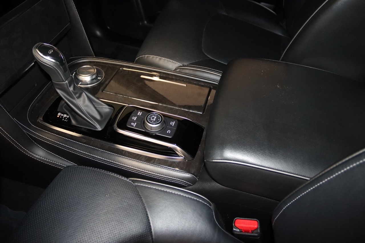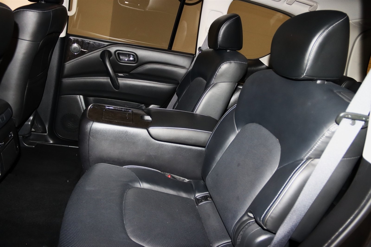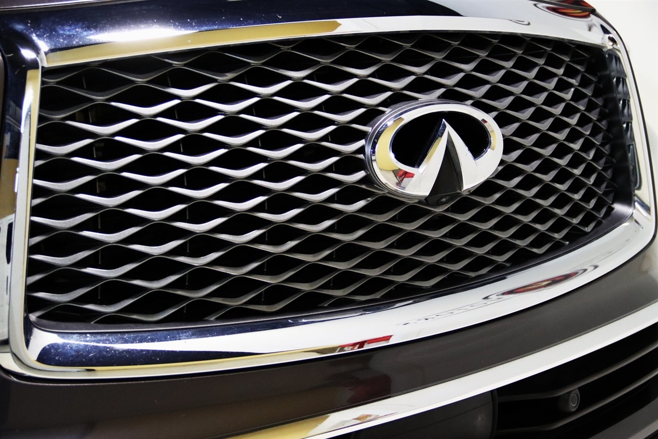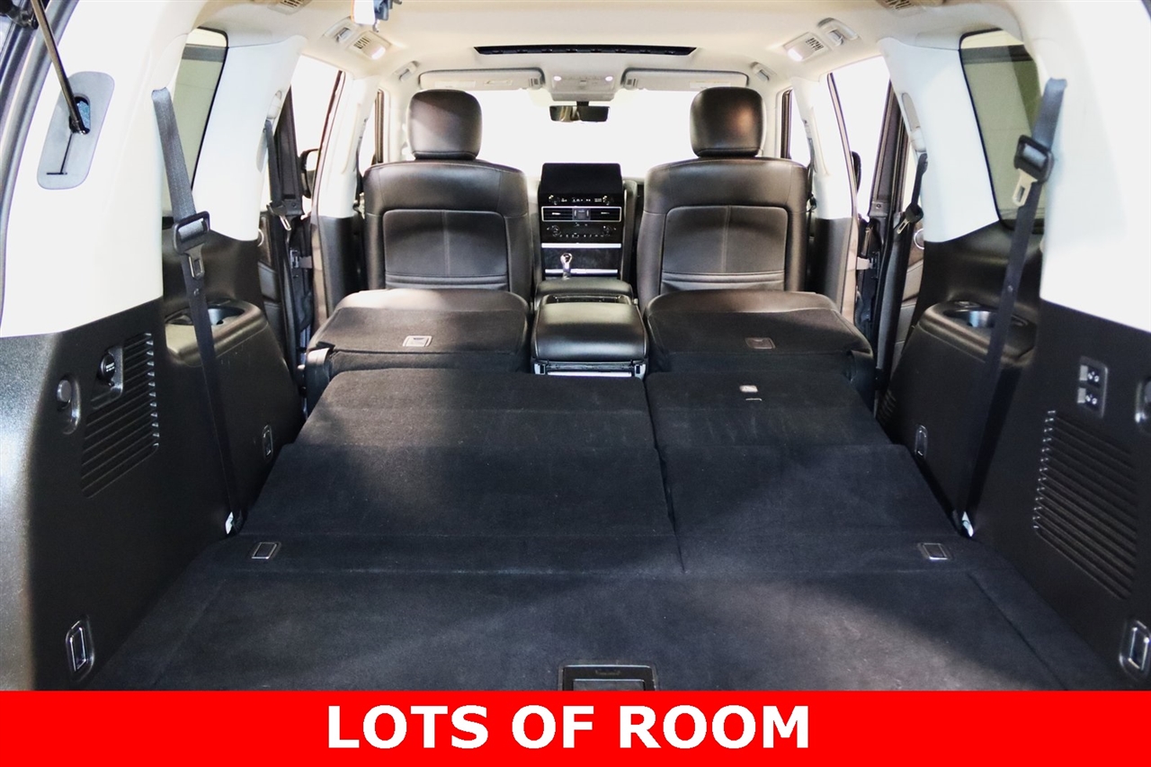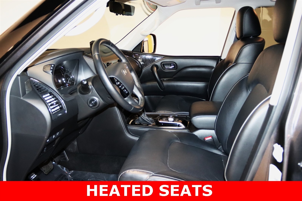 Navigation, Bluetooth, Back Up Camera, Sun/Moon Roof, 3rd Row, Heated Seats, Touch Screen, 13 Speakers, 2.937 Axle Ratio, 20" Aluminum Alloy Wheels, 3rd row seats: bench, 4-Wheel Disc Brakes, ABS brakes, Air Conditioning, Alloy wheels, AM/FM radio: SiriusXM, Anti-whiplash front head restraints, Apple CarPlay/Android Auto, Auto High-beam Headlights, Auto tilt-away steering wheel, Auto-dimming door mirrors, Auto-dimming Rear-View mirror, Auto-leveling suspension, Automatic temperature control, Brake assist, Bumpers: body-color, Compass, Delay-off headlights, Driver door bin, Driver vanity mirror, Dual front impact airbags, Dual front side impact airbags, Electronic Stability Control, Emergency communication system: INFINITI InTouch, Four wheel independent suspension, Front anti-roll bar, Front Bucket Seats, Front Center Armrest, Front dual zone A/C, Front fog lights, Front reading lights, Fully automatic headlights, Garage door transmitter: HomeLink, Heated door mirrors, Heated Front Bucket Seats, Heated front seats, Heated steering wheel, Illuminated entry, Leather Shift Knob, Leather steering wheel, Leather-Appointed Seats, Low tire pressure warning, Memory seat, Navigation System, Navigation system: INFINITI InTouch Navigation, Occupant sensing airbag, Outside temperature display, Overhead airbag, Overhead console, Panic alarm, Passenger door bin, Passenger vanity mirror, Power door mirrors, Power driver seat, Power Liftgate, Power moonroof, Power passenger seat, Power steering, Power windows, Radio data system, Radio: Bose Premium Audio System w/13 Speakers, Rain sensing wipers, Rear air conditioning, Rear anti-roll bar, Rear reading lights, Rear seat center armrest, Rear window defroster, Rear window wiper, Reclining 3rd row seat, Remote keyless entry, Security system, Speed control, Speed-sensing steering, Split folding rear seat, Spoiler, Steering wheel memory, Steering wheel mounted audio controls, Tachometer, Telescoping steering wheel, Tilt steering wheel, Traction control, Trip computer, Turn signal indicator mirrors, Variably intermittent wipers, Voltmeter. CARFAX One-Owner. Odometer is 9338 miles below market average! Priced below KBB Fair Purchase Price!