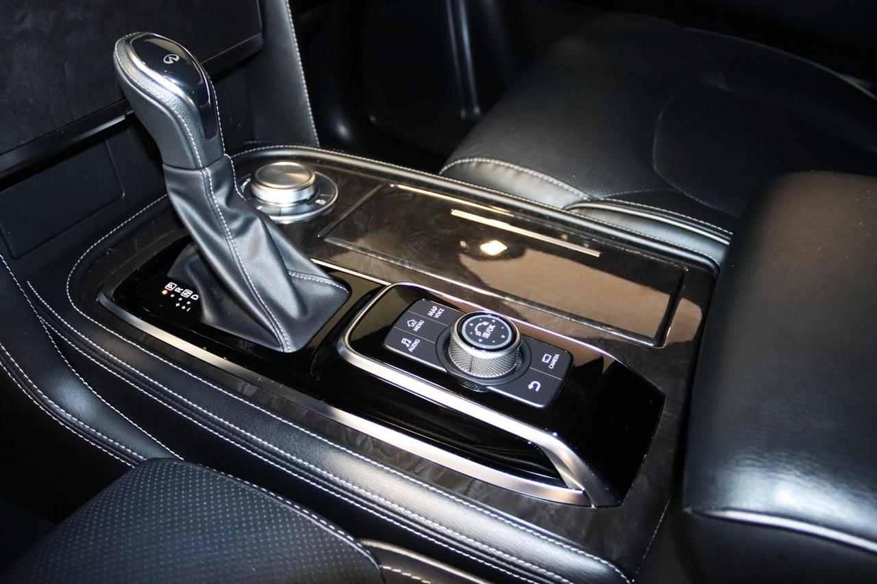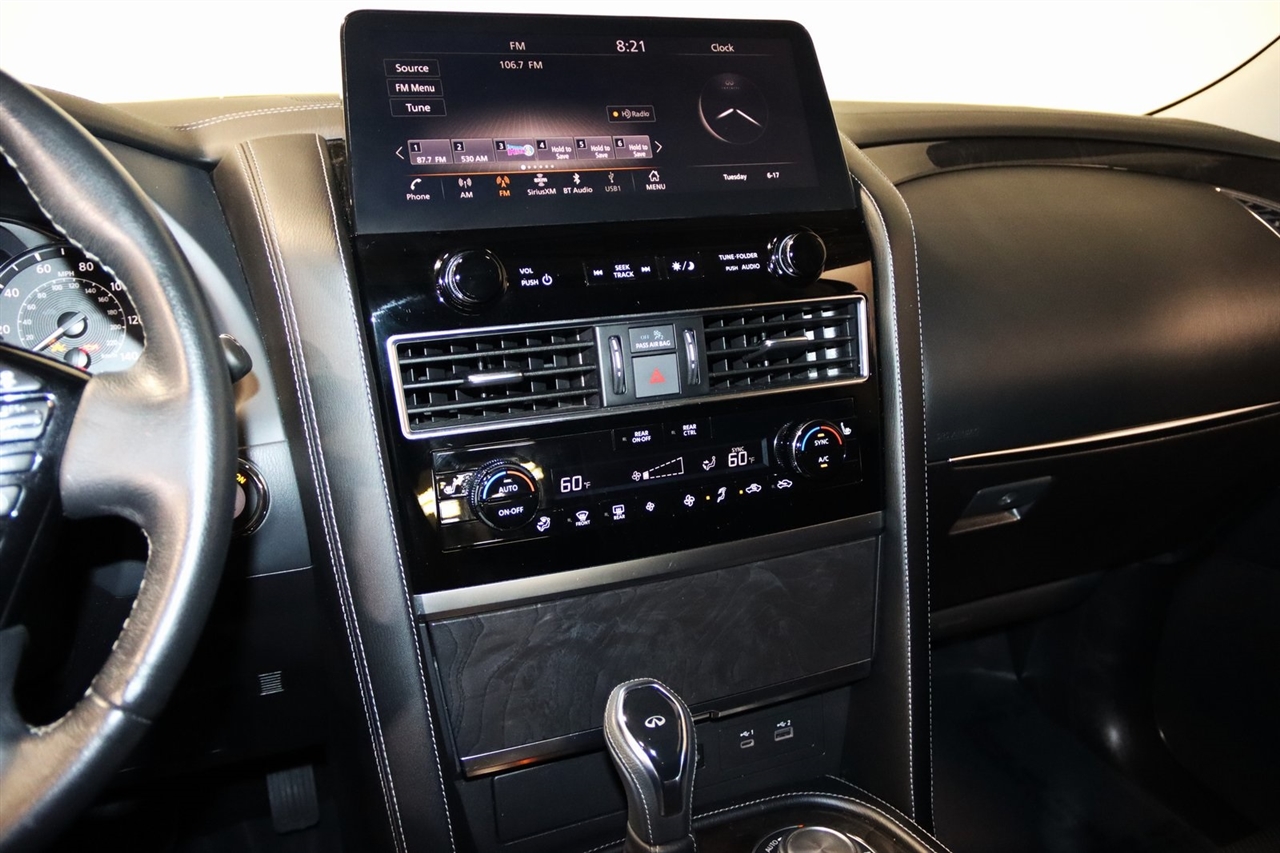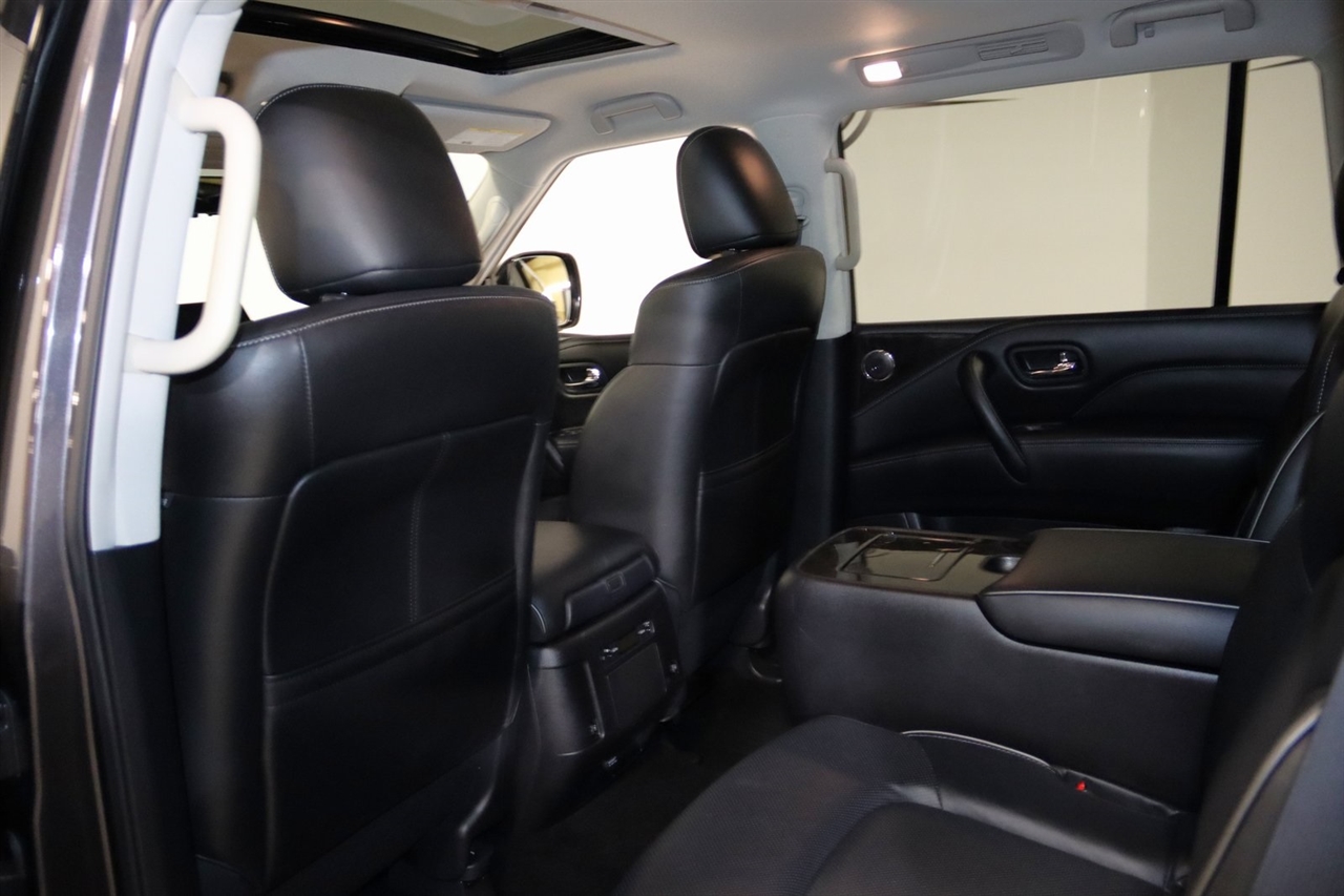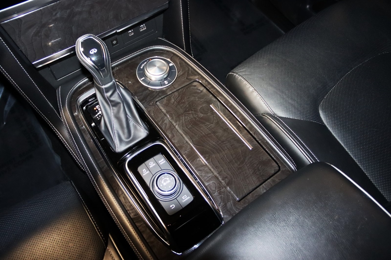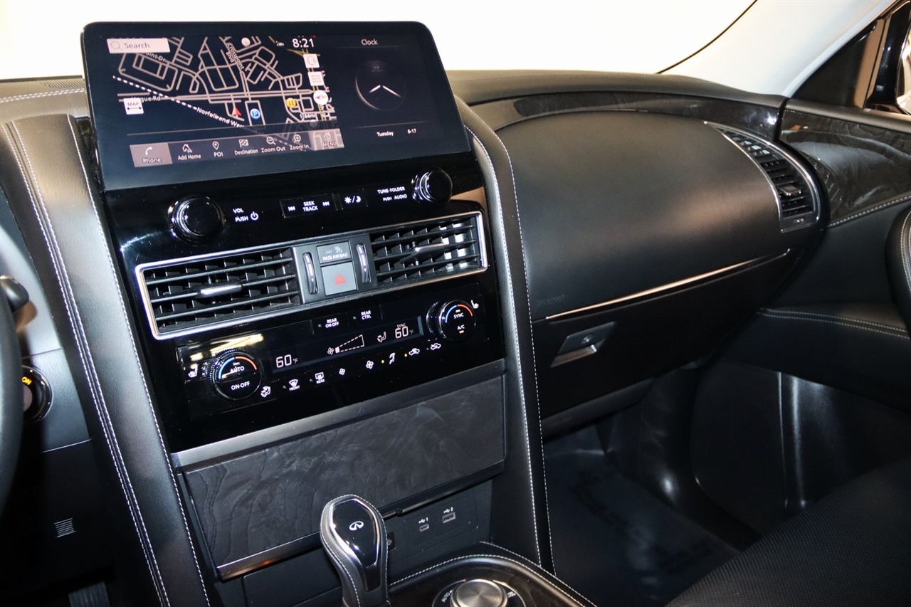 Navigation, Bluetooth, Back Up Camera, Sun/Moon Roof, 3rd Row, Heated Seats, Touch Screen, 13 Speakers, 2.937 Axle Ratio, 20" Aluminum Alloy Wheels, 3rd row seats: bench, 4-Wheel Disc Brakes, ABS brakes, Air Conditioning, Alloy wheels, AM/FM radio: SiriusXM, Anti-whiplash front head restraints, Apple CarPlay/Android Auto, Auto High-beam Headlights, Auto tilt-away steering wheel, Auto-dimming door mirrors, Auto-dimming Rear-View mirror, Auto-leveling suspension, Automatic temperature control, Brake assist, Bumpers: body-color, Compass, Delay-off headlights, Driver door bin, Driver vanity mirror, Dual front impact airbags, Dual front side impact airbags, Electronic Stability Control, Emergency communication system: INFINITI InTouch, Four wheel independent suspension, Front anti-roll bar, Front Bucket Seats, Front Center Armrest, Front dual zone A/C, Front fog lights, Front reading lights, Fully automatic headlights, Garage door transmitter: HomeLink, Heated door mirrors, Heated Front Bucket Seats, Heated front seats, Heated steering wheel, Illuminated entry, Leather Shift Knob, Leather steering wheel, Leather-Appointed Seats, Low tire pressure warning, Memory seat, Navigation System, Navigation system: INFINITI InTouch Navigation, Occupant sensing airbag, Outside temperature display, Overhead airbag, Overhead console, Panic alarm, Passenger door bin, Passenger vanity mirror, Power door mirrors, Power driver seat, Power Liftgate, Power moonroof, Power passenger seat, Power steering, Power windows, Radio data system, Radio: Bose Premium Audio System w/13 Speakers, Rain sensing wipers, Rear air conditioning, Rear anti-roll bar, Rear reading lights, Rear seat center armrest, Rear window defroster, Rear window wiper, Reclining 3rd row seat, Remote keyless entry, Security system, Speed control, Speed-sensing steering, Split folding rear seat, Spoiler, Steering wheel memory, Steering wheel mounted audio controls, Tachometer, Telescoping steering wheel, Tilt steering wheel, Traction control, Trip computer, Turn signal indicator mirrors, Variably intermittent wipers, Voltmeter. CARFAX One-Owner. Odometer is 9338 miles below market average! Priced below KBB Fair Purchase Price!