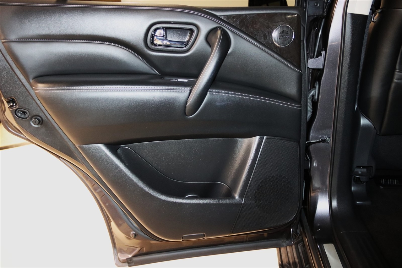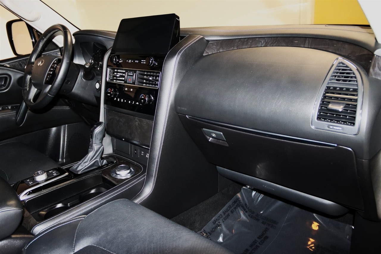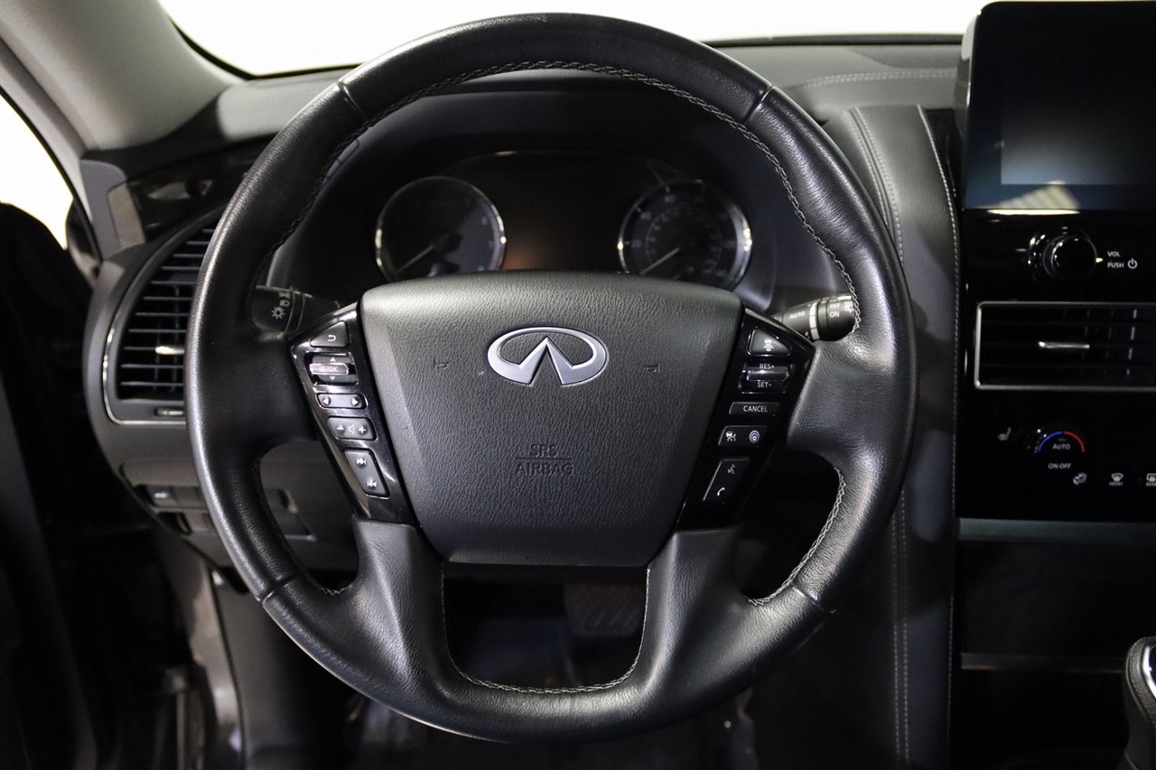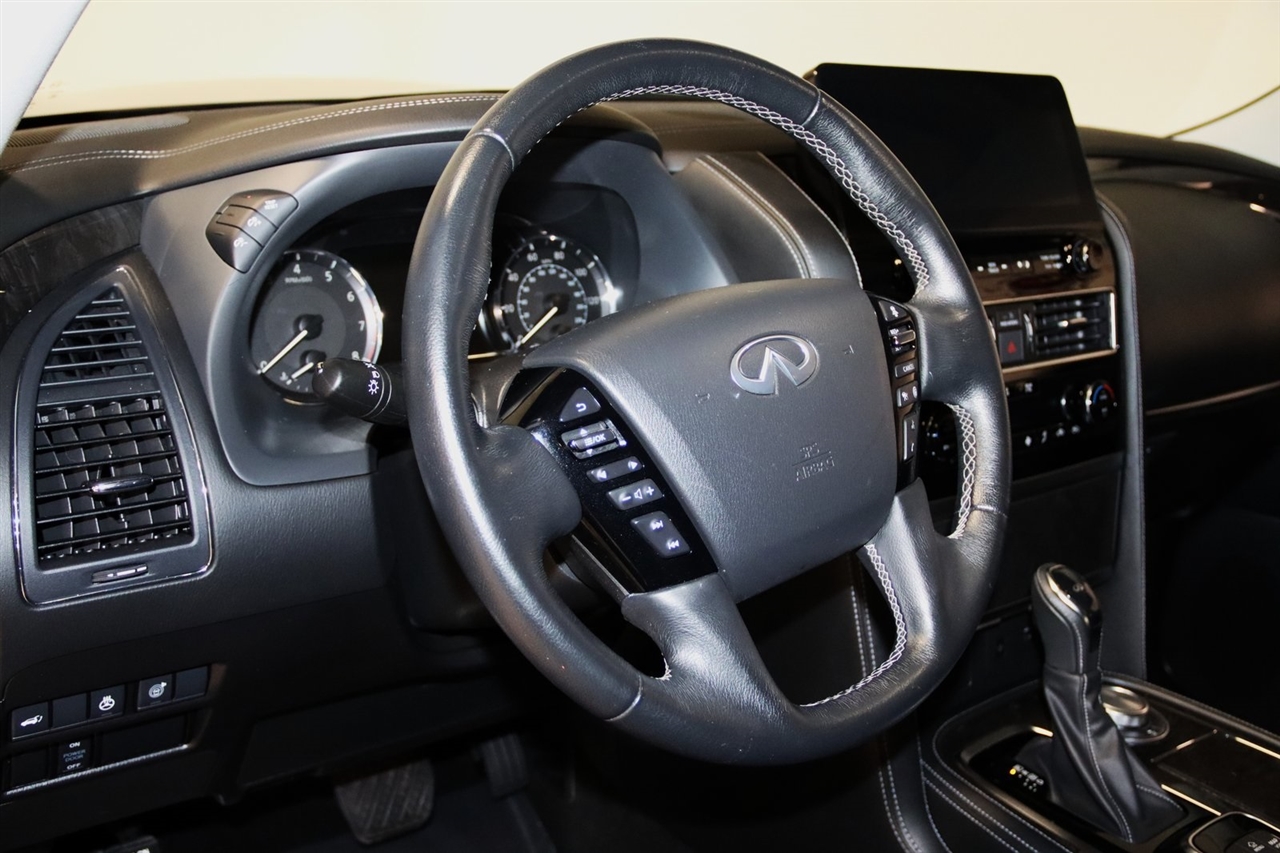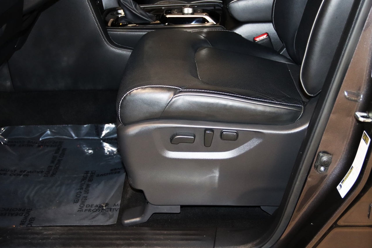 Navigation, Bluetooth, Back Up Camera, Sun/Moon Roof, 3rd Row, Heated Seats, Touch Screen, 13 Speakers, 2.937 Axle Ratio, 20" Aluminum Alloy Wheels, 3rd row seats: bench, 4-Wheel Disc Brakes, ABS brakes, Air Conditioning, Alloy wheels, AM/FM radio: SiriusXM, Anti-whiplash front head restraints, Apple CarPlay/Android Auto, Auto High-beam Headlights, Auto tilt-away steering wheel, Auto-dimming door mirrors, Auto-dimming Rear-View mirror, Auto-leveling suspension, Automatic temperature control, Brake assist, Bumpers: body-color, Compass, Delay-off headlights, Driver door bin, Driver vanity mirror, Dual front impact airbags, Dual front side impact airbags, Electronic Stability Control, Emergency communication system: INFINITI InTouch, Four wheel independent suspension, Front anti-roll bar, Front Bucket Seats, Front Center Armrest, Front dual zone A/C, Front fog lights, Front reading lights, Fully automatic headlights, Garage door transmitter: HomeLink, Heated door mirrors, Heated Front Bucket Seats, Heated front seats, Heated steering wheel, Illuminated entry, Leather Shift Knob, Leather steering wheel, Leather-Appointed Seats, Low tire pressure warning, Memory seat, Navigation System, Navigation system: INFINITI InTouch Navigation, Occupant sensing airbag, Outside temperature display, Overhead airbag, Overhead console, Panic alarm, Passenger door bin, Passenger vanity mirror, Power door mirrors, Power driver seat, Power Liftgate, Power moonroof, Power passenger seat, Power steering, Power windows, Radio data system, Radio: Bose Premium Audio System w/13 Speakers, Rain sensing wipers, Rear air conditioning, Rear anti-roll bar, Rear reading lights, Rear seat center armrest, Rear window defroster, Rear window wiper, Reclining 3rd row seat, Remote keyless entry, Security system, Speed control, Speed-sensing steering, Split folding rear seat, Spoiler, Steering wheel memory, Steering wheel mounted audio controls, Tachometer, Telescoping steering wheel, Tilt steering wheel, Traction control, Trip computer, Turn signal indicator mirrors, Variably intermittent wipers, Voltmeter. CARFAX One-Owner. Odometer is 9338 miles below market average! Priced below KBB Fair Purchase Price!