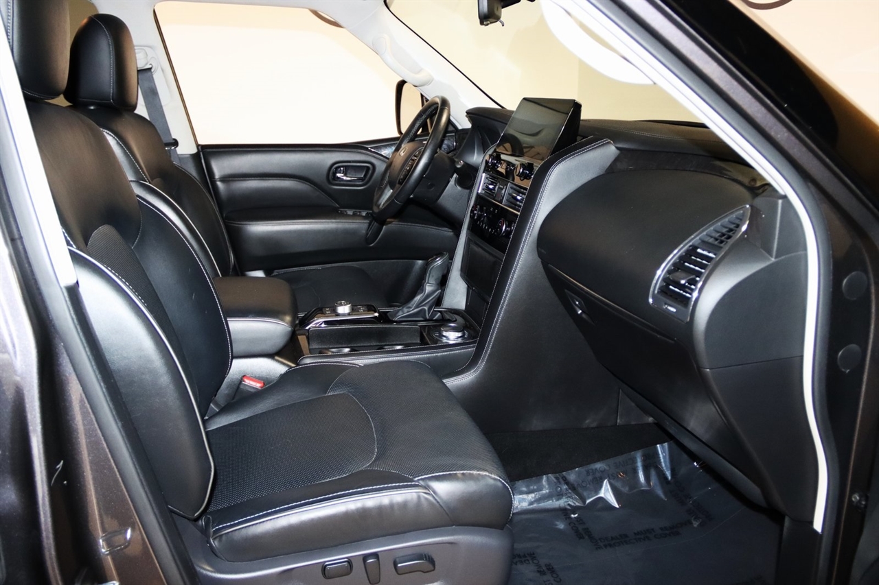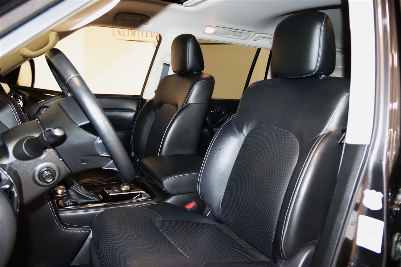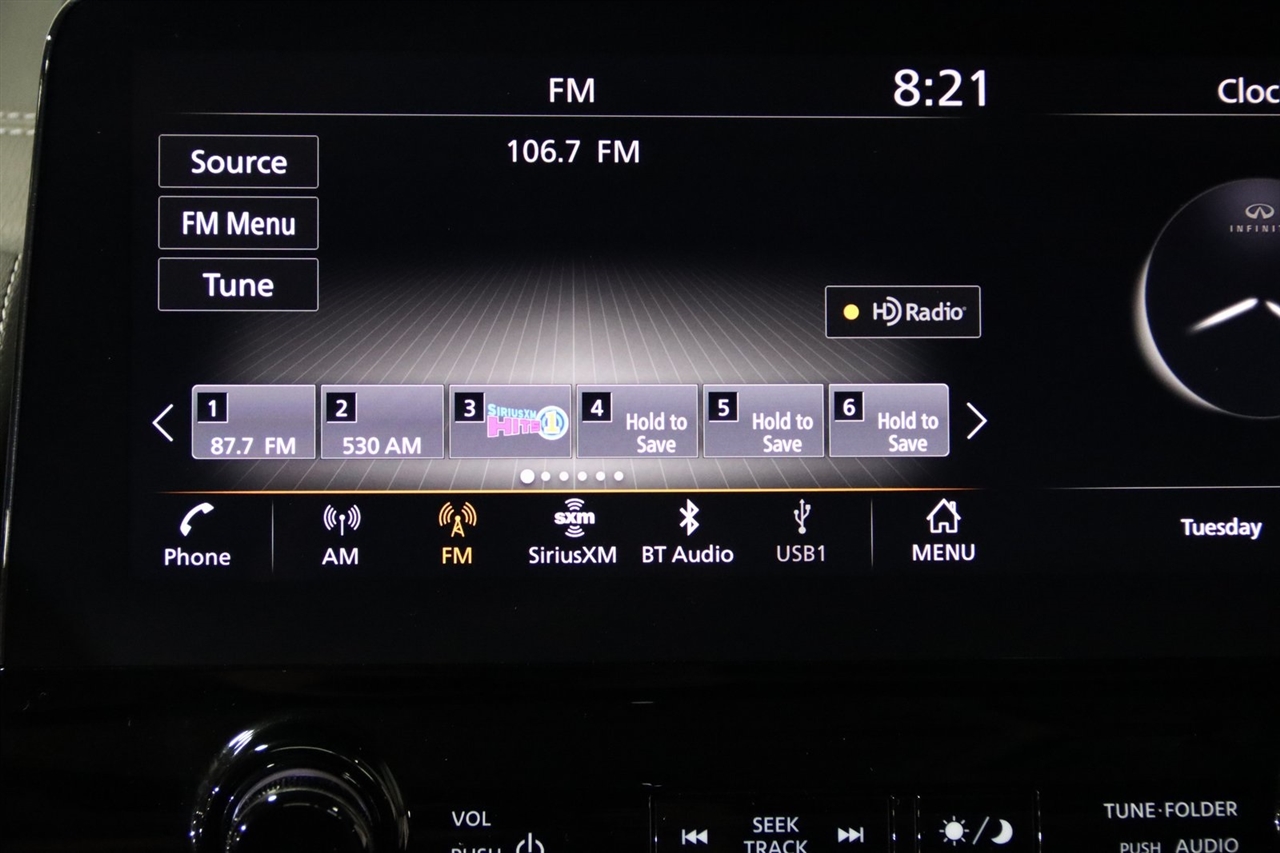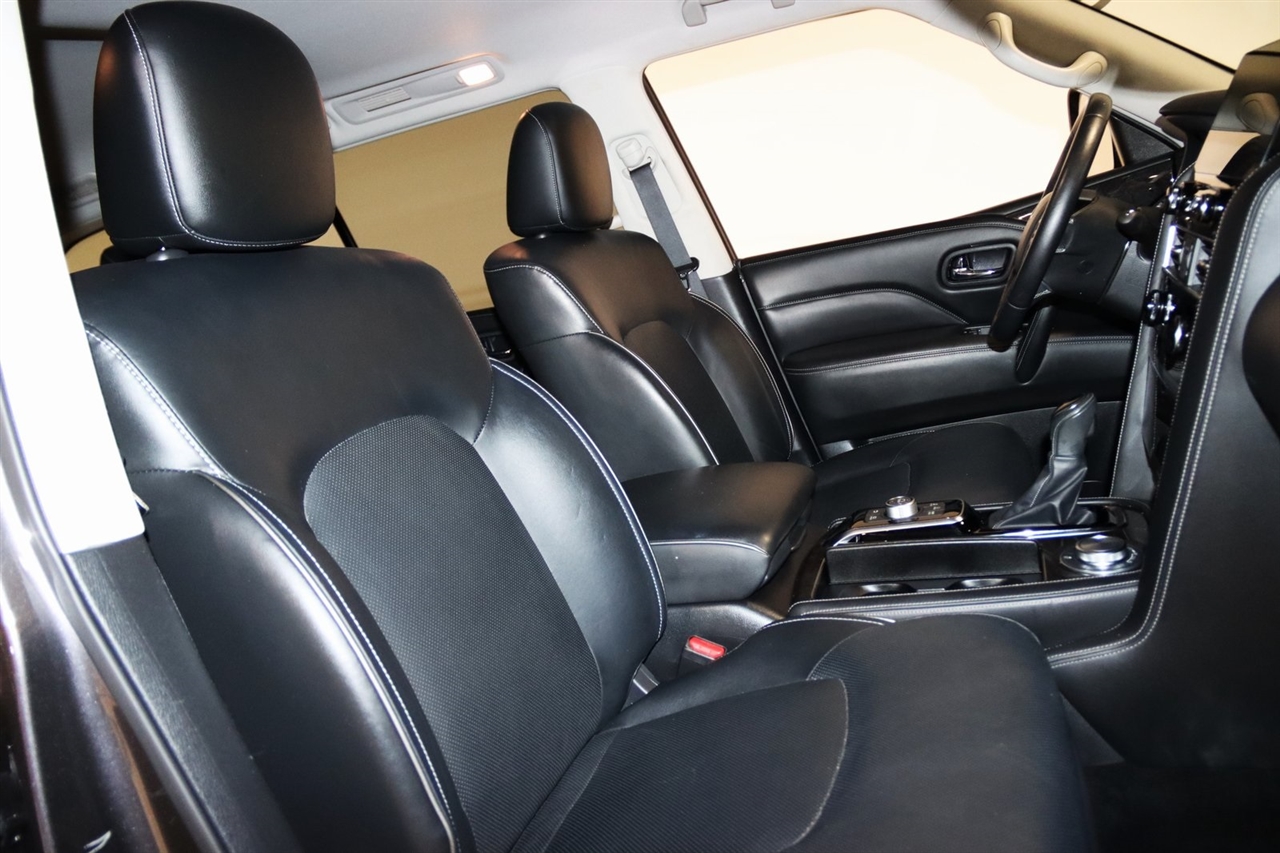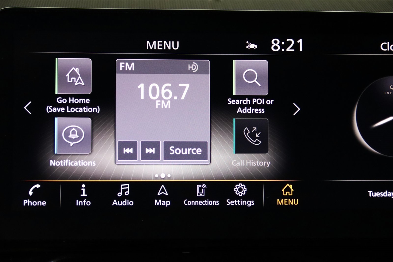 Navigation, Bluetooth, Back Up Camera, Sun/Moon Roof, 3rd Row, Heated Seats, Touch Screen, 13 Speakers, 2.937 Axle Ratio, 20" Aluminum Alloy Wheels, 3rd row seats: bench, 4-Wheel Disc Brakes, ABS brakes, Air Conditioning, Alloy wheels, AM/FM radio: SiriusXM, Anti-whiplash front head restraints, Apple CarPlay/Android Auto, Auto High-beam Headlights, Auto tilt-away steering wheel, Auto-dimming door mirrors, Auto-dimming Rear-View mirror, Auto-leveling suspension, Automatic temperature control, Brake assist, Bumpers: body-color, Compass, Delay-off headlights, Driver door bin, Driver vanity mirror, Dual front impact airbags, Dual front side impact airbags, Electronic Stability Control, Emergency communication system: INFINITI InTouch, Four wheel independent suspension, Front anti-roll bar, Front Bucket Seats, Front Center Armrest, Front dual zone A/C, Front fog lights, Front reading lights, Fully automatic headlights, Garage door transmitter: HomeLink, Heated door mirrors, Heated Front Bucket Seats, Heated front seats, Heated steering wheel, Illuminated entry, Leather Shift Knob, Leather steering wheel, Leather-Appointed Seats, Low tire pressure warning, Memory seat, Navigation System, Navigation system: INFINITI InTouch Navigation, Occupant sensing airbag, Outside temperature display, Overhead airbag, Overhead console, Panic alarm, Passenger door bin, Passenger vanity mirror, Power door mirrors, Power driver seat, Power Liftgate, Power moonroof, Power passenger seat, Power steering, Power windows, Radio data system, Radio: Bose Premium Audio System w/13 Speakers, Rain sensing wipers, Rear air conditioning, Rear anti-roll bar, Rear reading lights, Rear seat center armrest, Rear window defroster, Rear window wiper, Reclining 3rd row seat, Remote keyless entry, Security system, Speed control, Speed-sensing steering, Split folding rear seat, Spoiler, Steering wheel memory, Steering wheel mounted audio controls, Tachometer, Telescoping steering wheel, Tilt steering wheel, Traction control, Trip computer, Turn signal indicator mirrors, Variably intermittent wipers, Voltmeter. CARFAX One-Owner. Odometer is 9338 miles below market average! Priced below KBB Fair Purchase Price!