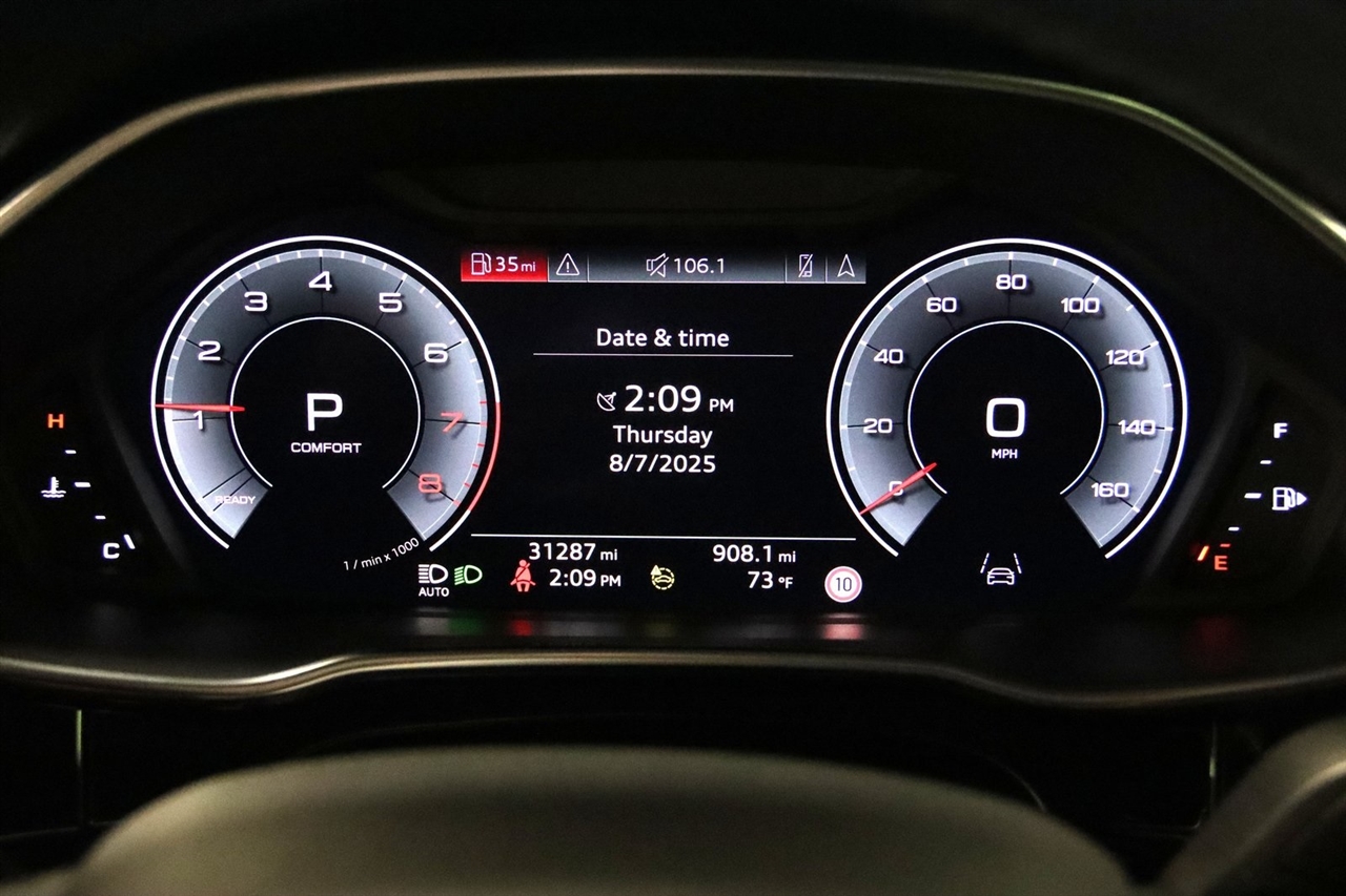 Navigation, Bluetooth, Back Up Camera, Panoramic Roof, Heated Seats, Touch Screen, 10 Speakers, 12.3" Audi Virtual Cockpit Screen, 19" Wheel Black Optic Package, 3.533 Axle Ratio, 4-Wheel Disc Brakes, ABS brakes, Adaptive Cruise Assist w/Traffic Jam Assist, Air Conditioning, Aluminum Spectrum Inlays, AM/FM radio, Audi Connect PRIME & PLUS, Audi Phone Box w/Wireless Charging, Audi smartphone interface (Apple CarPlay/Android Auto), Auto High-beam Headlights, Automatic temperature control, Bang & Olufsen 3D Sound System, Black Optic Exterior Kit & Roof Rails, Black Optic Sport Package, Brake assist, Bumpers: body-color, Convenience Package, Customizable LED Interior Lighting Package Plus, Delay-off headlights, Driver door bin, Driver vanity mirror, Dual front impact airbags, Dual front side impact airbags, Electronic Stability Control, Exterior Parking Camera Rear, Four wheel independent suspension, Front anti-roll bar, Front Bucket Seats, Front Center Armrest, Front dual zone A/C, Front fog lights, Front reading lights, Full LED Headlights w/Unique DRL Signature, Fully automatic headlights, Heated door mirrors, Heated Front Bucket Seats, Heated front seats, HomeLink Garage Door Opener, Illuminated entry, Interior Protection Kit, Knee airbag, Leather Seating Surfaces, Leather Shift Knob, Leather steering wheel, Low tire pressure warning, MMI Navigation Plus, MMI Touch Response, Navigation System, Occupant sensing airbag, Outside temperature display, Overhead airbag, Overhead console, Panic alarm, Passenger door bin, Passenger vanity mirror, Power door mirrors, Power driver seat, Power Liftgate, Power moonroof, Power passenger seat, Power steering, Power windows, Premium Plus Package, Radio data system, Radio: Audi Sound System, Rain sensing wipers, Rear air conditioning, Rear anti-roll bar, Rear fog lights, Rear reading lights, Rear seat center armrest, Rear window defroster, Rear window wiper, Remote keyless entry, S Line Sport Seats, Speed control, Speed-sensing steering, Split folding rear seat, Spoiler, Stainless Steel Trunk Sill, Steering wheel mounted audio controls, Tachometer, Technology Package, Telescoping steering wheel, Tilt steering wheel, Traction control, Traffic Sign Recognition, Trip computer, Turn signal indicator mirrors, USB Cables, Variably intermittent wipers. CARFAX One-Owner. Clean CARFAX. 20/28 City/Highway MPG Odometer is 19298 miles below market average! Priced below KBB Fair Purchase Price!