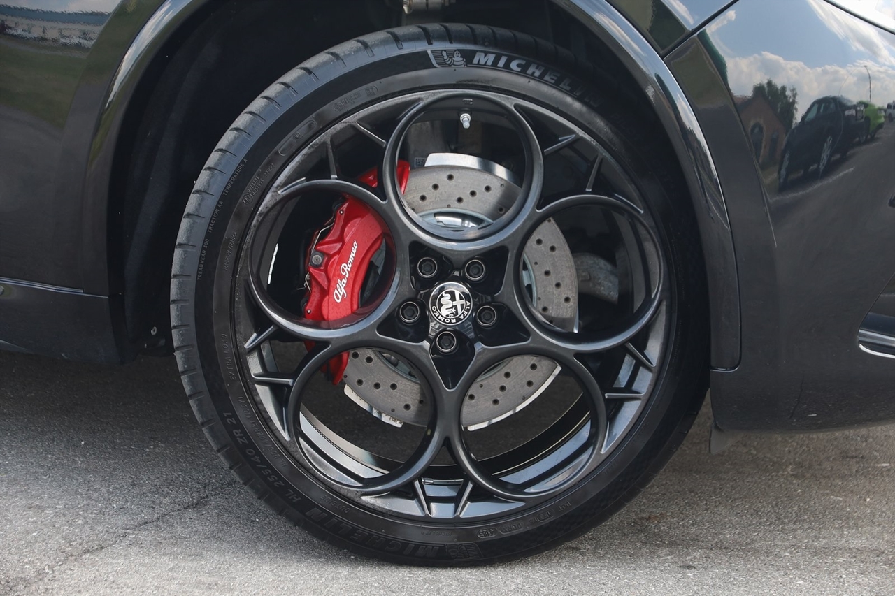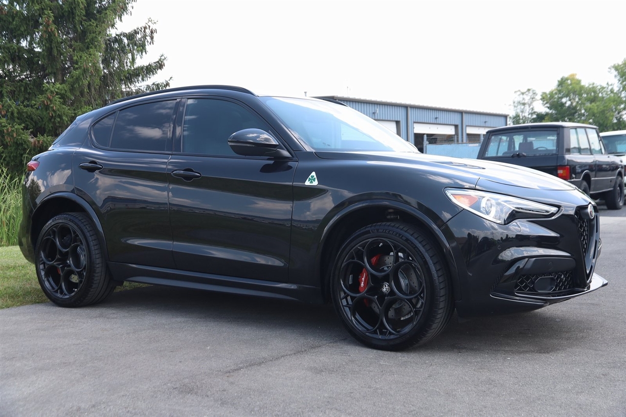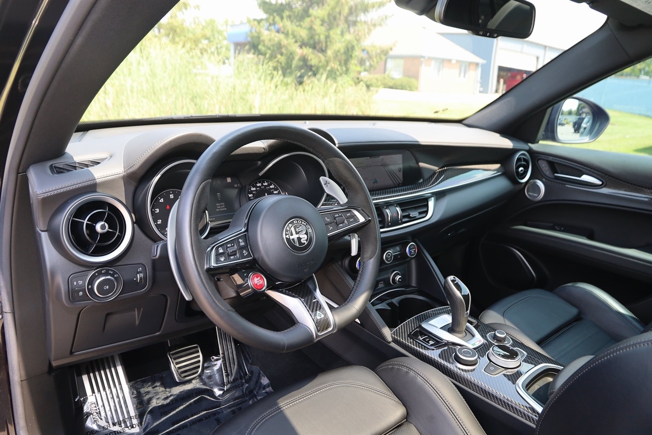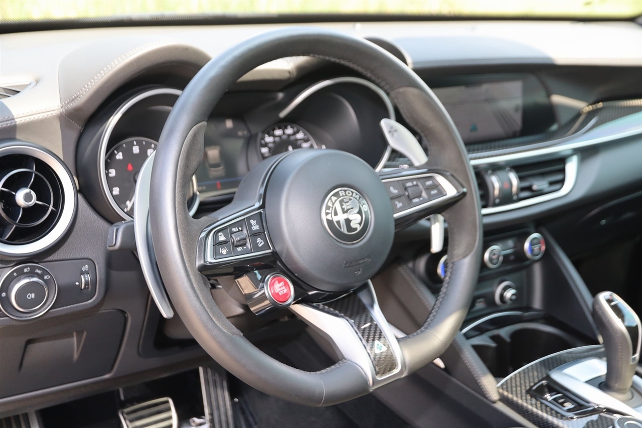 Navigation, Back Up Camera, Bluetooth, Panoramic Roof, Heated Seats, Touch Screen, Heated Steering Wheel, Blind Spot, Stelvio Quadrifoglio, 4D Sport Utility, 2.9L V6, 8-Speed Automatic, AWD, Vulcano Black Metallic, Black Leather, Navigation System.