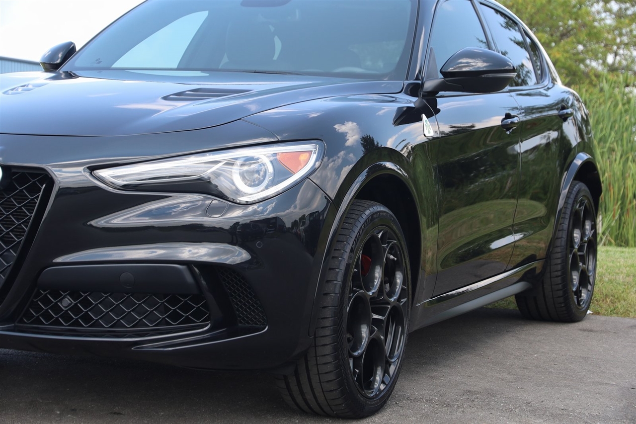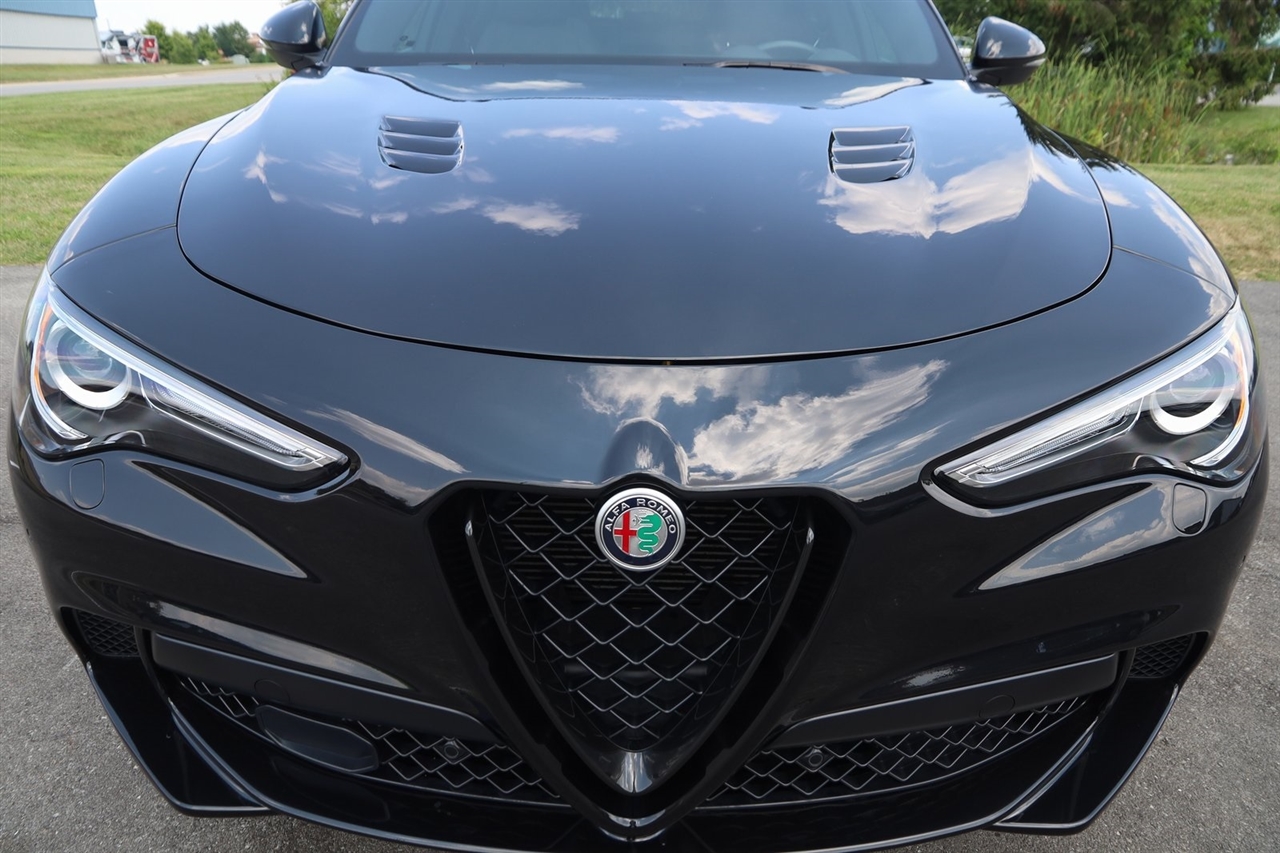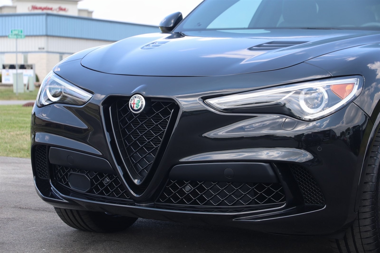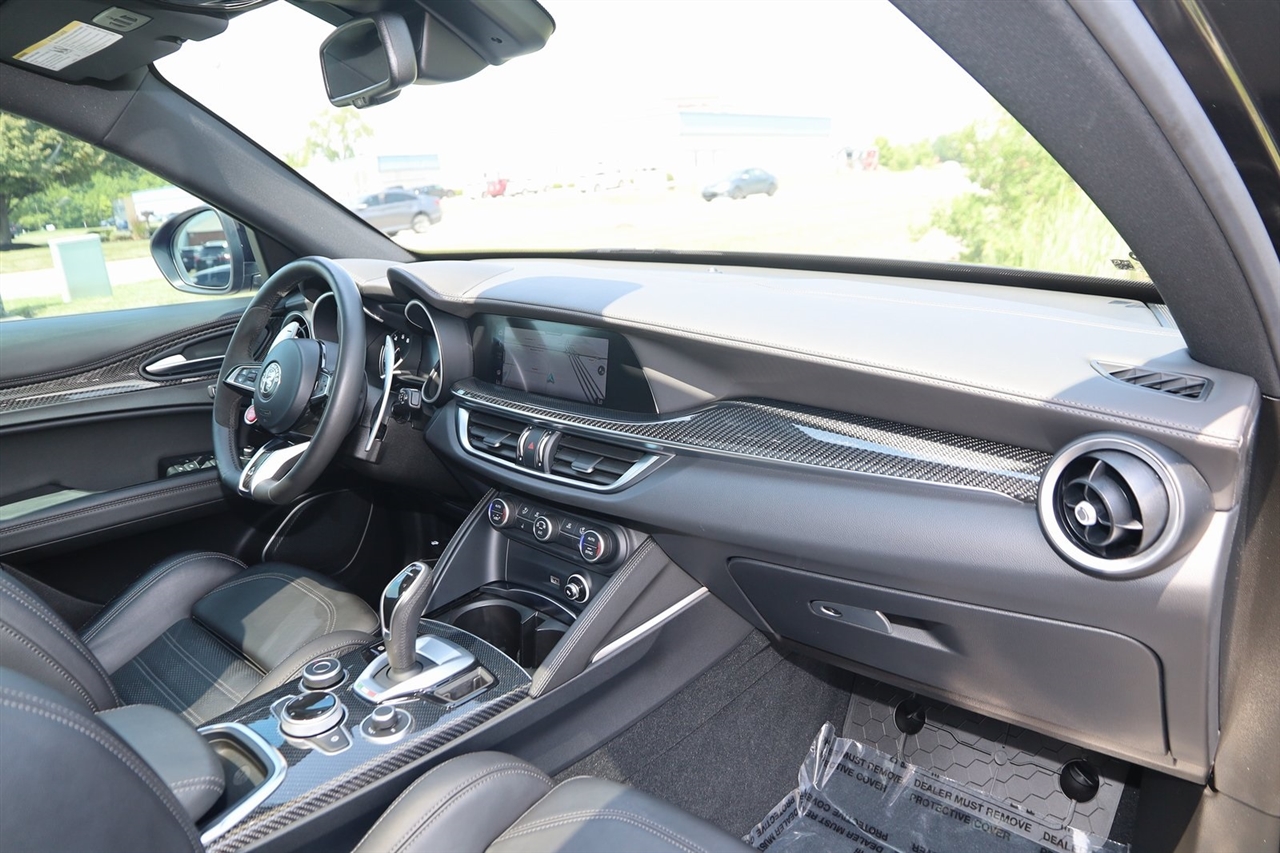 Navigation, Back Up Camera, Bluetooth, Panoramic Roof, Heated Seats, Touch Screen, Heated Steering Wheel, Blind Spot, Stelvio Quadrifoglio, 4D Sport Utility, 2.9L V6, 8-Speed Automatic, AWD, Vulcano Black Metallic, Black Leather, Navigation System.