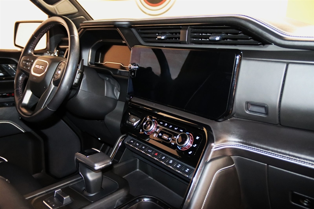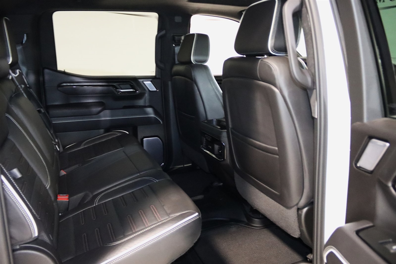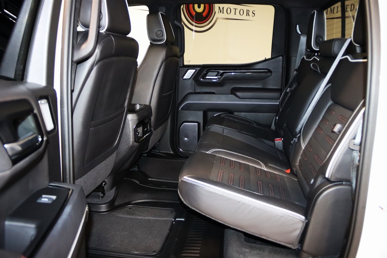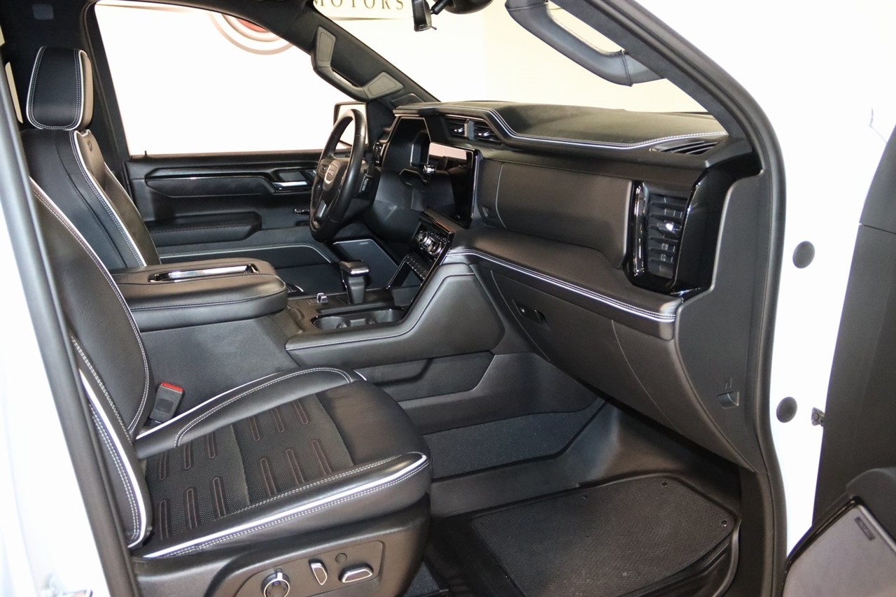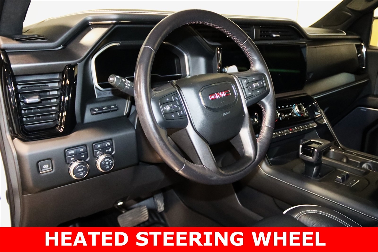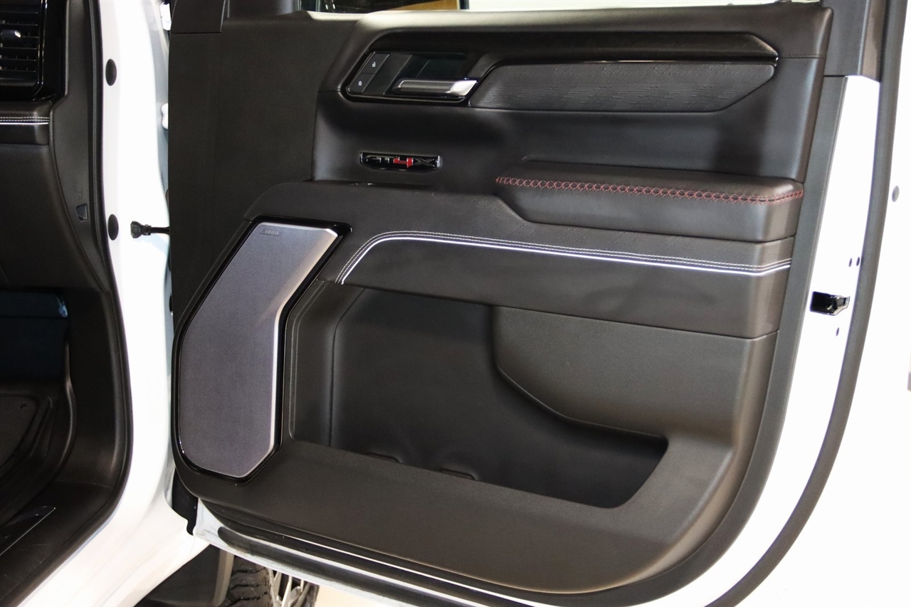 Navigation, Bluetooth, Back Up Camera, Touch Screen, 12 Speakers, 120-Volt Bed Mounted Power Outlet, 120-Volt Instrument Panel Power Outlet, 16-Way Power Driver Seat Adjuster w/Lumbar, 16-Way Power Passenger Seat Adjuster w/Lumbar, 2 Charge/Data USB Ports Inside Center Console, 2 Type-C Charge-Only Rear USB Ports, 2 USB Ports, 3.23 Rear Axle Ratio, 4-Wheel Disc Brakes, ABS brakes, Air Conditioning, Alloy wheels, AM/FM radio: SiriusXM with 360L, Apple CarPlay/Android Auto, Auto High-beam Headlights, Auto-dimming door mirrors, Auto-dimming Rear-View mirror, Automatic Emergency Braking, Automatic temperature control, Bed View Camera, Bose Premium Series w/12-Speaker System, Brake assist, Buckle to Drive, Bumpers: body-color, Color-Keyed Carpeting Floor Covering, Compass, Dark Nickel Header & Grille Insert Bars, Deep-Tinted Glass, Delay-off headlights, Driver door bin, Driver Memory, Driver vanity mirror, Driver-Selectable Full-Locking Front Differential, Driver-Selectable Full-Locking Rear Differential, Dual front impact airbags, Dual front side impact airbags, Electric Rear-Window Defogger, Electrical Steering Column Lock, Electronic Stability Control, Emergency communication system: OnStar and GMC Connected Services capable, Floor-Mounted Center Console, Following Distance Indicator, Forward Collision Alert, Front anti-roll bar, Front Bucket Seats, Front Center Armrest, Front dual zone A/C, Front fog lights, Front License Plate Kit, Front Pedestrian Braking, Front Prem Floor Liners w/Removable Carpet Insert, Front Rainsensing Wipers, Front reading lights, Front wheel independent suspension, Full Grain Leather Seat Trim, Fully automatic headlights, Garage door transmitter, Genuine wood dashboard insert, Genuine wood door panel insert, GMC Connected Access Capable, HD Surround Vision, Heads-Up Display, Heated 2nd Row Outboard Seats, Heated door mirrors, Heated Driver & Front Outboard Passenger Seating, Heated front seats, Heated rear seats, Heated steering wheel, Heavy-Duty Air Filter, Hill Descent Control, Hitch Guidance, Hitch Guidance w/Hitch View, Illuminated entry, In-Vehicle Trailering App, Integrated Trailer Brake Controller, IntelliBeam Automatic High Beam On/Off, Keyless Open & Start, Lane Keep Assist w/Lane Departure Warning, LED Cargo Area Lighting, Low tire pressure warning, Memory seat, Multicolor 15" Diagonal Head-Up Display, MultiPro Audio System by Kicker (LPO), Navigation System, Not Equipped w/Steering Column Lock, Occupant sensing airbag, Off-Road Suspension, OnStar & GMC Connected Services Capable, Outside temperature display, Overhead airbag, Overhead console, Panic alarm, Passenger door bin, Passenger vanity mirror, Perimeter Lighting, Power Door Locks, Power door mirrors, Power driver seat, Power Front Passenger Windows w/Express Up/Down, Power Front Windows w/Driver Express Up/Down, Power moonroof, Power passenger seat, Power Rake & Telescoping Steering Column, Power Rear Windows w/Express Down, Power Sliding Rear Window w/Rear Defogger, Power steering, Power Sunroof, Power windows, Preferred Equipment Group 4SG, Premium audio system: GMC Infotainment System, Push Button Start, Radio data system, Radio: Premium GMC Infotainment Audio System, Rain sensing wipers, Rear Cross Traffic Braking, Rear Pedestrian Detection, Rear Prem Floor Liners w/Removable Carpet Insert, Rear reading lights, Rear seat center armrest, Rear step bumper, Rear Wheelhouse Liners, Rear window defroster, Red Recovery Hooks, Remote keyless entry, Remote Vehicle Starter System, Safety Alert Seat, Security system, SiriusXM w/360L, Speed control, Speed-sensing steering, Split folding rear seat, Spray-On Pickup Bed Liner w/AT4X Logo, Steering Wheel Audio Controls, Steering wheel mounted audio controls, Tachometer, Telescoping steering wheel, Theft Deterrent System (Unauthorized Entry), Tilt steering wheel, Traction control, Trailer Camera Provisions, Trailer Side Blind Zone Alert, Trailer Tire Pressure Monitor System, Trailering Package, Tr