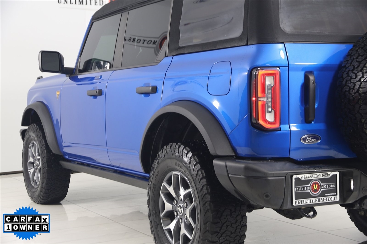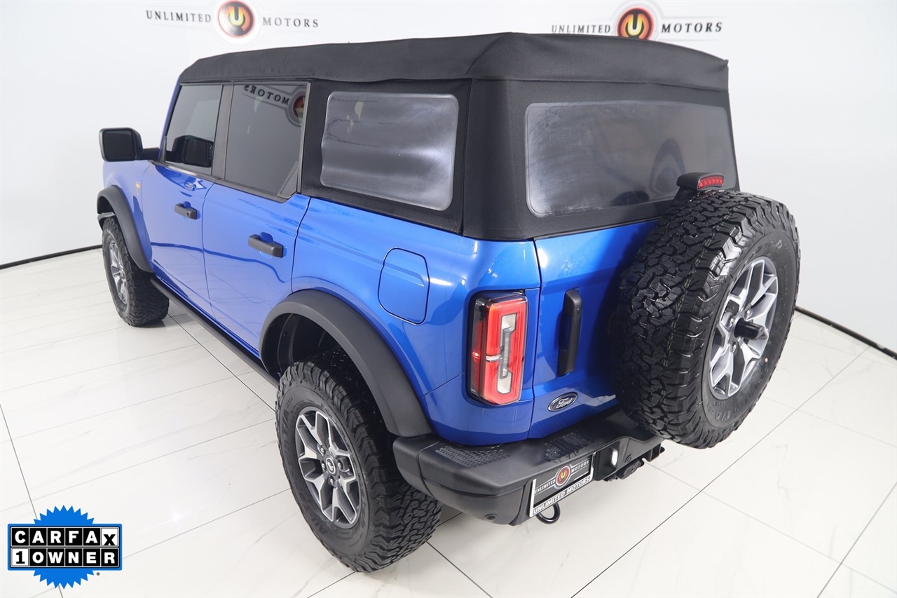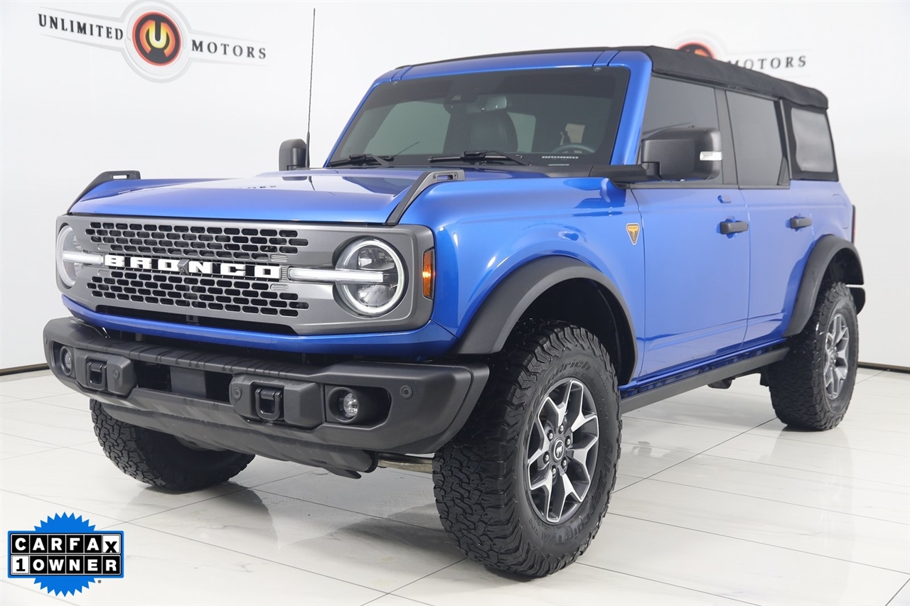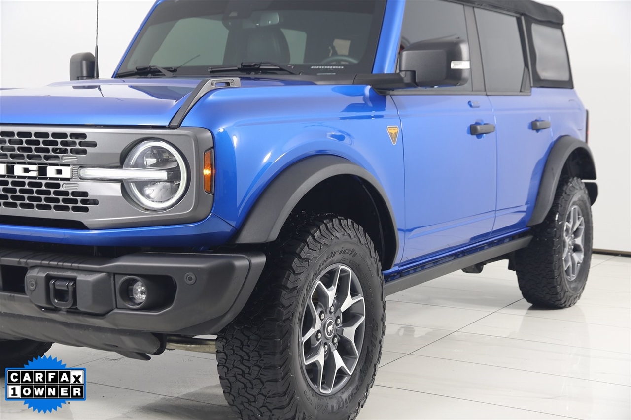 4x4, AWD, Back Up Camera, Bluetooth, Heated Seats, Navigation/GPS, Sun/Moon Roof, Push Button Start, 4-Matic, Memory Seats, Panoramic Roof, Towing, Bronco Badlands, 4D Sport Utility, 2.7L EcoBoost V6, 10-Speed Automatic, 4WD, Velocity Blue Metallic, Black Onyx, 12" LCD Capacitive Touchscreen w/Swipe Capability, 2 Smart Charging USB Ports In Dashboard, 360-Degree Camera, ABS brakes, Adaptive Cruise Control, Additional Sound Deadening, Compass, Connected Built-In Navigation, Electronic Stability Control, Equipment Group 354A Lux Package, Evasive Steering Assist, Front Parking Sensors, Heated door mirrors, Heated Steering Wheel, Illuminated entry, Information on Demand Panel, Low tire pressure warning, Radio: B&O Sound System by Bang & Olufsen, Remote keyless entry, Sideview Mirrors, Traction control, Universal Garage Door Opener, Wireless Charging Pad. Priced below KBB Fair Purchase Price!