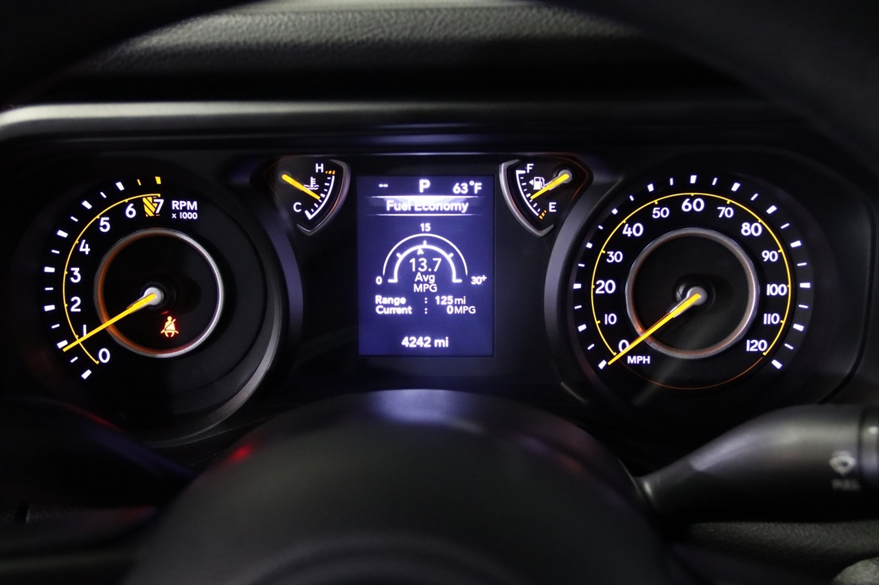 Bluetooth, Back Up Camera, Hard Top, Touch Screen, 110 MPH Vehicle Max Speed Calibration, 12.3" Touchscreen Display, 3.73 Rear Axle Ratio, 4-Wheel Disc Brakes, 4G LTE Wi-Fi Hot Spot, 8 Speakers, ABS brakes, Air Conditioning, Alexa Built-In, AM/FM radio: SiriusXM, Anti-Spin Differential Rear Axle, Apple CarPlay, Apple CarPlay/Android Auto, Body Color Fender Flares (2-Piece), Brake assist, Cloth Low-Back Bucket Seats, Compass, Connectivity - US/Canada, Dana M210 Wide Front Axle, Dana M220 Wide Rear Axle, Daytime Running Lamp System, Deep Tint Sunscreen Windows, Delay-off headlights, Driver door bin, Driver vanity mirror, Dual front impact airbags, Dual front side impact airbags, Electronic Stability Control, Front anti-roll bar, Front Bucket Seats, Front Center Armrest w/Storage, Front fog lights, Front reading lights, Google Android Auto, Illuminated entry, Integrated roll-over protection, Low tire pressure warning, Mold In Color Bumper w/Gloss Black, Normal Duty Suspension, Occupant sensing airbag, Outside temperature display, Overhead airbag, Panic alarm, ParkView Rear Back-Up Camera, Passenger door bin, Passenger vanity mirror, Power Heated Mirrors, Power steering, Power windows, Protection Sill Rails, Quick Order Package 24X Night Hawk (DISC), Radio data system, Radio: Uconnect 5 w/12.3" Display, Rear anti-roll bar, Rear reading lights, Remote keyless entry, Speed control, Split folding rear seat, Sport Rear Shock Absorbers, Sport Suspension (DISC), Steering wheel mounted audio controls, Tachometer, Telescoping steering wheel, Tilt steering wheel, Traction control, Trip computer, USB Host Flip, Variably intermittent wipers, Voltmeter. CARFAX One-Owner. Clean CARFAX.