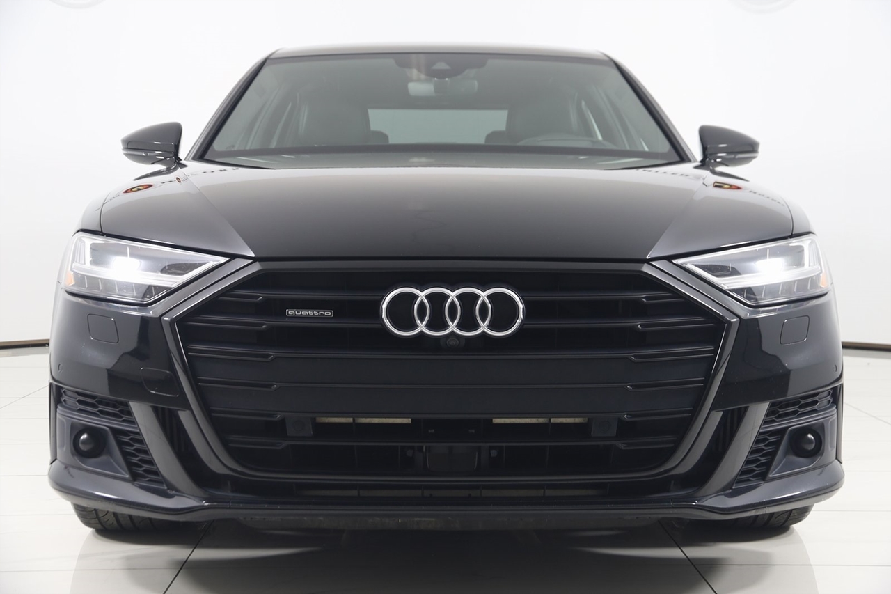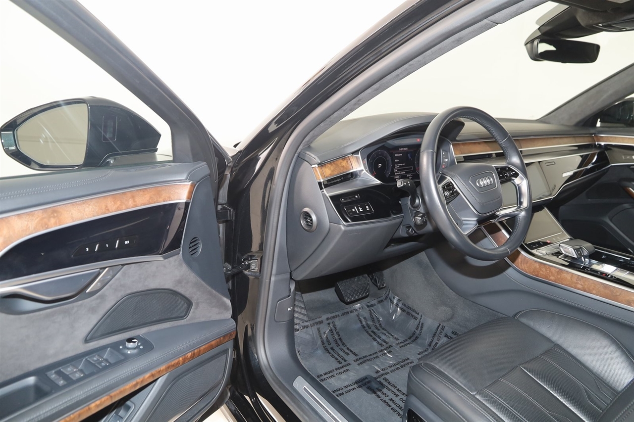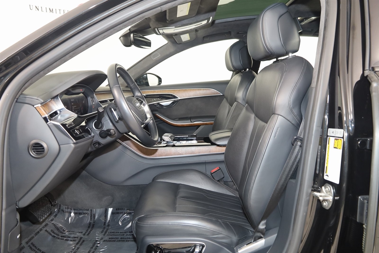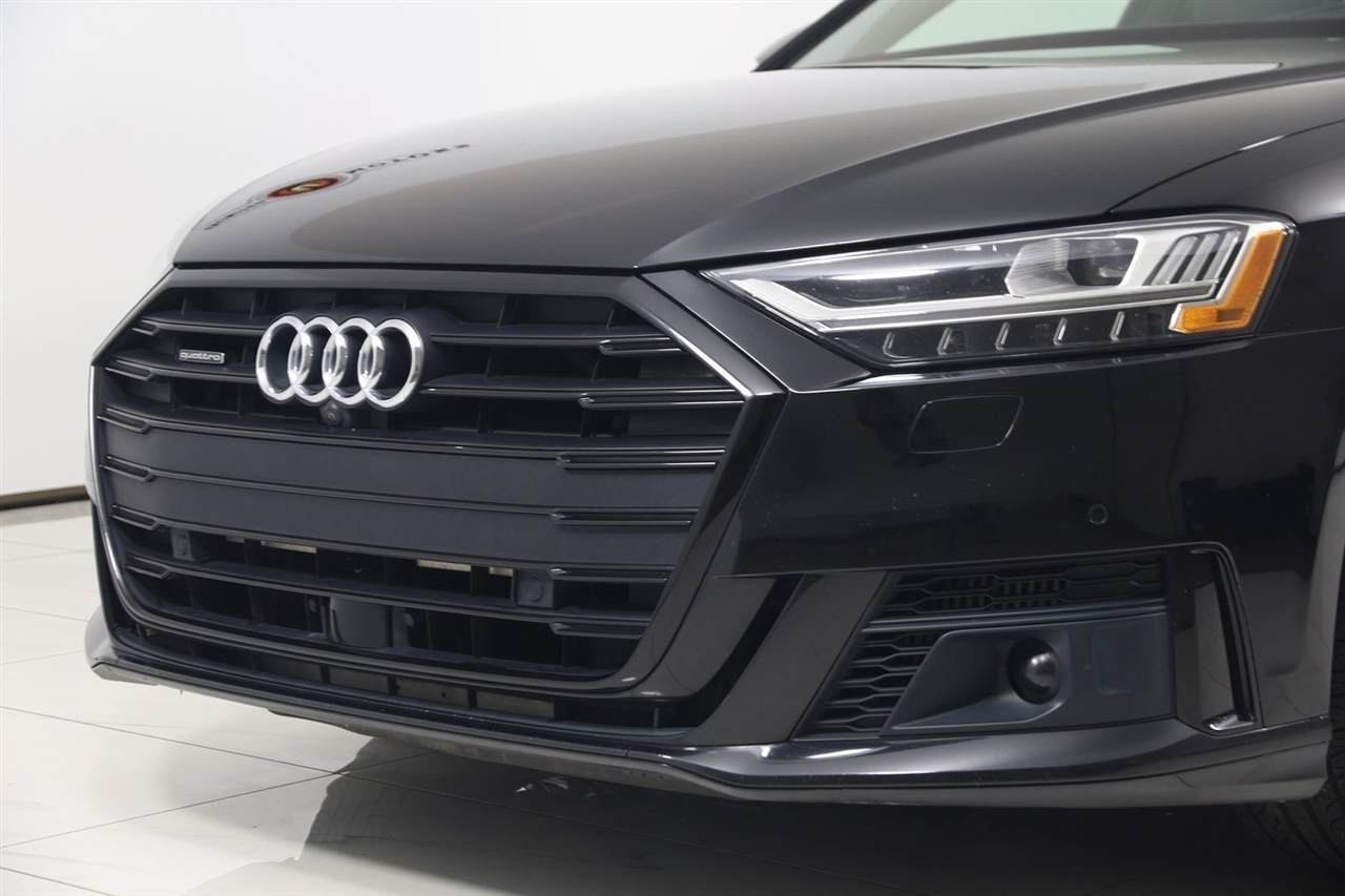Navigation, Back Up Camera, Bluetooth, Panoramic Roof, Heated Seats, Touch Screen, Cooled Heats, Blind Spot, Apple Play, A8 4.0 LWB quattro L, 4D Sedan, 4.0L V8 Turbocharged DOHC 32V LEV3-ULEV125 453hp, 8-Speed Automatic with Tiptronic, quattro, Black Metallic, Black Leather, Acoustic & Break Resistant Dual-Pane Side Windows, Adaptive Windshield Wiping System, Aluminum Optic Buttons, Audi Active Lane Assist, Audi Adaptive Cruise Assist, Audi Head-Up Display, Audi Phone Box, Audi Pre Sense Rear, Audi Side Assist, Black Optic Exterior Package, Chrome Exterior Package, Cold Weather Package, Contour/Ambient LED Interior Lighting Package, Driver Assistance Package, Dynamic All-Wheel-Steering, Executive Package, Extended Leather Package, HD Matrix-Design LED Headlights, Headlight Washers, Heated 4-Spoke Multifunction Steering Wheel, Heated Front Surfaces, Heated Rear Outboard Seats, Intersection Assist, Ionizer & Fragrance Premium Air Quality, Light Alcantara Headliner, Lighting Package, Luxury Package, Navigation System, Navigation system: MMI Navigation plus, OLED Taillights w/Animation, Predictive Active Suspension, Sport Exterior Styling, Sport Plus Package, Top View Camera System, Traffic Sign Recognition, Valcona Leather Seat Upholstery, Ventilated Comfort Front Seats, Wheels: 20" Audi Sport 5-V-Spoke-Star-Design. Clean CARFAX.
