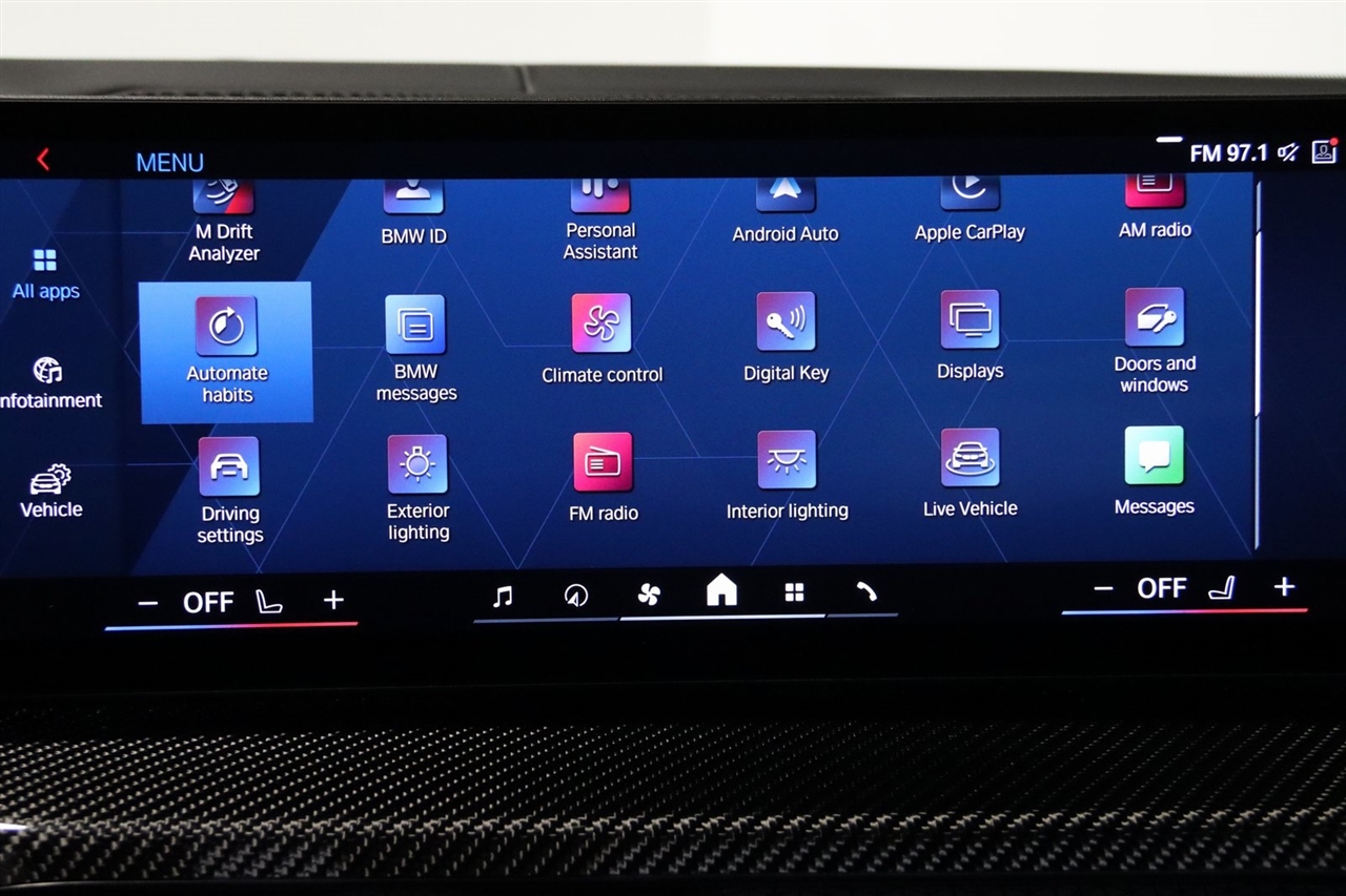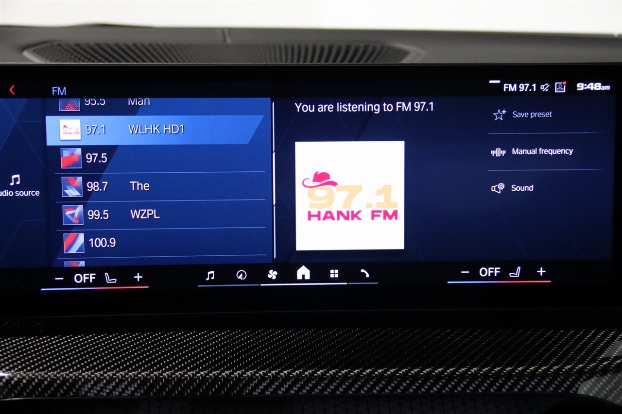 Navigation, Bluetooth, Back Up Camera, Heated Seats, Touch Screen, 16 Speakers, 4-Wheel Disc Brakes, ABS brakes, Adaptive suspension, Air Conditioning, Alloy wheels, AM/FM radio: SiriusXM with 360L, Apple CarPlay & Android Auto Compatibility, Audio memory, Auto High-beam Headlights, Auto-dimming door mirrors, Auto-dimming Rear-View mirror, Automatic temperature control, BMW Assist eCall, BMW TeleServices, Brake assist, Bumpers: body-color, Compass, Connected Package Pro, ConnectedDrive Services, Delay-off headlights, Driver door bin, Driver vanity mirror, Dual front impact airbags, Dual front side impact airbags, Electronic Stability Control, Emergency communication system: BMW Assist eCall, Exterior Parking Camera Rear, Four wheel independent suspension, Front anti-roll bar, Front Bucket Seats, Front Center Armrest, Front dual zone A/C, Front reading lights, Full Merino Leather Upholstery (X3), Fully automatic headlights, Garage door transmitter, harman/kardon Surround Sound System, harman/kardon® Speakers, Heads-Up Display, Heated door mirrors, Heated Front Seats, Heated front seats, HVAC memory, Illuminated entry, Knee airbag, Leather Shift Knob, Low tire pressure warning, M Carbon Bucket Seats, M Compound Brakes w/Black Calipers, Memory seat, Navigation, Navigation System, Occupant sensing airbag, Outside temperature display, Overhead airbag, Overhead console, Panic alarm, Passenger door bin, Passenger vanity mirror, Personal eSIM 5G, Power door mirrors, Power driver seat, Power Front Seats, Power passenger seat, Power steering, Power windows, Radio data system, Radio: AM/FM Audio System, Rain sensing wipers, Rear anti-roll bar, Rear reading lights, Rear seat center armrest, Rear window defroster, Remote keyless entry, Security system, SiriusXM w/360L, Speed control, Speed-sensing steering, Speed-Sensitive Wipers, Split folding rear seat, Spoiler, Sport steering wheel, Steering wheel mounted audio controls, Tachometer, Telescoping steering wheel, Tilt steering wheel, Traction control, Trip computer, Turn signal indicator mirrors, Variably intermittent wipers, Widescreen Display. CARFAX One-Owner.
