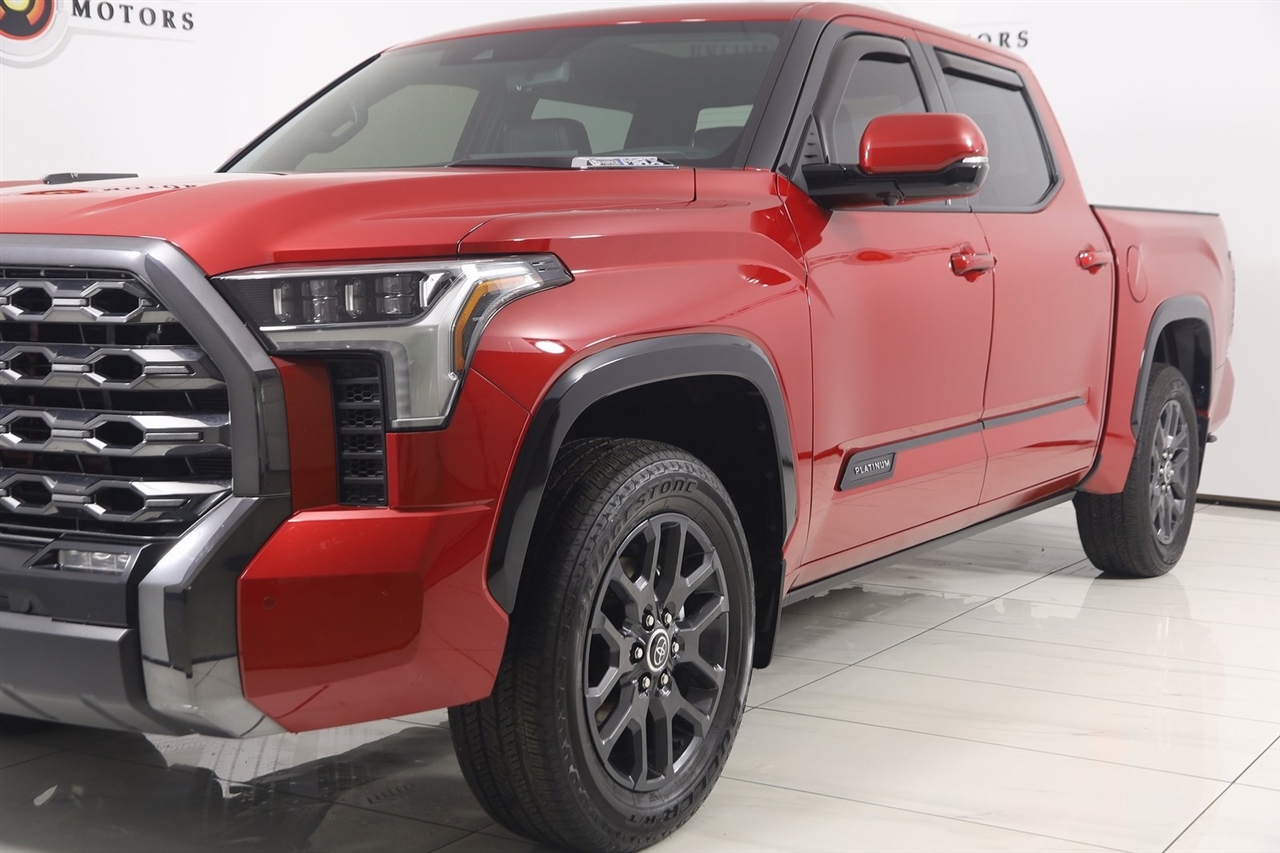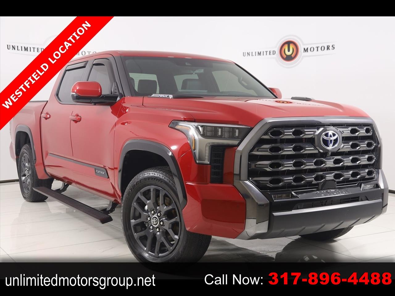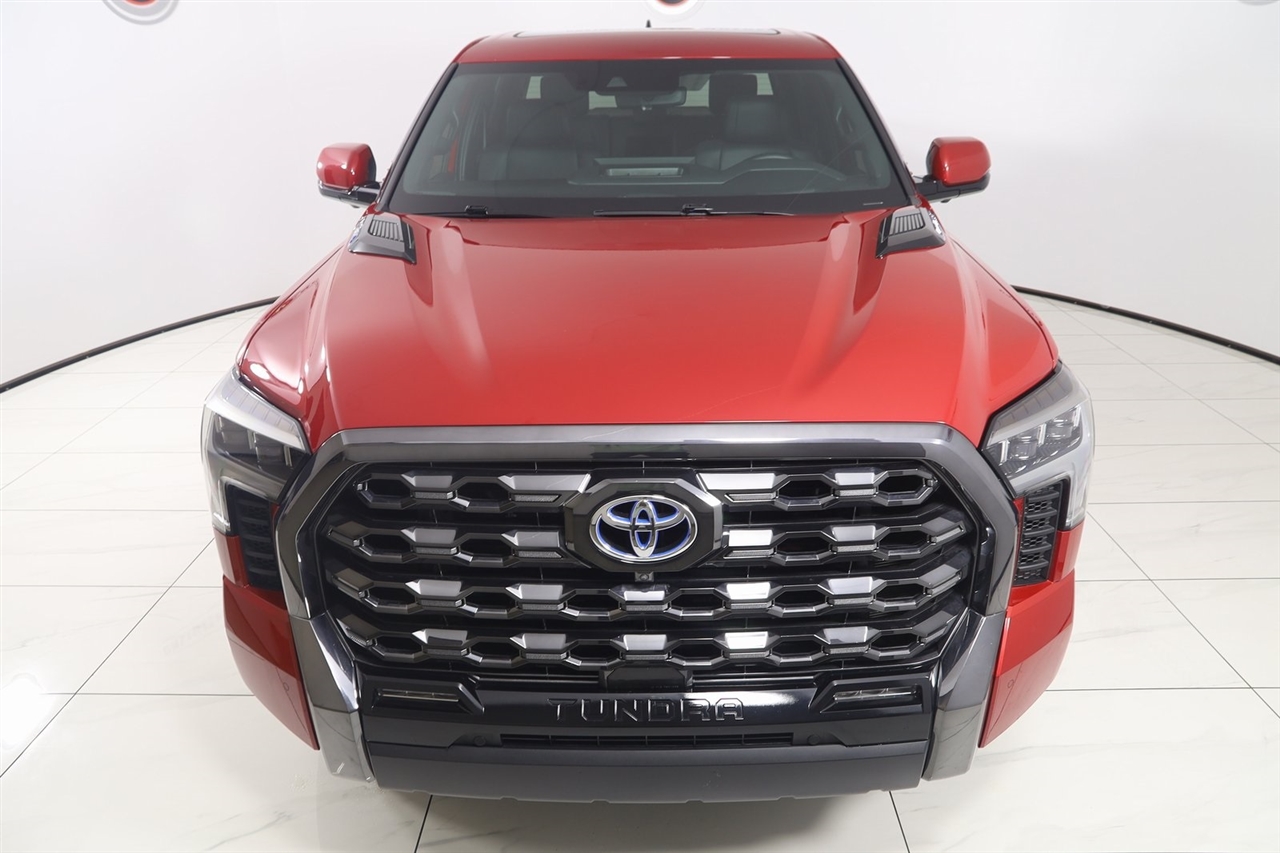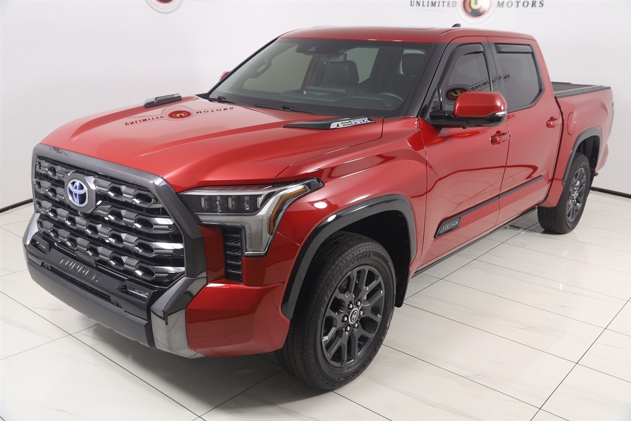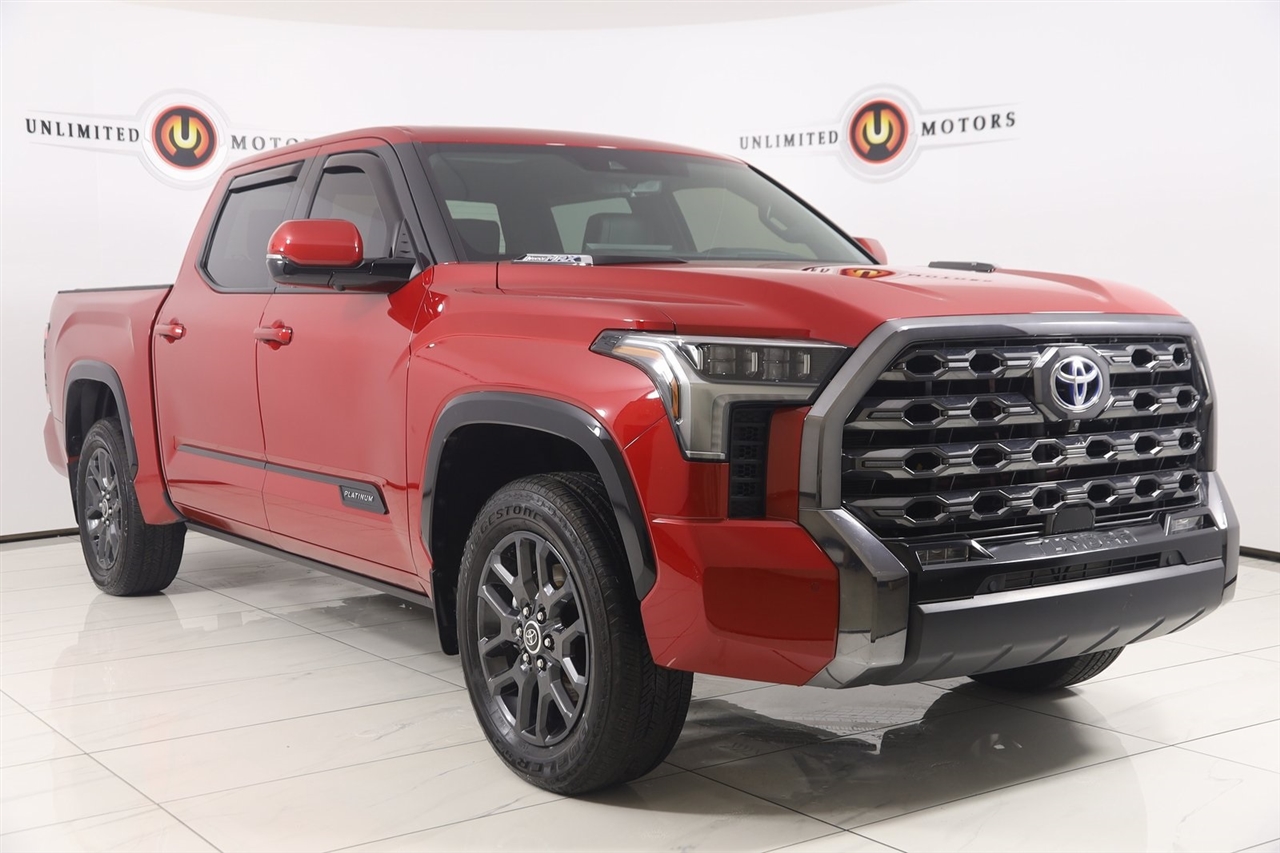 Navigation, Back Up Camera, Bluetooth, Panoramic Roof, Power Running Boards, Heated Seats, Winch, Touch Screen, Cooled Heats, Blind Spot, Heated Steering Wheel, Tundra Hybrid Platinum, 4D Crew Cab, 3.4L V6, 10-Speed Automatic, 4WD, Solar Octane, Black Leather, Navigation System. CARFAX One-Owner. Odometer is 22396 miles below market average! 2023 Solar Octane Toyota 4D Crew Cab Tundra Hybrid Platinum 4WD 10-Speed Automatic 3.4L V6 Visit our website www.iumotors.com to view 100s of newer vehicles, more pictures and info, or to apply for financing. Rates are incredibly low for approved credit. We offer extended warranties, protection packages, and insurance. We assure you the best experience at any of our 4 locations and unbeatable prices and quality. At Unlimited Motors we believe in "MARKET VALUE PRICING’’. We use real-time Internet price comparisons to constantly adjust prices to provide ALL BUYERS The BEST PRICE possible. We do not mark them up, to mark them down! Our entire team is committed to helping you buy a car the way we would want to buy a car! We utilize state-of-the-art technology to constantly monitor pricing trends to offer our shoppers the best competitive pricing, value, and experience. We sell and service all makes and models of Pre-owned / Used Vehicles Used Cars, Used Trucks, Used Sport Utility, Lamborghini, Ferrari, Bentley, Rolls Royce, McLaren, Maserati, Ford, Chevrolet/Chevy, Honda, Toyota, Porsche, Land Rover, Jaguar, INFINITI, Audi, Nissan, Mazda, Hyundai, Chrysler, Jeep, Dodge, Ram, SRT, Mitsubishi, Lexus, Kia, Volkswagen, Mini, BMW, Mercedes, Fiat, Volvo, GMC, Cadillac, Lincoln as well as other brands. Proudly serving these areas of Indianapolis, Fishers, Carmel, Noblesville, Greenwood, Avon, Plainfield, Zionsville, & Brownsburg, Indiana, Midwest. We also serve the entire nation with our seamless and easy online purchasing process, and offer shipping nationwide. Advertised prices DO NOT include Sales Tax, Dealer Fees, Title Processing Charges, and Dealer Pre-installed Products.