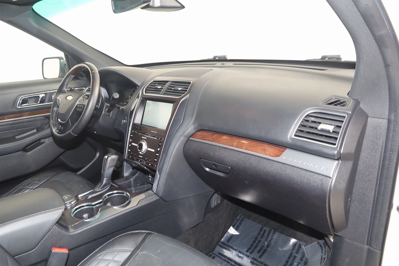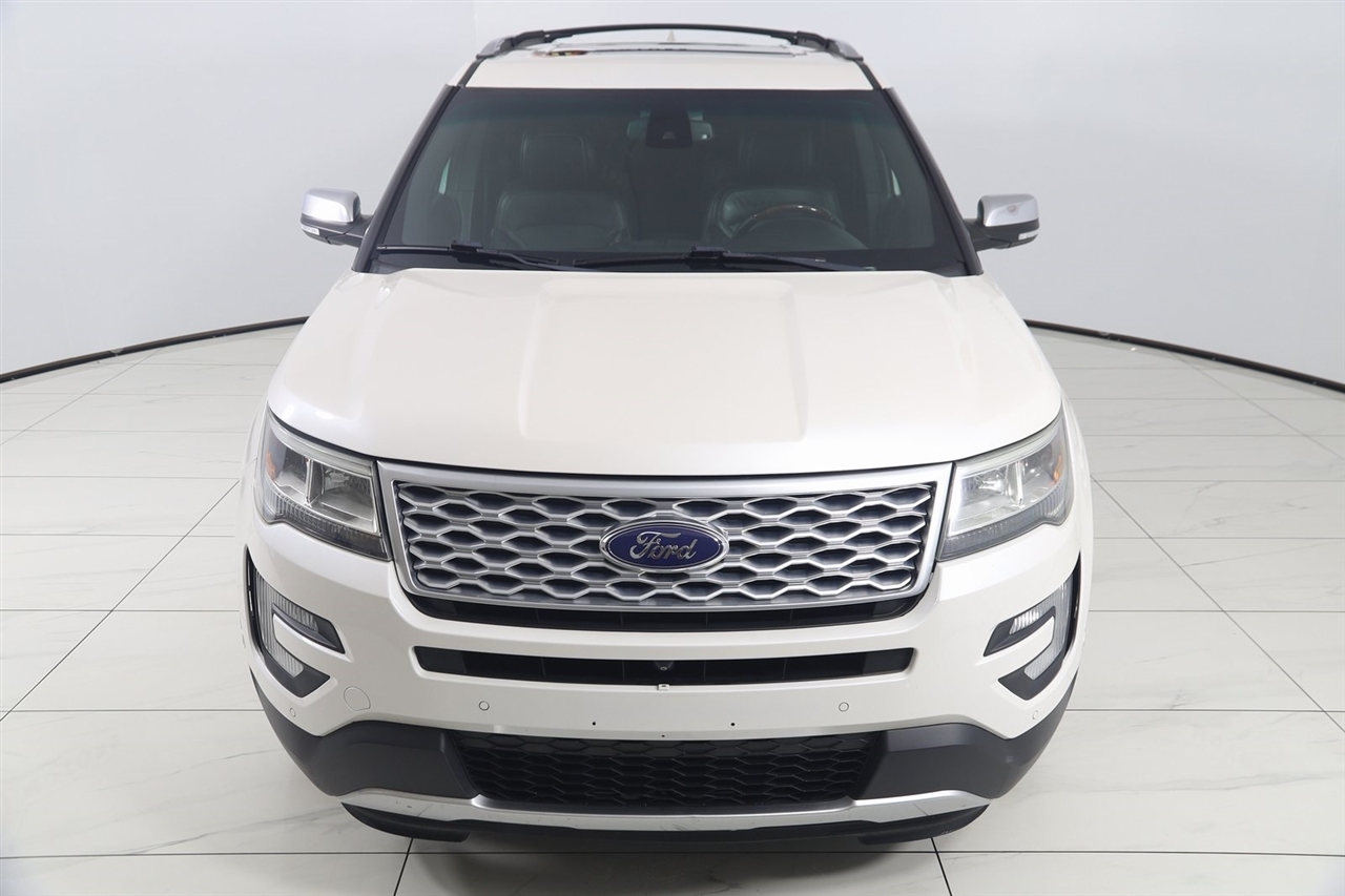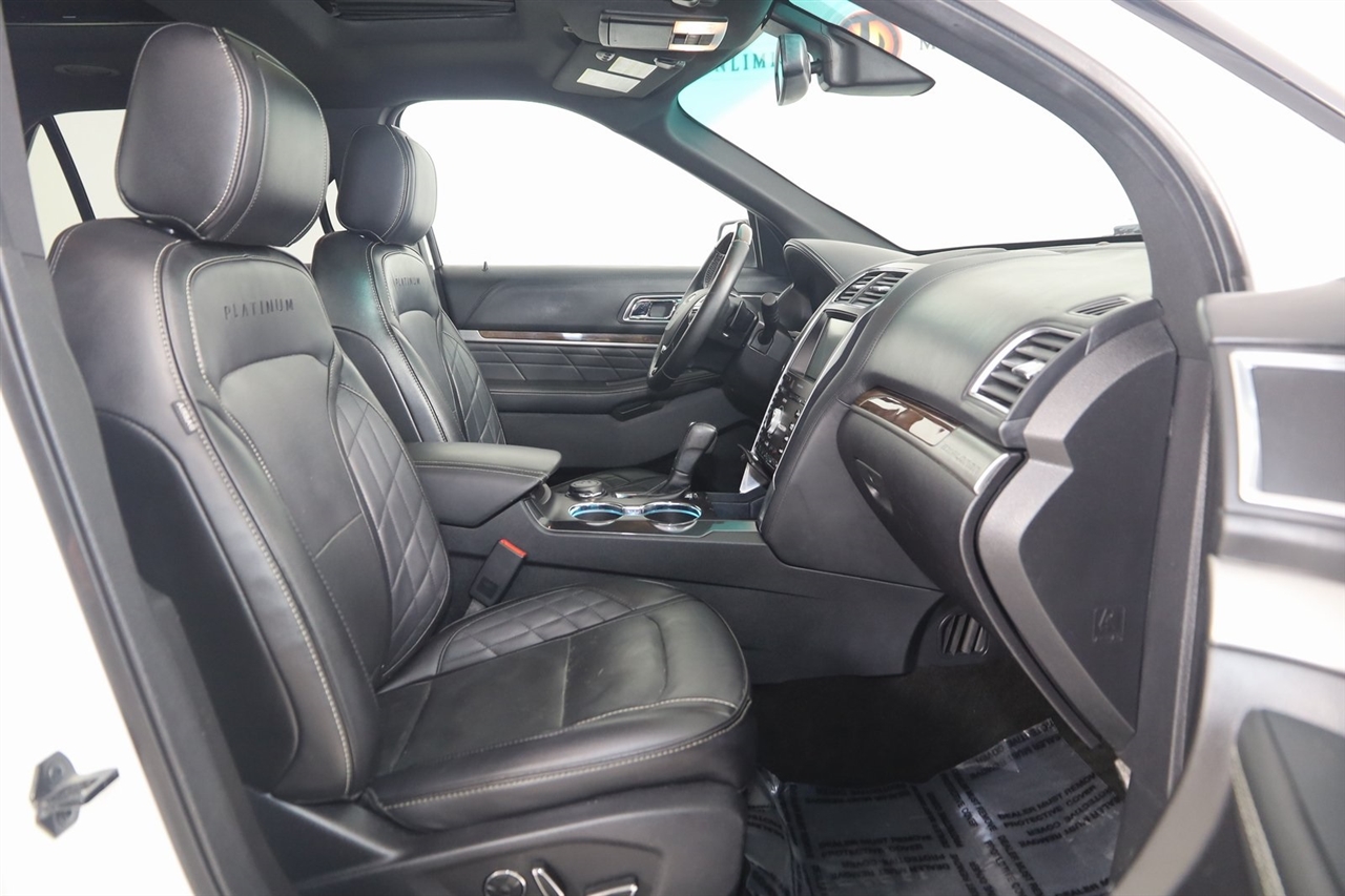 Navigation, Back Up Camera, Bluetooth, Panoramic Roof, Heated Seats, Touch Screen, Heated Steering Wheel, Rear Heated Seats, Blind Spot, Explorer Platinum, 4D Sport Utility, 3.5L V6, 6-Speed Automatic with Select-Shift, 4WD, White Platinum Clearcoat Metallic, Ebony Black Leather.