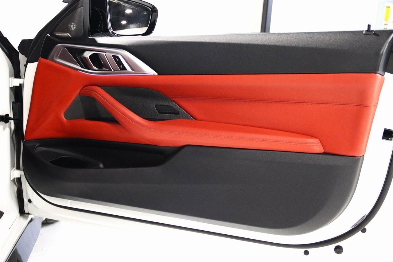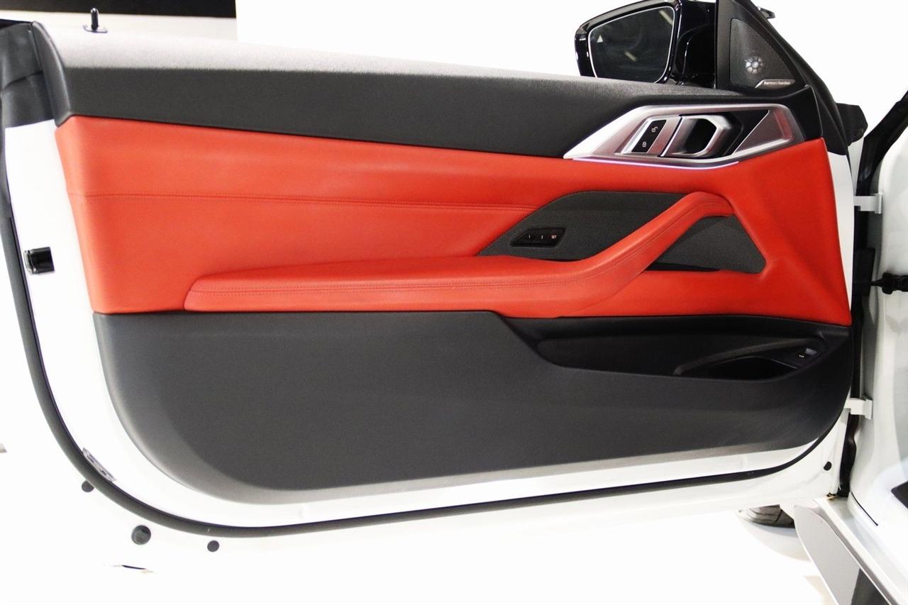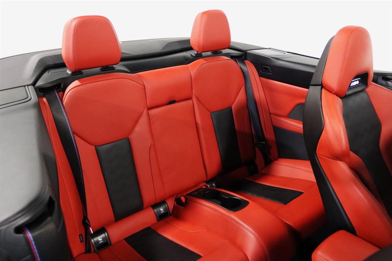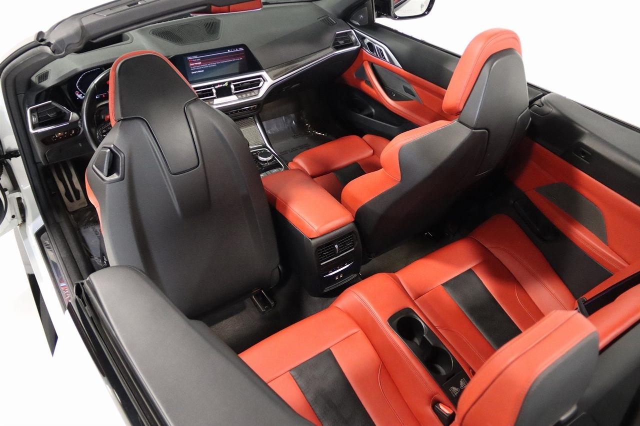Navigation, Bluetooth, Back Up Camera, Soft Top, Heated Seats, Touch Screen, 16 Speakers, 4-Wheel Disc Brakes, ABS brakes, Active Driving Assistant Pro, Adaptive suspension, Air Conditioning, Alloy wheels, AM/FM radio: SiriusXM, Apple CarPlay & Android Auto Compatibility, Auto High-beam Headlights, Auto-dimming door mirrors, Auto-dimming Rear-View mirror, Automatic temperature control, BMW Assist eCall, BMW TeleServices, Brake assist, Bumpers: body-color, Carbon Fiber Trim, Compass, ConnectedDrive Services, Convertible roof lining, Convertible roof wind blocker, Delay-off headlights, Driver door bin, Driver vanity mirror, Driving Assistance Professional Package, Dual front impact airbags, Dual front side impact airbags, Electronic Stability Control, Emergency communication system: BMW Assist eCall, Enhanced USB/Bluetooth Plus Smartphone Integration, Executive Package, Extended Merino Leather Upholstery, Extended Traffic Jam Assistant, Exterior Parking Camera Rear, Four wheel independent suspension, Front anti-roll bar, Front Bucket Seats, Front Center Armrest, Front dual zone A/C, Front reading lights, Front Ventilated Seats, Fully automatic headlights, Garage door transmitter, Glass rear window, harman/kardon Surround Sound System, harman/kardon® Speakers, Head-Up Display, Heated door mirrors, Heated Front Seats, Heated front seats, Heated Steering Wheel, Icon Adaptive LED Headlights w/Laserlight, Illuminated entry, Integrated roll-over protection, Knee airbag, Leather Shift Knob, Live Cockpit Pro w/Navi, Low tire pressure warning, Lumbar Support, M Compound Brakes w/Red Calipers, M Shadowline Lights, M Sport Seats, Memory seat, Navigation System, Occupant sensing airbag, Outside temperature display, Overhead console, Panic alarm, Parking Assistance Package, Parking Assistant Plus, Passenger door bin, Passenger vanity mirror, Power convertible roof, Power door mirrors, Power driver seat, Power Front Seats, Power passenger seat, Power steering, Power windows, Radio data system, Radio: AM/FM Audio System, Rain sensing wipers, Rear air conditioning, Rear anti-roll bar, Rear reading lights, Rear seat center armrest, Rear window defroster, Remote Engine Start, Remote keyless entry, Security system, SiriusXM Satellite Radio, Speed control, Speed-sensing steering, Speed-Sensitive Wipers, Sport steering wheel, Steering wheel mounted audio controls, Tachometer, Telescoping steering wheel, Tilt steering wheel, Traction control, Trip computer, Turn signal indicator mirrors, Variably intermittent wipers, WiFi Hotspot, Wireless Charging. Clean CARFAX.