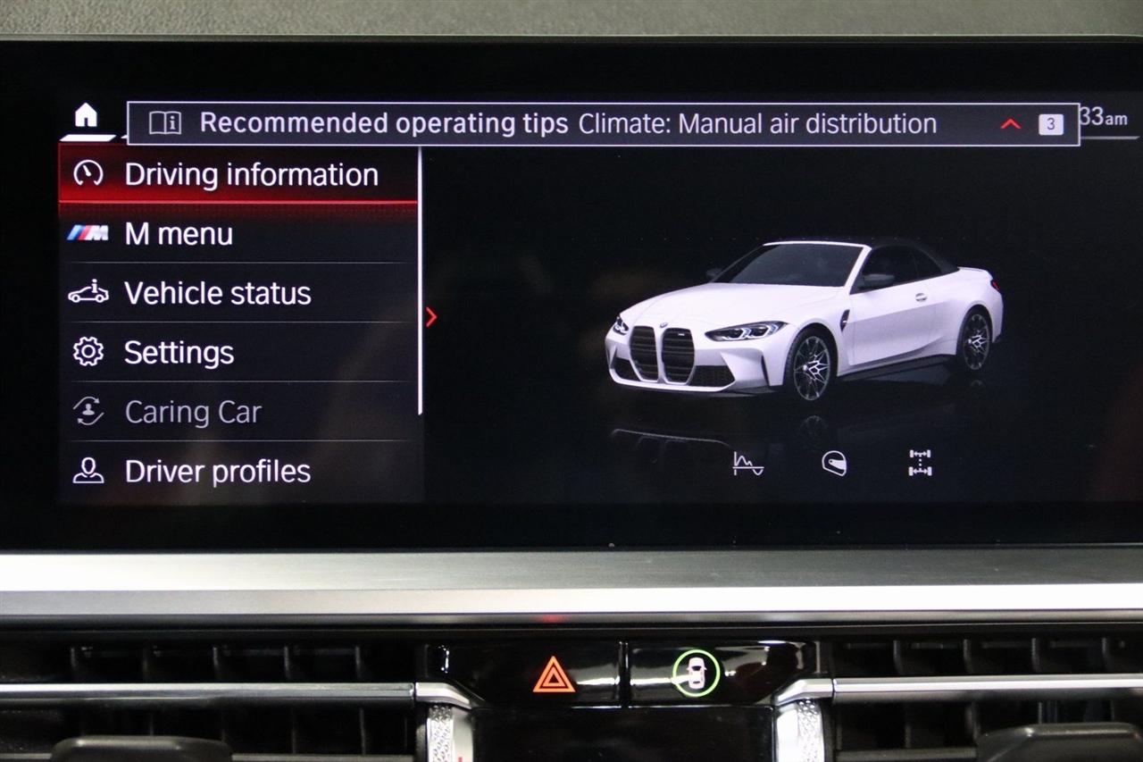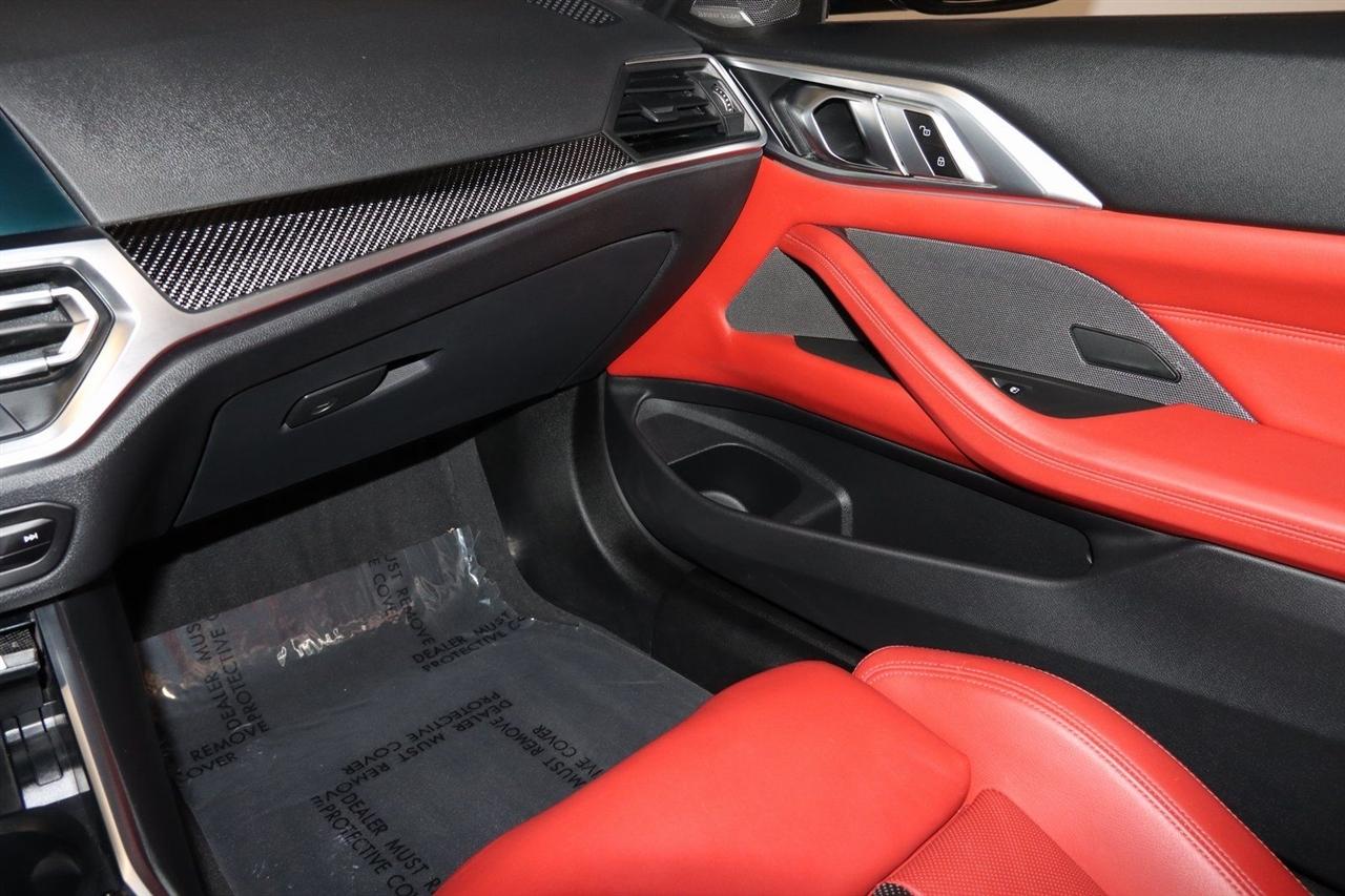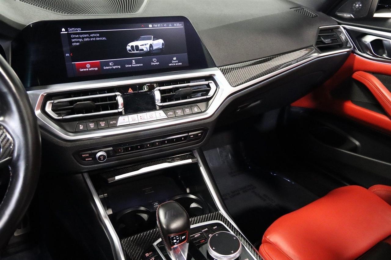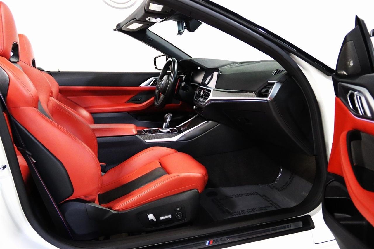 Navigation, Bluetooth, Back Up Camera, Soft Top, Heated Seats, Touch Screen, 16 Speakers, 4-Wheel Disc Brakes, ABS brakes, Active Driving Assistant Pro, Adaptive suspension, Air Conditioning, Alloy wheels, AM/FM radio: SiriusXM, Apple CarPlay & Android Auto Compatibility, Auto High-beam Headlights, Auto-dimming door mirrors, Auto-dimming Rear-View mirror, Automatic temperature control, BMW Assist eCall, BMW TeleServices, Brake assist, Bumpers: body-color, Carbon Fiber Trim, Compass, ConnectedDrive Services, Convertible roof lining, Convertible roof wind blocker, Delay-off headlights, Driver door bin, Driver vanity mirror, Driving Assistance Professional Package, Dual front impact airbags, Dual front side impact airbags, Electronic Stability Control, Emergency communication system: BMW Assist eCall, Enhanced USB/Bluetooth Plus Smartphone Integration, Executive Package, Extended Merino Leather Upholstery, Extended Traffic Jam Assistant, Exterior Parking Camera Rear, Four wheel independent suspension, Front anti-roll bar, Front Bucket Seats, Front Center Armrest, Front dual zone A/C, Front reading lights, Front Ventilated Seats, Fully automatic headlights, Garage door transmitter, Glass rear window, harman/kardon Surround Sound System, harman/kardon® Speakers, Head-Up Display, Heated door mirrors, Heated Front Seats, Heated front seats, Heated Steering Wheel, Icon Adaptive LED Headlights w/Laserlight, Illuminated entry, Integrated roll-over protection, Knee airbag, Leather Shift Knob, Live Cockpit Pro w/Navi, Low tire pressure warning, Lumbar Support, M Compound Brakes w/Red Calipers, M Shadowline Lights, M Sport Seats, Memory seat, Navigation System, Occupant sensing airbag, Outside temperature display, Overhead console, Panic alarm, Parking Assistance Package, Parking Assistant Plus, Passenger door bin, Passenger vanity mirror, Power convertible roof, Power door mirrors, Power driver seat, Power Front Seats, Power passenger seat, Power steering, Power windows, Radio data system, Radio: AM/FM Audio System, Rain sensing wipers, Rear air conditioning, Rear anti-roll bar, Rear reading lights, Rear seat center armrest, Rear window defroster, Remote Engine Start, Remote keyless entry, Security system, SiriusXM Satellite Radio, Speed control, Speed-sensing steering, Speed-Sensitive Wipers, Sport steering wheel, Steering wheel mounted audio controls, Tachometer, Telescoping steering wheel, Tilt steering wheel, Traction control, Trip computer, Turn signal indicator mirrors, Variably intermittent wipers, WiFi Hotspot, Wireless Charging. Clean CARFAX.