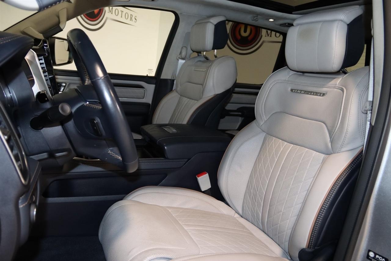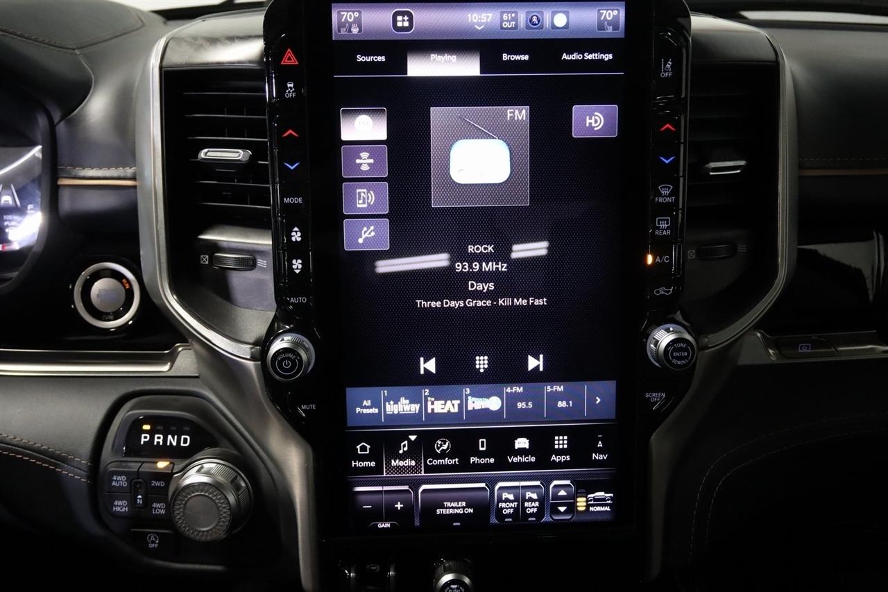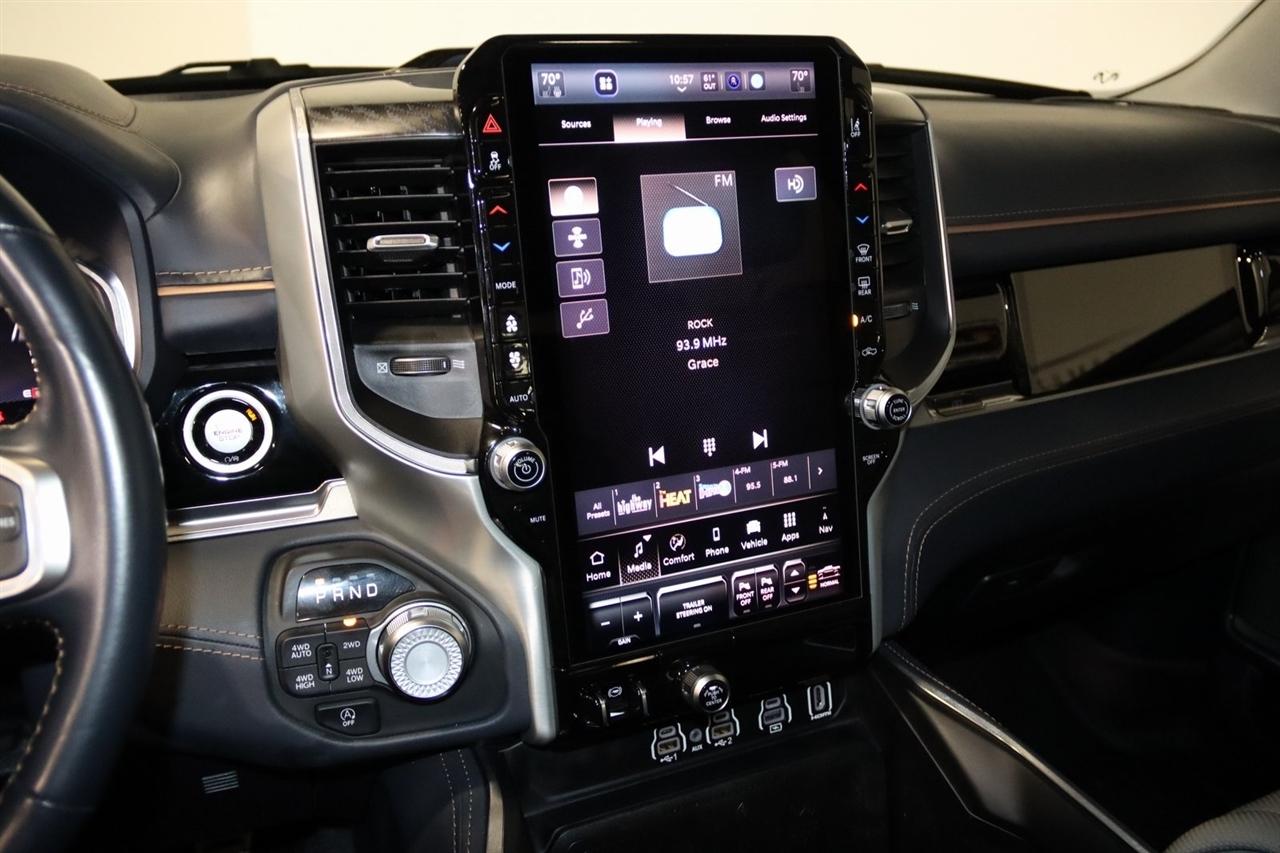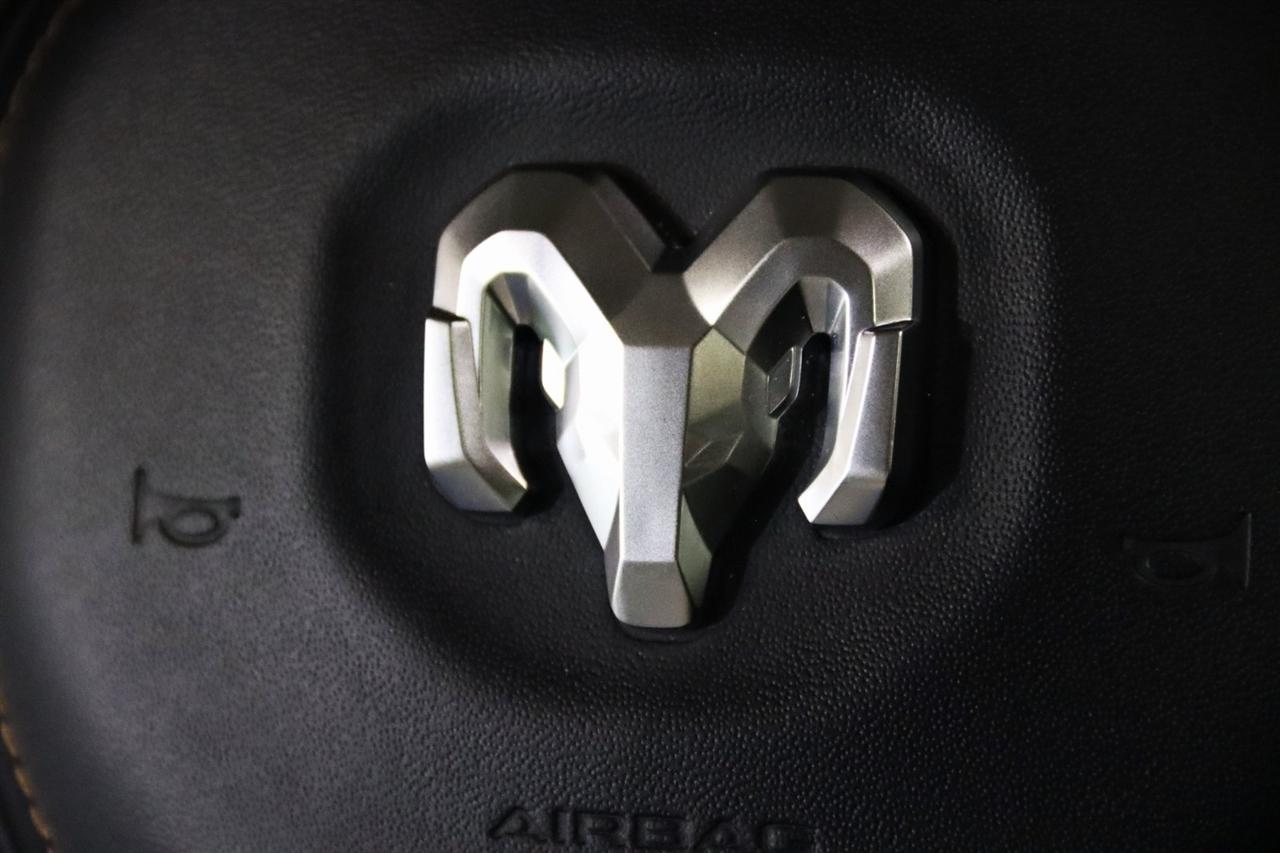 Navigation, Bluetooth, Back Up Camera, Panoramic Roof, Towing, Heated Seats, Touch Screen, 12-Way/1-Way Trailer Connector, 3.92 Rear Axle Ratio, 4-Wheel Disc Brakes, ABS brakes, Adjustable pedals, Air Conditioning, Alloy wheels, AM/FM radio: SiriusXM with 360L, Apple CarPlay/Android Auto, Audio memory, Auto High-beam Headlights, Auto Power-Folding Mirrors, Auto-dimming door mirrors, Auto-Dimming Exterior Driver Mirror, Auto-dimming Rear-View mirror, Auto-leveling suspension, Automatic temperature control, Bodyside moldings, Brake assist, Bumpers: body-color, Chrome Exterior Mirrors, Compass, Delay-off headlights, Driver door bin, Driver vanity mirror, Dual front impact airbags, Dual front side impact airbags, Electronic Stability Control, Exterior Mirrors Courtesy Lamps, Exterior Mirrors w/Heating Element, Exterior Mirrors w/Memory, Exterior Mirrors w/Supplemental Signals, Front anti-roll bar, Front Bucket Seats, Front Center Armrest w/Storage, Front dual zone A/C, Front fog lights, Front reading lights, Front wheel independent suspension, Fully automatic headlights, Garage door transmitter, Heads-Up Display, Heated door mirrors, Heated front seats, Heated rear seats, Heated steering wheel, Illuminated entry, Leather steering wheel, Low tire pressure warning, Memory seat, Multi-Function Tailgate, Navigation System, Occupant sensing airbag, Outside temperature display, Overhead airbag, Overhead console, Panic alarm, Passenger door bin, Passenger vanity mirror, Pedal memory, Power adjustable front head restraints, Power door mirrors, Power driver seat, Power moonroof, Power passenger seat, Power steering, Power windows, Premium Leather Bucket Seats, Quick Order Package 22V Tungsten, Radio data system, Radio: Uconnect 5 Nav w/14.4" Display, Rain sensing wipers, RAM's Head Badge, Rear anti-roll bar, Rear reading lights, Rear seat center armrest, Rear step bumper, Rear window defroster, Remote keyless entry, Remote Tailgate Release, Security system, Speed control, Split folding rear seat, Steering wheel mounted audio controls, Tachometer, Telescoping steering wheel, Tilt steering wheel, Traction control, Trailer Brake Control, Trailer Light Check, Trailer Reverse Steering Control, Trailer Tire Pressure Monitoring System, Trailer Tow Group, Trip computer, Turn signal indicator mirrors, Variably intermittent wipers, Ventilated front seats, Ventilated rear seats, Voltmeter, Wheels: 22" x 9" Polish/Painted w/Inserts. CARFAX One-Owner. Priced below KBB Fair Purchase Price!