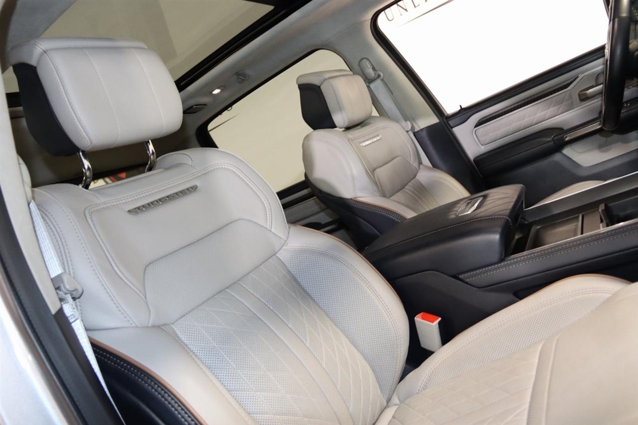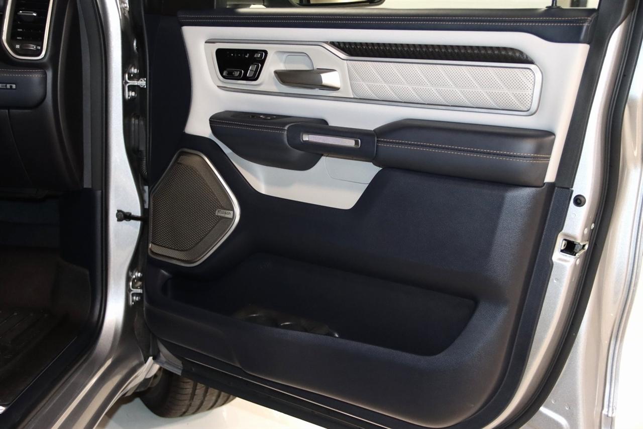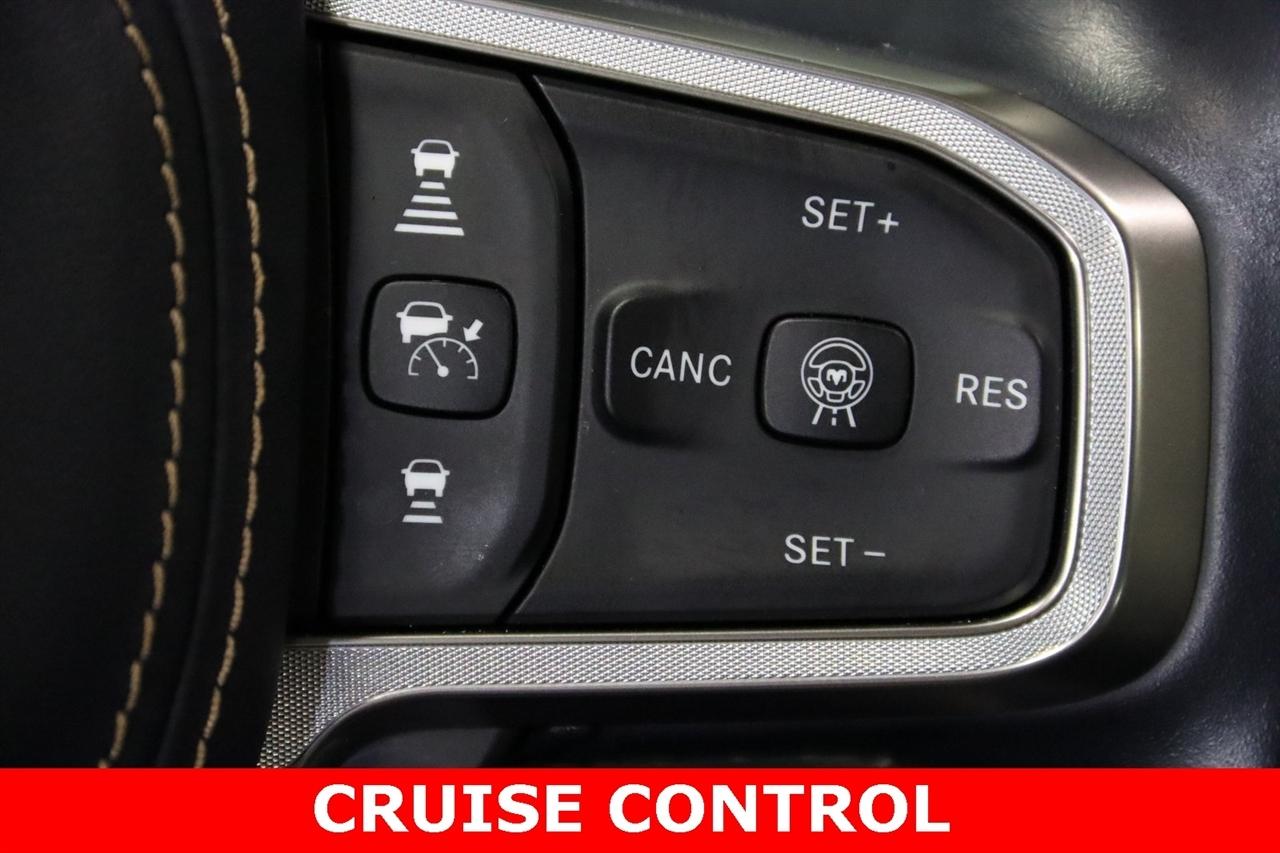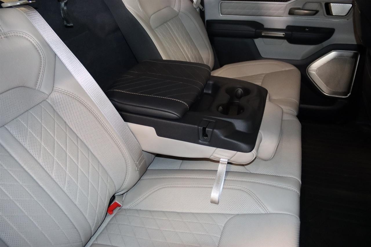 Navigation, Bluetooth, Back Up Camera, Panoramic Roof, Towing, Heated Seats, Touch Screen, 12-Way/1-Way Trailer Connector, 3.92 Rear Axle Ratio, 4-Wheel Disc Brakes, ABS brakes, Adjustable pedals, Air Conditioning, Alloy wheels, AM/FM radio: SiriusXM with 360L, Apple CarPlay/Android Auto, Audio memory, Auto High-beam Headlights, Auto Power-Folding Mirrors, Auto-dimming door mirrors, Auto-Dimming Exterior Driver Mirror, Auto-dimming Rear-View mirror, Auto-leveling suspension, Automatic temperature control, Bodyside moldings, Brake assist, Bumpers: body-color, Chrome Exterior Mirrors, Compass, Delay-off headlights, Driver door bin, Driver vanity mirror, Dual front impact airbags, Dual front side impact airbags, Electronic Stability Control, Exterior Mirrors Courtesy Lamps, Exterior Mirrors w/Heating Element, Exterior Mirrors w/Memory, Exterior Mirrors w/Supplemental Signals, Front anti-roll bar, Front Bucket Seats, Front Center Armrest w/Storage, Front dual zone A/C, Front fog lights, Front reading lights, Front wheel independent suspension, Fully automatic headlights, Garage door transmitter, Heads-Up Display, Heated door mirrors, Heated front seats, Heated rear seats, Heated steering wheel, Illuminated entry, Leather steering wheel, Low tire pressure warning, Memory seat, Multi-Function Tailgate, Navigation System, Occupant sensing airbag, Outside temperature display, Overhead airbag, Overhead console, Panic alarm, Passenger door bin, Passenger vanity mirror, Pedal memory, Power adjustable front head restraints, Power door mirrors, Power driver seat, Power moonroof, Power passenger seat, Power steering, Power windows, Premium Leather Bucket Seats, Quick Order Package 22V Tungsten, Radio data system, Radio: Uconnect 5 Nav w/14.4" Display, Rain sensing wipers, RAM's Head Badge, Rear anti-roll bar, Rear reading lights, Rear seat center armrest, Rear step bumper, Rear window defroster, Remote keyless entry, Remote Tailgate Release, Security system, Speed control, Split folding rear seat, Steering wheel mounted audio controls, Tachometer, Telescoping steering wheel, Tilt steering wheel, Traction control, Trailer Brake Control, Trailer Light Check, Trailer Reverse Steering Control, Trailer Tire Pressure Monitoring System, Trailer Tow Group, Trip computer, Turn signal indicator mirrors, Variably intermittent wipers, Ventilated front seats, Ventilated rear seats, Voltmeter, Wheels: 22" x 9" Polish/Painted w/Inserts. CARFAX One-Owner. Priced below KBB Fair Purchase Price!