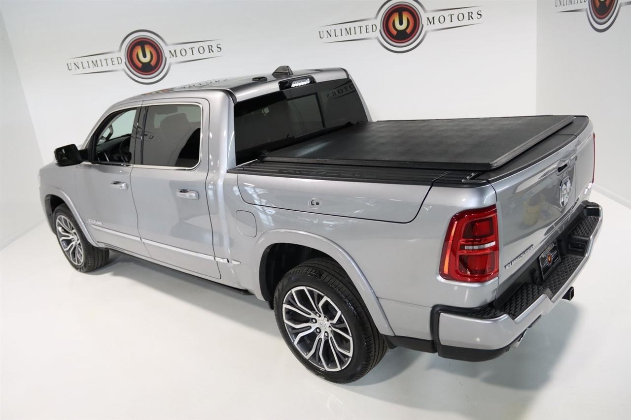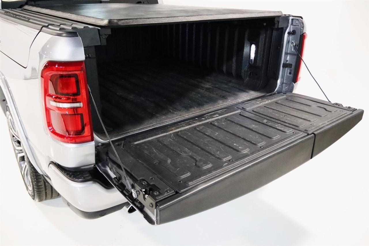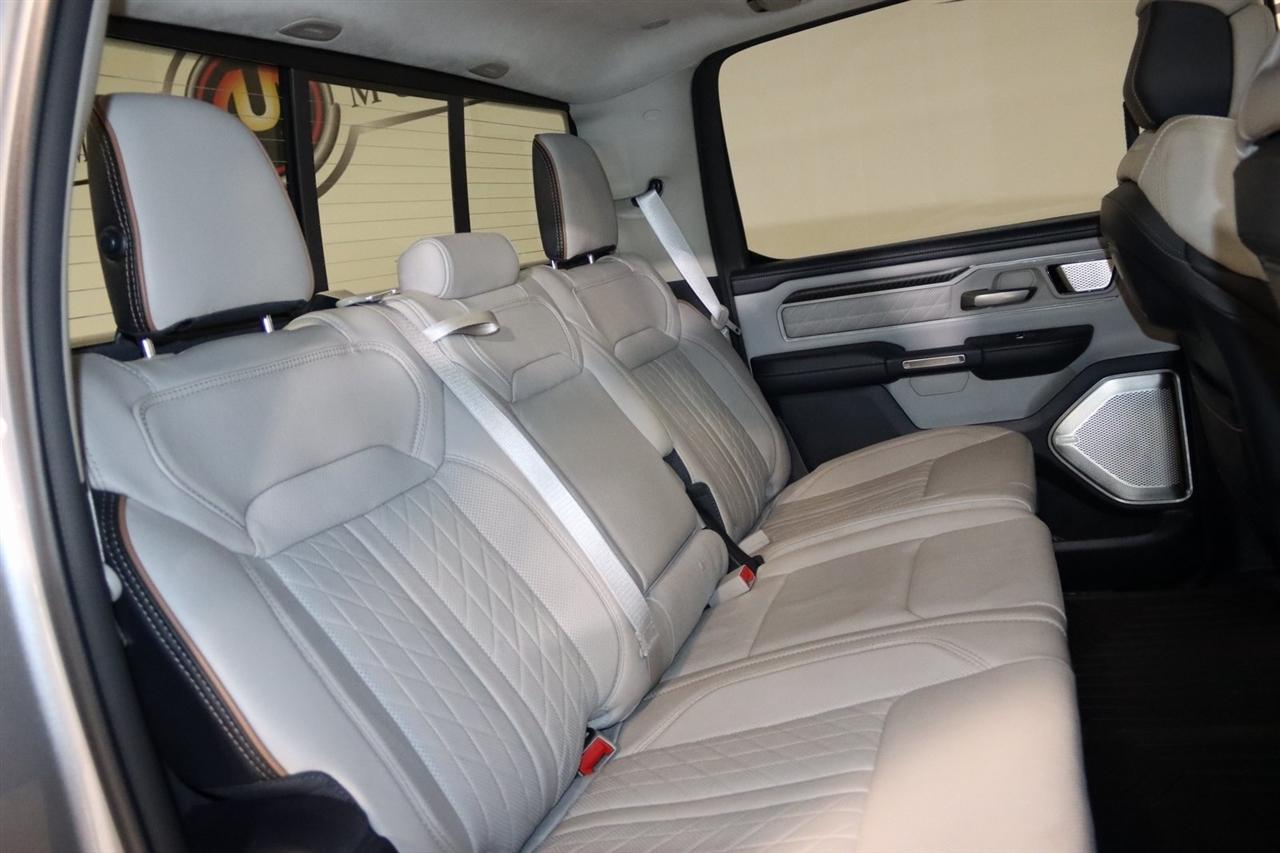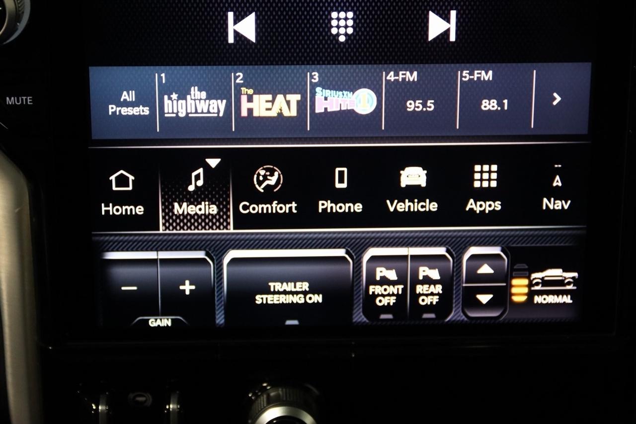 Navigation, Bluetooth, Back Up Camera, Panoramic Roof, Towing, Heated Seats, Touch Screen, 12-Way/1-Way Trailer Connector, 3.92 Rear Axle Ratio, 4-Wheel Disc Brakes, ABS brakes, Adjustable pedals, Air Conditioning, Alloy wheels, AM/FM radio: SiriusXM with 360L, Apple CarPlay/Android Auto, Audio memory, Auto High-beam Headlights, Auto Power-Folding Mirrors, Auto-dimming door mirrors, Auto-Dimming Exterior Driver Mirror, Auto-dimming Rear-View mirror, Auto-leveling suspension, Automatic temperature control, Bodyside moldings, Brake assist, Bumpers: body-color, Chrome Exterior Mirrors, Compass, Delay-off headlights, Driver door bin, Driver vanity mirror, Dual front impact airbags, Dual front side impact airbags, Electronic Stability Control, Exterior Mirrors Courtesy Lamps, Exterior Mirrors w/Heating Element, Exterior Mirrors w/Memory, Exterior Mirrors w/Supplemental Signals, Front anti-roll bar, Front Bucket Seats, Front Center Armrest w/Storage, Front dual zone A/C, Front fog lights, Front reading lights, Front wheel independent suspension, Fully automatic headlights, Garage door transmitter, Heads-Up Display, Heated door mirrors, Heated front seats, Heated rear seats, Heated steering wheel, Illuminated entry, Leather steering wheel, Low tire pressure warning, Memory seat, Multi-Function Tailgate, Navigation System, Occupant sensing airbag, Outside temperature display, Overhead airbag, Overhead console, Panic alarm, Passenger door bin, Passenger vanity mirror, Pedal memory, Power adjustable front head restraints, Power door mirrors, Power driver seat, Power moonroof, Power passenger seat, Power steering, Power windows, Premium Leather Bucket Seats, Quick Order Package 22V Tungsten, Radio data system, Radio: Uconnect 5 Nav w/14.4" Display, Rain sensing wipers, RAM's Head Badge, Rear anti-roll bar, Rear reading lights, Rear seat center armrest, Rear step bumper, Rear window defroster, Remote keyless entry, Remote Tailgate Release, Security system, Speed control, Split folding rear seat, Steering wheel mounted audio controls, Tachometer, Telescoping steering wheel, Tilt steering wheel, Traction control, Trailer Brake Control, Trailer Light Check, Trailer Reverse Steering Control, Trailer Tire Pressure Monitoring System, Trailer Tow Group, Trip computer, Turn signal indicator mirrors, Variably intermittent wipers, Ventilated front seats, Ventilated rear seats, Voltmeter, Wheels: 22" x 9" Polish/Painted w/Inserts. CARFAX One-Owner. Priced below KBB Fair Purchase Price!
