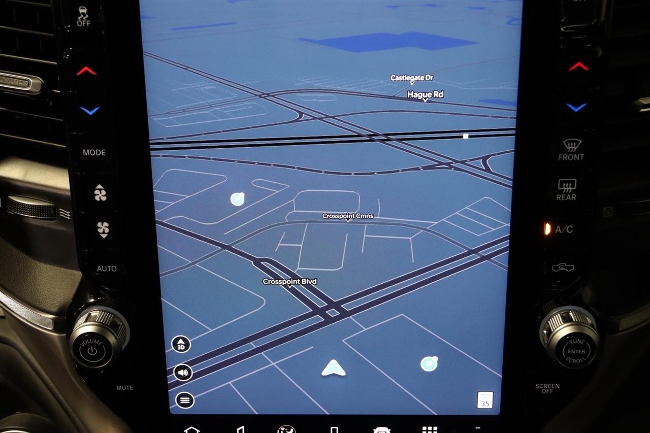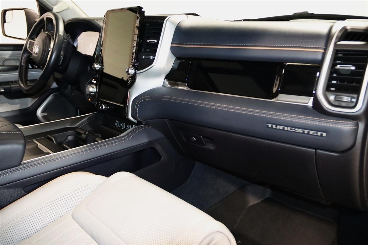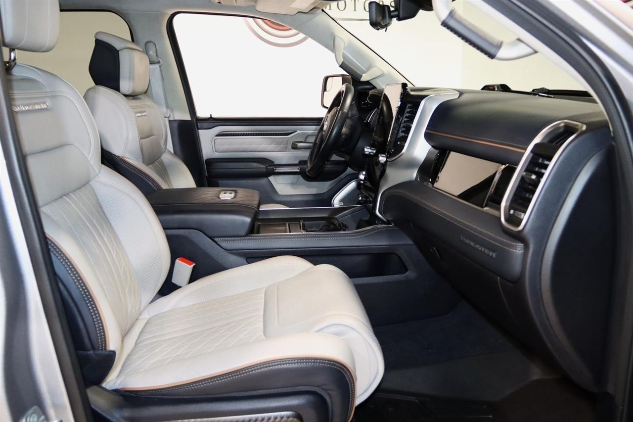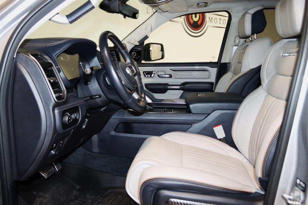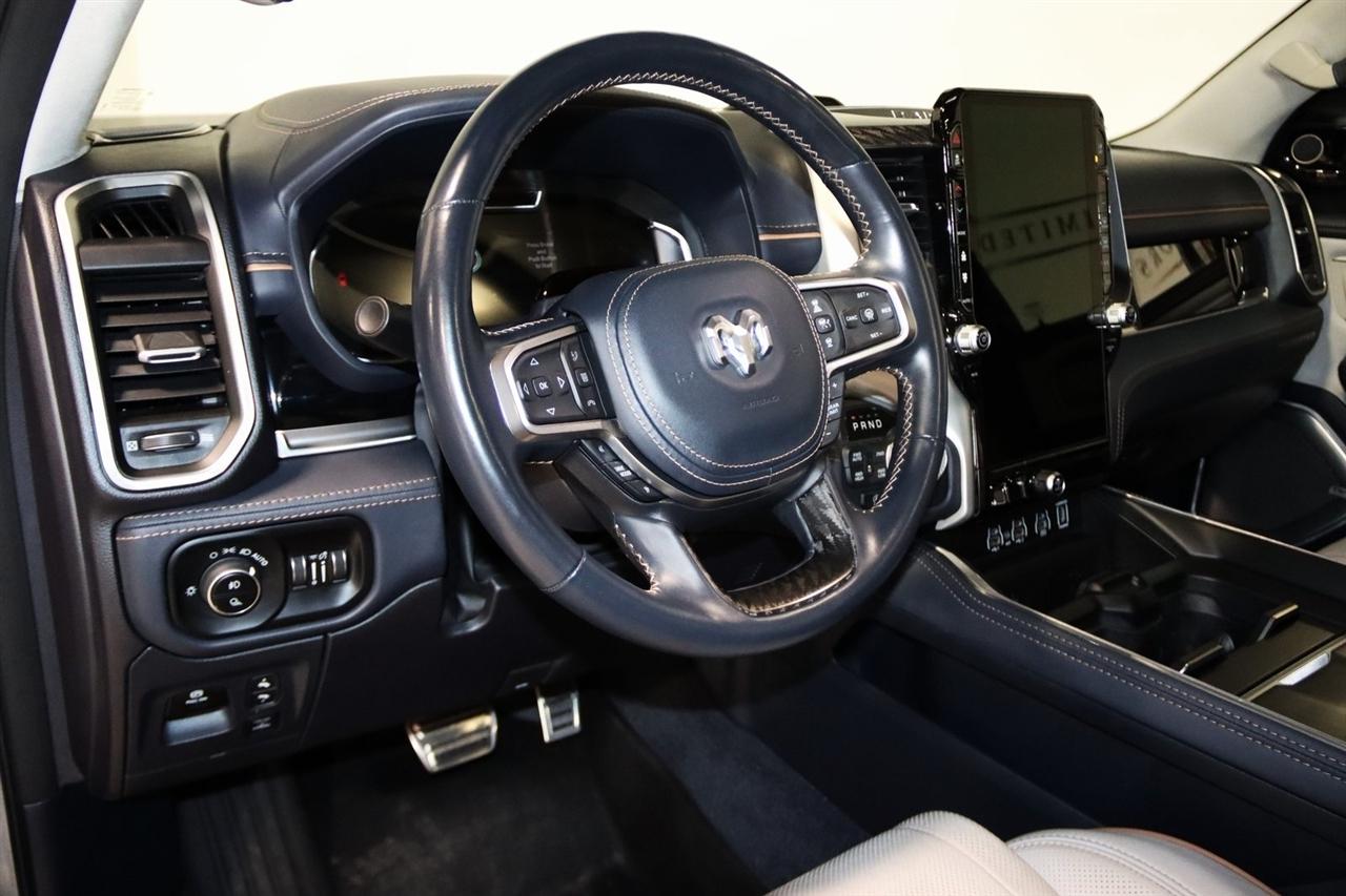 Navigation, Bluetooth, Back Up Camera, Panoramic Roof, Towing, Heated Seats, Touch Screen, 12-Way/1-Way Trailer Connector, 3.92 Rear Axle Ratio, 4-Wheel Disc Brakes, ABS brakes, Adjustable pedals, Air Conditioning, Alloy wheels, AM/FM radio: SiriusXM with 360L, Apple CarPlay/Android Auto, Audio memory, Auto High-beam Headlights, Auto Power-Folding Mirrors, Auto-dimming door mirrors, Auto-Dimming Exterior Driver Mirror, Auto-dimming Rear-View mirror, Auto-leveling suspension, Automatic temperature control, Bodyside moldings, Brake assist, Bumpers: body-color, Chrome Exterior Mirrors, Compass, Delay-off headlights, Driver door bin, Driver vanity mirror, Dual front impact airbags, Dual front side impact airbags, Electronic Stability Control, Exterior Mirrors Courtesy Lamps, Exterior Mirrors w/Heating Element, Exterior Mirrors w/Memory, Exterior Mirrors w/Supplemental Signals, Front anti-roll bar, Front Bucket Seats, Front Center Armrest w/Storage, Front dual zone A/C, Front fog lights, Front reading lights, Front wheel independent suspension, Fully automatic headlights, Garage door transmitter, Heads-Up Display, Heated door mirrors, Heated front seats, Heated rear seats, Heated steering wheel, Illuminated entry, Leather steering wheel, Low tire pressure warning, Memory seat, Multi-Function Tailgate, Navigation System, Occupant sensing airbag, Outside temperature display, Overhead airbag, Overhead console, Panic alarm, Passenger door bin, Passenger vanity mirror, Pedal memory, Power adjustable front head restraints, Power door mirrors, Power driver seat, Power moonroof, Power passenger seat, Power steering, Power windows, Premium Leather Bucket Seats, Quick Order Package 22V Tungsten, Radio data system, Radio: Uconnect 5 Nav w/14.4" Display, Rain sensing wipers, RAM's Head Badge, Rear anti-roll bar, Rear reading lights, Rear seat center armrest, Rear step bumper, Rear window defroster, Remote keyless entry, Remote Tailgate Release, Security system, Speed control, Split folding rear seat, Steering wheel mounted audio controls, Tachometer, Telescoping steering wheel, Tilt steering wheel, Traction control, Trailer Brake Control, Trailer Light Check, Trailer Reverse Steering Control, Trailer Tire Pressure Monitoring System, Trailer Tow Group, Trip computer, Turn signal indicator mirrors, Variably intermittent wipers, Ventilated front seats, Ventilated rear seats, Voltmeter, Wheels: 22" x 9" Polish/Painted w/Inserts. CARFAX One-Owner. Priced below KBB Fair Purchase Price!