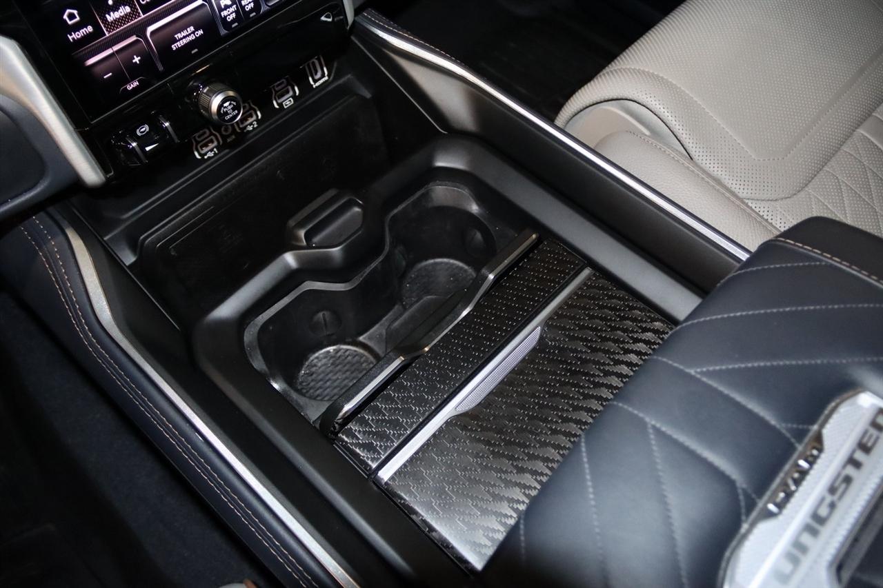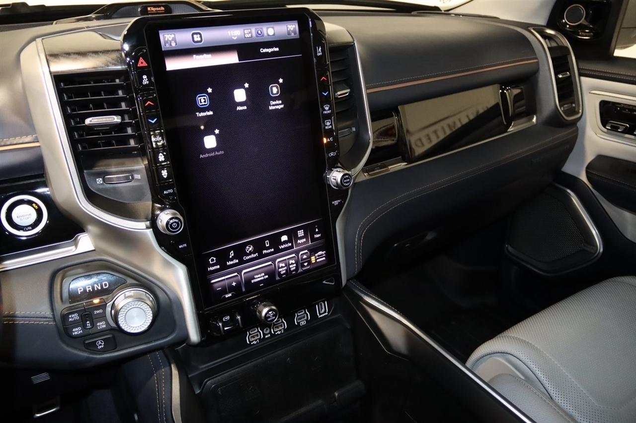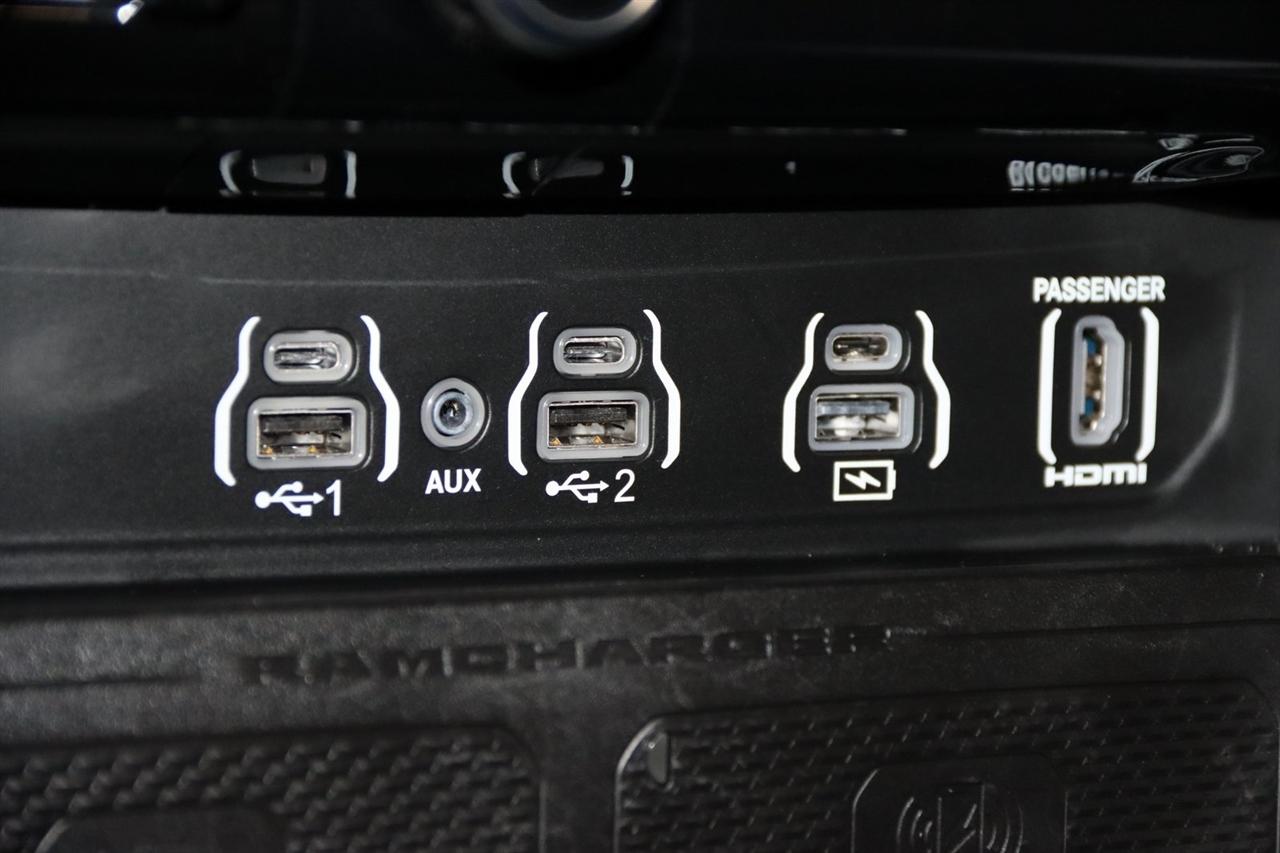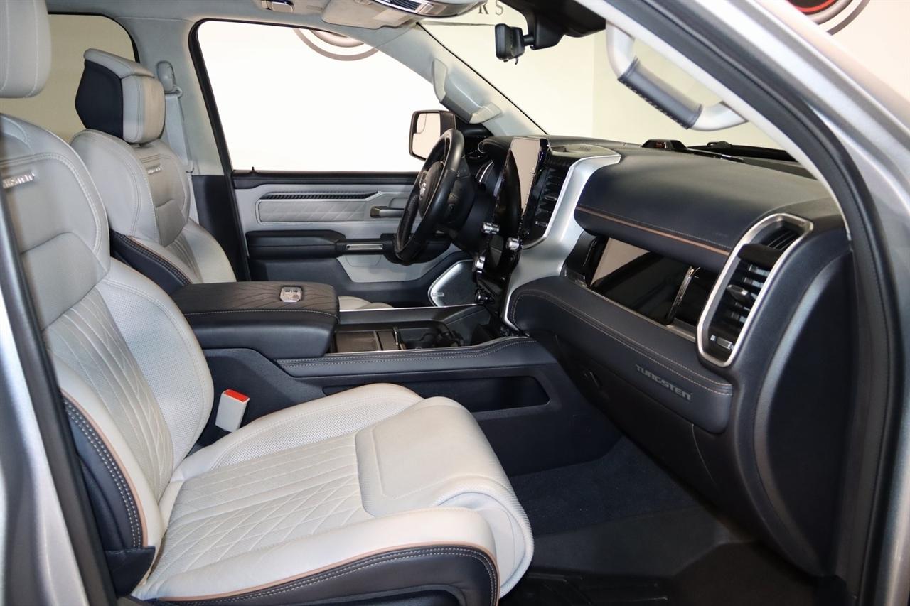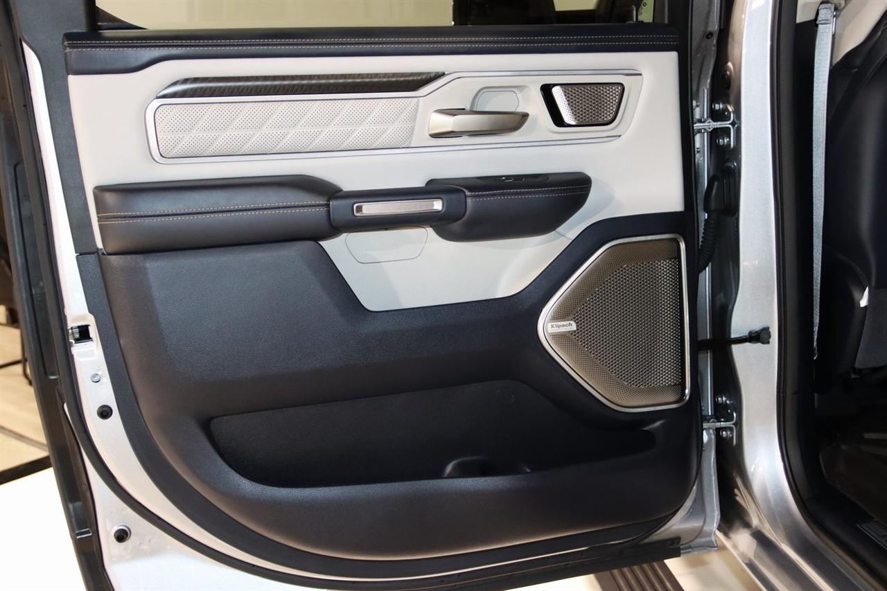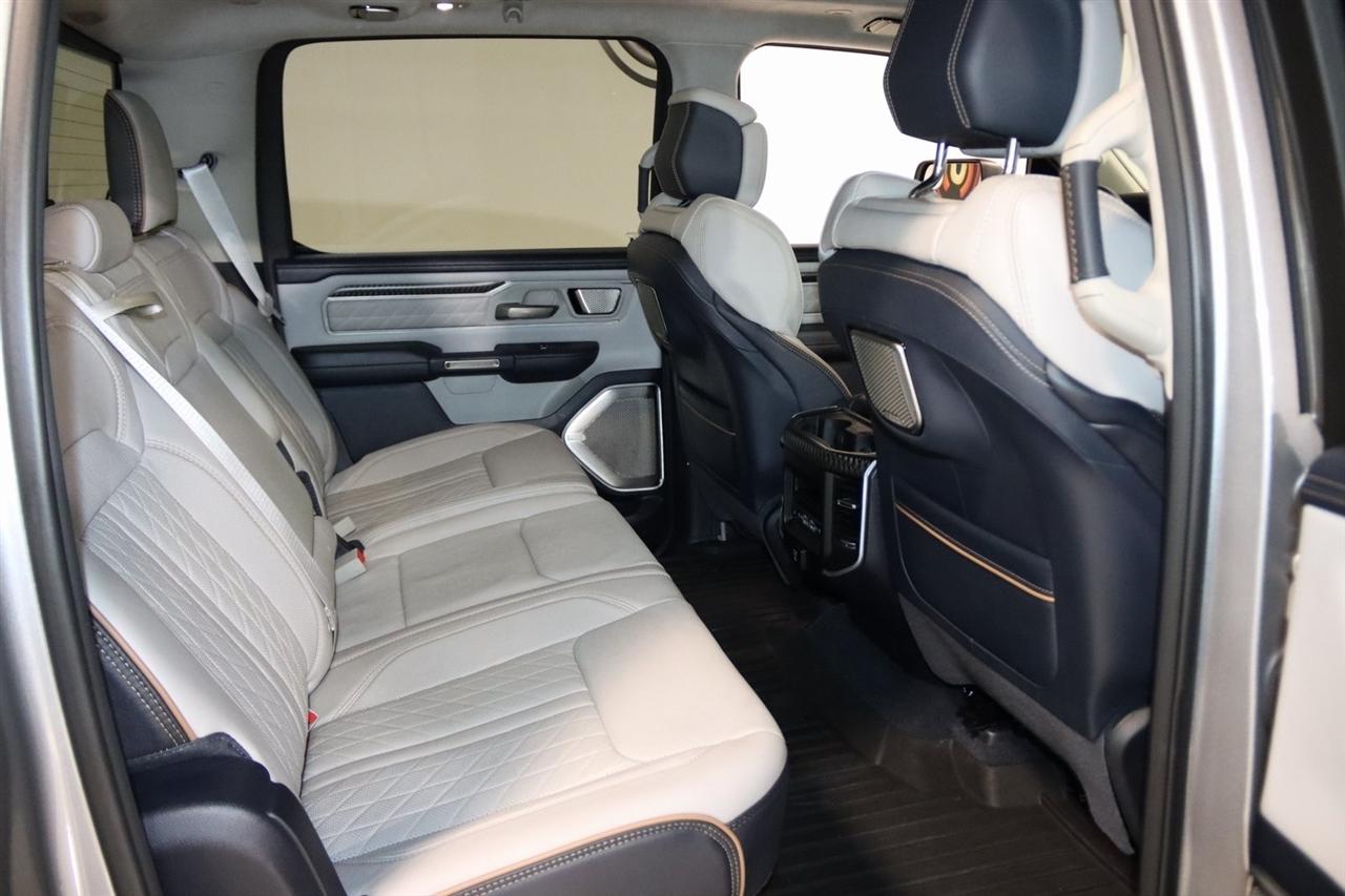 Navigation, Bluetooth, Back Up Camera, Panoramic Roof, Towing, Heated Seats, Touch Screen, 12-Way/1-Way Trailer Connector, 3.92 Rear Axle Ratio, 4-Wheel Disc Brakes, ABS brakes, Adjustable pedals, Air Conditioning, Alloy wheels, AM/FM radio: SiriusXM with 360L, Apple CarPlay/Android Auto, Audio memory, Auto High-beam Headlights, Auto Power-Folding Mirrors, Auto-dimming door mirrors, Auto-Dimming Exterior Driver Mirror, Auto-dimming Rear-View mirror, Auto-leveling suspension, Automatic temperature control, Bodyside moldings, Brake assist, Bumpers: body-color, Chrome Exterior Mirrors, Compass, Delay-off headlights, Driver door bin, Driver vanity mirror, Dual front impact airbags, Dual front side impact airbags, Electronic Stability Control, Exterior Mirrors Courtesy Lamps, Exterior Mirrors w/Heating Element, Exterior Mirrors w/Memory, Exterior Mirrors w/Supplemental Signals, Front anti-roll bar, Front Bucket Seats, Front Center Armrest w/Storage, Front dual zone A/C, Front fog lights, Front reading lights, Front wheel independent suspension, Fully automatic headlights, Garage door transmitter, Heads-Up Display, Heated door mirrors, Heated front seats, Heated rear seats, Heated steering wheel, Illuminated entry, Leather steering wheel, Low tire pressure warning, Memory seat, Multi-Function Tailgate, Navigation System, Occupant sensing airbag, Outside temperature display, Overhead airbag, Overhead console, Panic alarm, Passenger door bin, Passenger vanity mirror, Pedal memory, Power adjustable front head restraints, Power door mirrors, Power driver seat, Power moonroof, Power passenger seat, Power steering, Power windows, Premium Leather Bucket Seats, Quick Order Package 22V Tungsten, Radio data system, Radio: Uconnect 5 Nav w/14.4" Display, Rain sensing wipers, RAM's Head Badge, Rear anti-roll bar, Rear reading lights, Rear seat center armrest, Rear step bumper, Rear window defroster, Remote keyless entry, Remote Tailgate Release, Security system, Speed control, Split folding rear seat, Steering wheel mounted audio controls, Tachometer, Telescoping steering wheel, Tilt steering wheel, Traction control, Trailer Brake Control, Trailer Light Check, Trailer Reverse Steering Control, Trailer Tire Pressure Monitoring System, Trailer Tow Group, Trip computer, Turn signal indicator mirrors, Variably intermittent wipers, Ventilated front seats, Ventilated rear seats, Voltmeter, Wheels: 22" x 9" Polish/Painted w/Inserts. CARFAX One-Owner. Priced below KBB Fair Purchase Price!