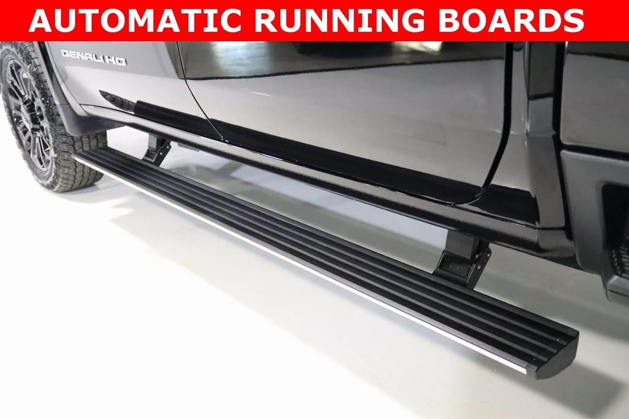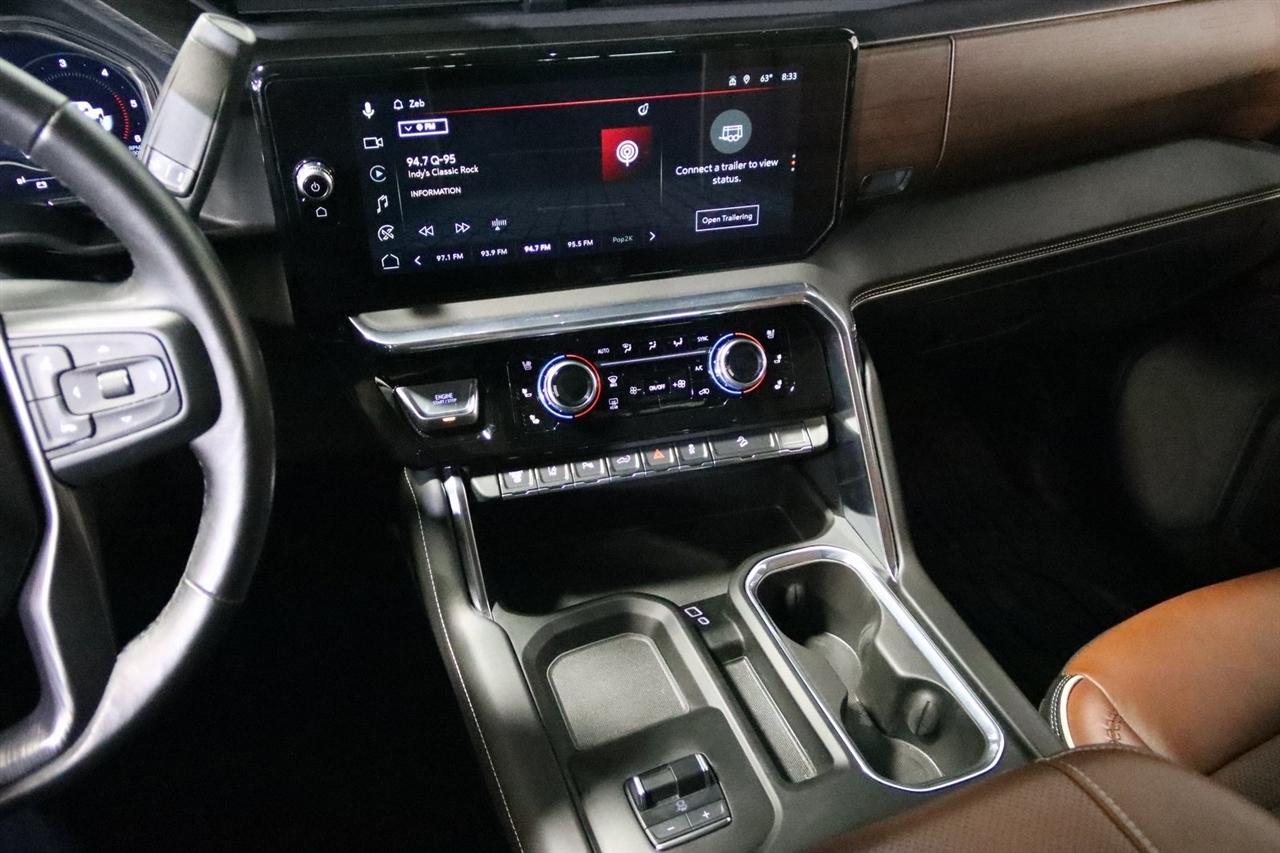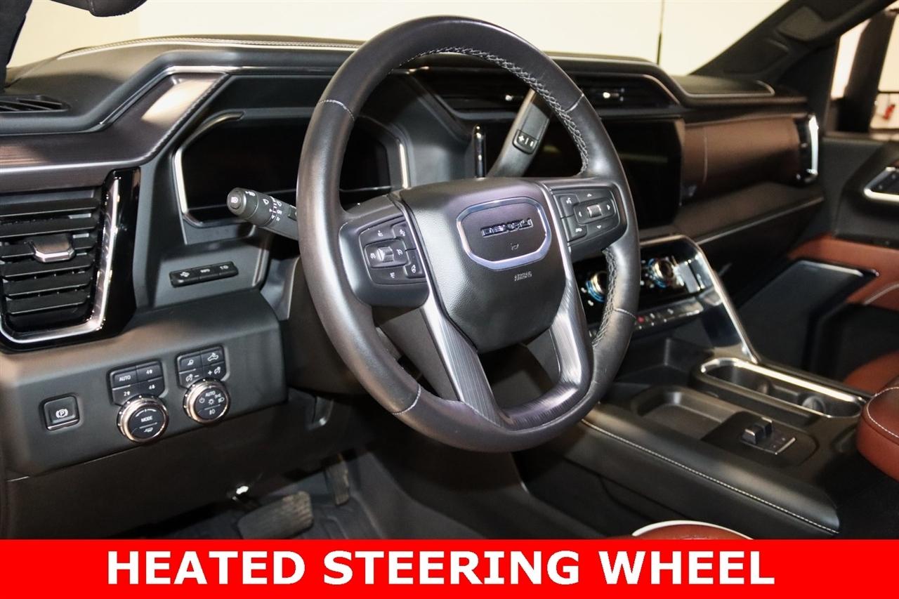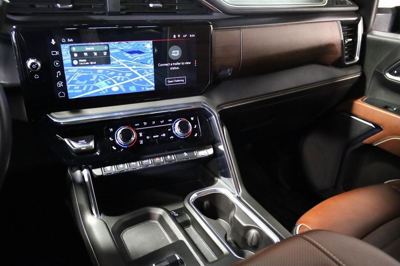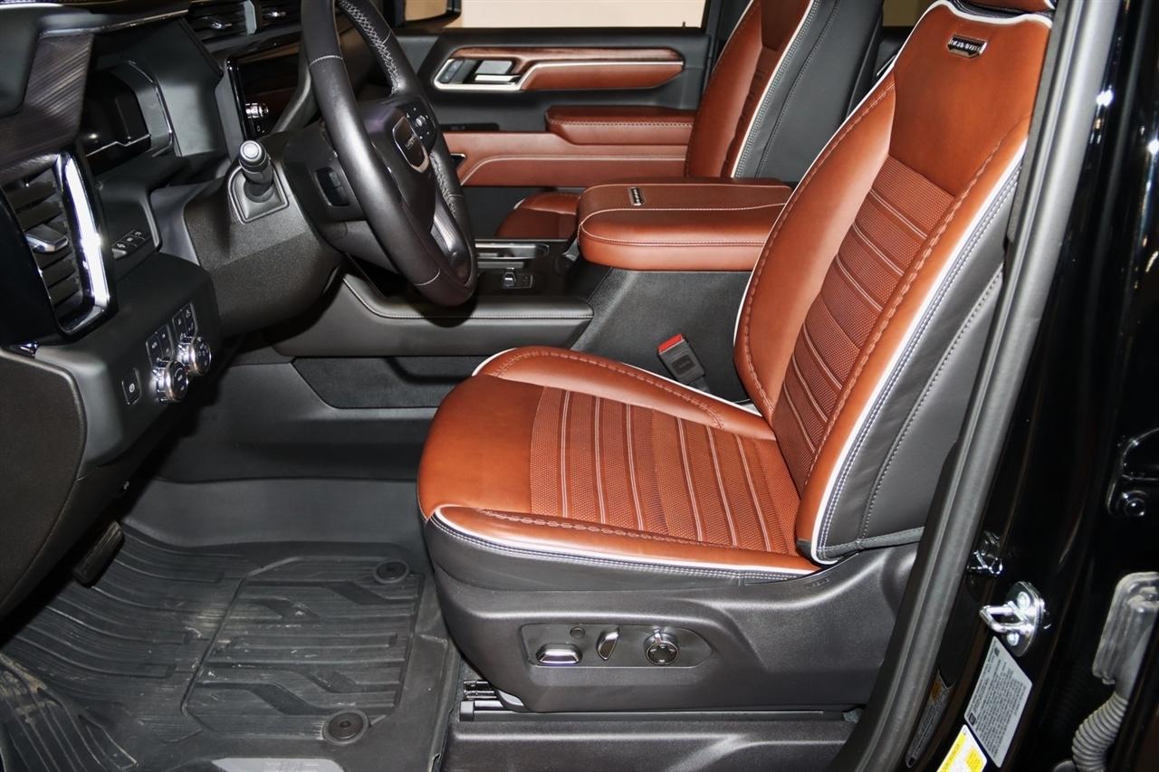 Navigation, Bluetooth, Back Up Camera, Heated Seats, Touch Screen, 120-Volt Bed Mounted Power Outlet, 120-Volt Instrument Panel Power Outlet, 16-Way Power Driver Seat Adjuster w/Lumbar, 16-Way Power Passenger Seat Adjuster w/Lumbar, 2 Charge-Only Rear USB Ports, 2 Charge/Data USB Ports Inside Center Console, 2 USB Ports, 2-Speed Active Transfer Case, 220-Amp Alternator, 3.42 Axle Ratio, 4-Wheel Disc Brakes, ABS brakes, Air Conditioning, Alloy wheels, Apple CarPlay/Android Auto, Auto High-beam Headlights, Auto-dimming door mirrors, Auto-dimming Rear-View mirror, Automatic Emergency Braking, Automatic temperature control, Bed View Camera w/2 Trailer Camera Provisions, Block heater, Body Color Wheel Arch Moldings (LPO), Bose Premium Series 12-Speaker System, Brake assist, Buckle to Drive, Bumpers: body-color, Compass, Deep-Tinted Glass, Delay-off headlights, Driver door bin, Driver Memory, Driver vanity mirror, Dual front impact airbags, Dual front side impact airbags, Dual Heavy-Duty 70 Amp Battery, Electric Rear-Window Defogger, Electronic Stability Control, Emergency communication system: OnStar and GMC connected services capable, Floor-Mounted Center Console, Following Distance Indicator, Forward Collision Alert, Front anti-roll bar, Front Bucket Seats, Front Center Armrest, Front dual zone A/C, Front fog lights, Front Pedestrian Braking, Front Rain-Sensing Wipers, Front reading lights, Front wheel independent suspension, Full Grain Leather Seat Trim, Fully automatic headlights, Garage door transmitter, Genuine wood dashboard insert, Genuine wood door panel insert, GMC Connected Access Capable, Gooseneck/5th Wheel Prep Package, HD Surround Vision, Heads-Up Display, Heated 2nd Row Outboard Seats, Heated door mirrors, Heated Driver & Front Outboard Passenger Seats, Heated front seats, Heated rear seats, Heated steering wheel, Hill Descent Control, Hitch Guidance w/Hitch View, Illuminated entry, In-Vehicle Trailering System App, Inside Rearview Auto-Dimming Rear Camera Mirror, Integrated Trailer Brake Controller, IntelliBeam Automatic High Beam On/Off, Keyless Open & Start, Lane Departure Warning System, Leather steering wheel, LED Cargo Area Lighting, LED Smoked Amber Roof Marker Lamps, Low tire pressure warning, Manual Tilt-Wheel/Telescoping Steering Column, Memory seat, Multicolor 15" Diagonal Head-Up Display, Navigation System, Occupant sensing airbag, Off-Road Suspension, OnStar & GMC Connected Services Capable, Outside temperature display, Overhead airbag, Overhead console, Panic alarm, Passenger door bin, Passenger vanity mirror, Pickup Box, Power door mirrors, Power driver seat, Power Front Passenger Windows w/Express Up/Down, Power moonroof, Power passenger seat, Power Sliding Rear Window w/Defogger, Power steering, Power Sunroof, Power windows, Preferred Equipment Group 5SB, Premium audio system: Premium GMC Infotainment System, Push Button Start, Radio: AM/FM w/Premium GMC Infotainment System, Rain sensing wipers, Rear Cross Traffic Alert, Rear reading lights, Rear seat center armrest, Rear step bumper, Rear Wheelhouse Liners, Rear window defroster, Remote keyless entry, Remote Vehicle Starter System, Safety Alert Seat, Security system, Signature Denali Grille in Vadar Chrome, SiriusXM w/360L, Speed control, Speed-sensing steering, Split folding rear seat, Spray-On Bedliner w/Denali Logo, Steering Wheel Audio Controls, Steering wheel mounted audio controls, Tachometer, Technology Package, Telescoping steering wheel, Tilt steering wheel, Traction control, Trailer Cam Provisions & Trailer Viewing Software, Trailer Side Blind Zone Alert, Trailer Tire Pressure Monitor Sensors, Trip computer, Turn signal indicator mirrors, Ultrasonic Front & Rear Park Assist, Unauthorized Entry Theft-Deterrent System, Universal Home Remote, Variably intermittent wipers, Ventilated Driver & Front Passenger Seats, Ventilated front seats, Voltmeter, Wheels: 22" High Gloss Black Aluminum (LPO), Wireless Charging, Wireless Phone Projection, X31