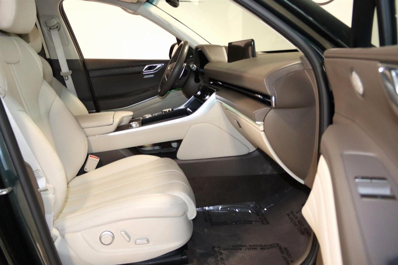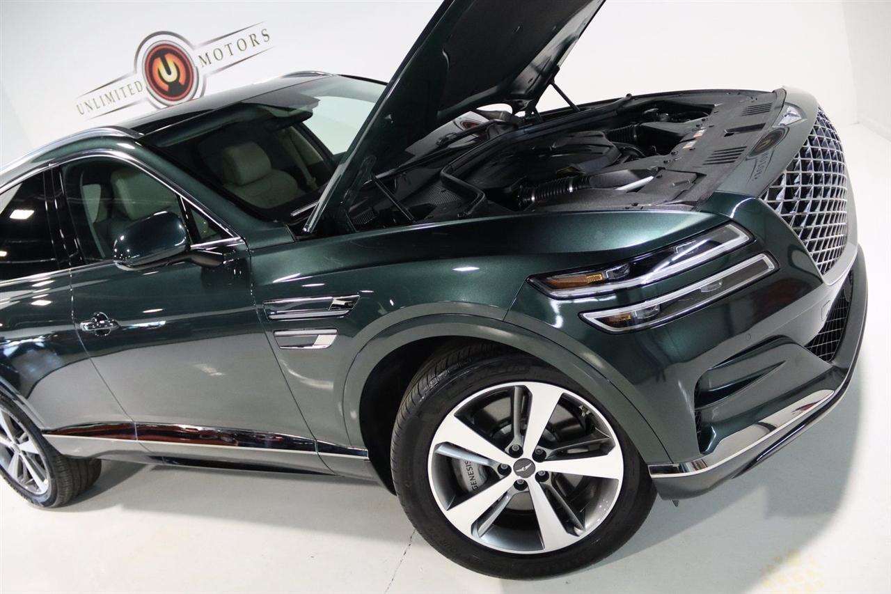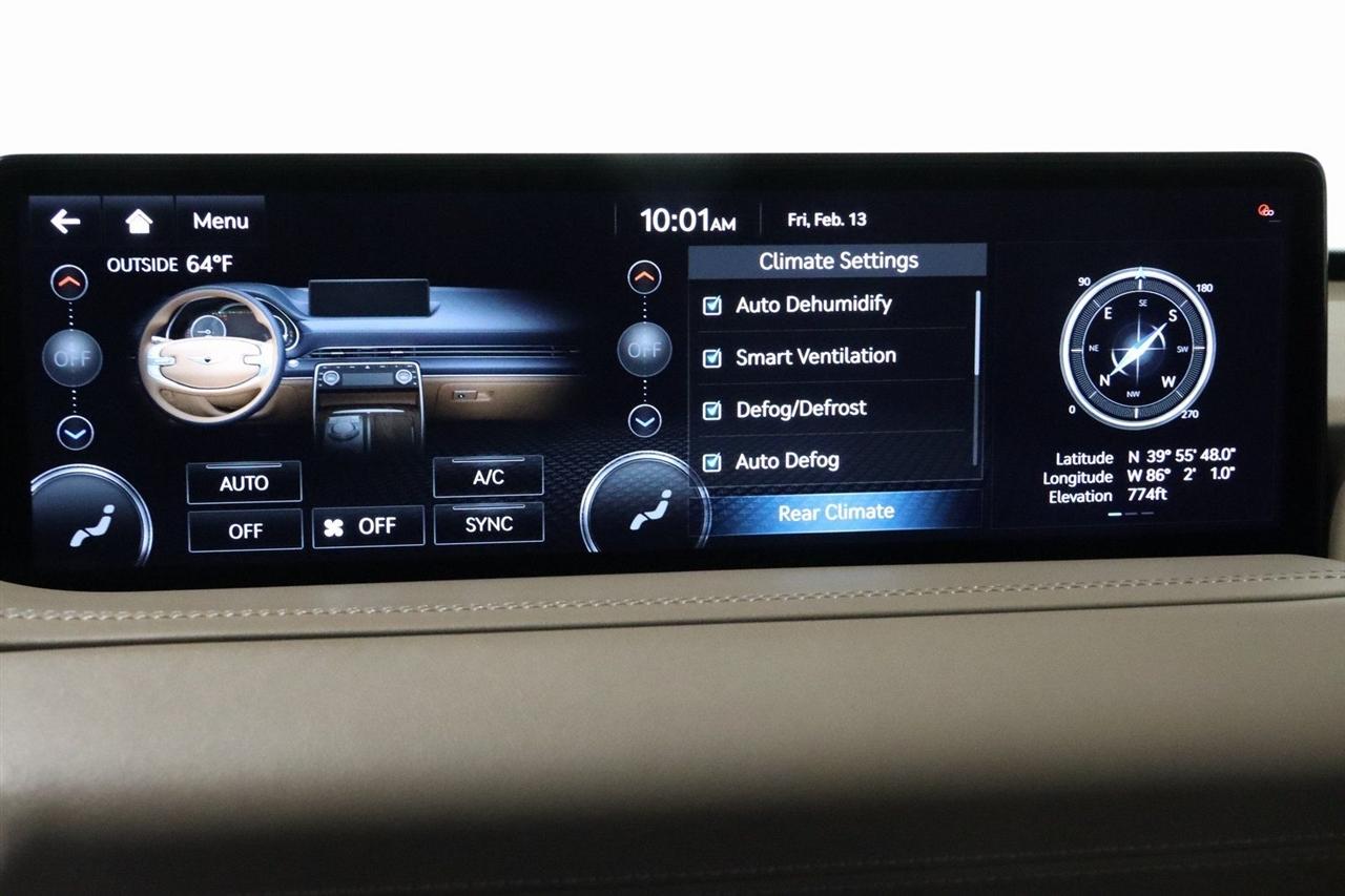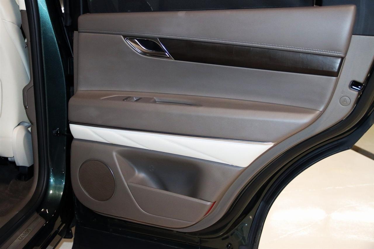 Navigation, Bluetooth, Back Up Camera, Panoramic Roof, Heated Seats, Touch Screen, 12 Speakers, 3.909 Axle Ratio, 4-Wheel Disc Brakes, ABS brakes, Adaptive suspension, Air Conditioning, Alloy wheels, AM/FM radio: SiriusXM, Android Auto & Apple CarPlay, Anti-whiplash front head restraints, Auto High-beam Headlights, Auto tilt-away steering wheel, Auto-dimming door mirrors, Auto-dimming Rear-View mirror, Automatic temperature control, Brake assist, Bumpers: body-color, Compass, Delay-off headlights, Driver door bin, Driver vanity mirror, Dual front impact airbags, Dual front side impact airbags, Electronic Stability Control, Emergency communication system: Genesis Connected Services, Exterior Parking Camera Rear, Four wheel independent suspension, Front anti-roll bar, Front Bucket Seats, Front Center Armrest, Front dual zone A/C, Front reading lights, Fully automatic headlights, Garage door transmitter: HomeLink, Genuine wood console insert, Genuine wood dashboard insert, Genuine wood door panel insert, Heated & Ventilated Front Bucket Seats, Heated door mirrors, Heated front seats, Heated steering wheel, Illuminated entry, Knee airbag, Leather steering wheel, Leatherette Seating Surfaces, Low tire pressure warning, Memory seat, Navigation System, Occupant sensing airbag, Outside temperature display, Overhead airbag, Overhead console, Panic alarm, Passenger door bin, Passenger vanity mirror, Power door mirrors, Power driver seat, Power Liftgate, Power moonroof, Power passenger seat, Power steering, Power windows, Radio data system, Radio:14.5" Navigation System w/AM/FM/HD Radio, Rain sensing wipers, Rear air conditioning, Rear anti-roll bar, Rear reading lights, Rear seat center armrest, Rear side impact airbag, Rear window defroster, Rear window wiper, Remote keyless entry, Security system, Speed control, Speed-sensing steering, Speed-Sensitive Wipers, Split folding rear seat, Spoiler, Steering wheel memory, Steering wheel mounted audio controls, Tachometer, Telescoping steering wheel, Tilt steering wheel, Traction control, Trip computer, Turn signal indicator mirrors, Variably intermittent wipers, Ventilated front seats, Wheels: 20" x 8.5J Medium Metallic Gray Alloy. CARFAX One-Owner. Odometer is 11447 miles below market average! Priced below KBB Fair Purchase Price!