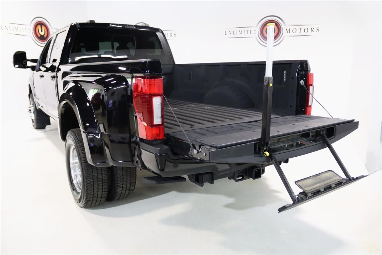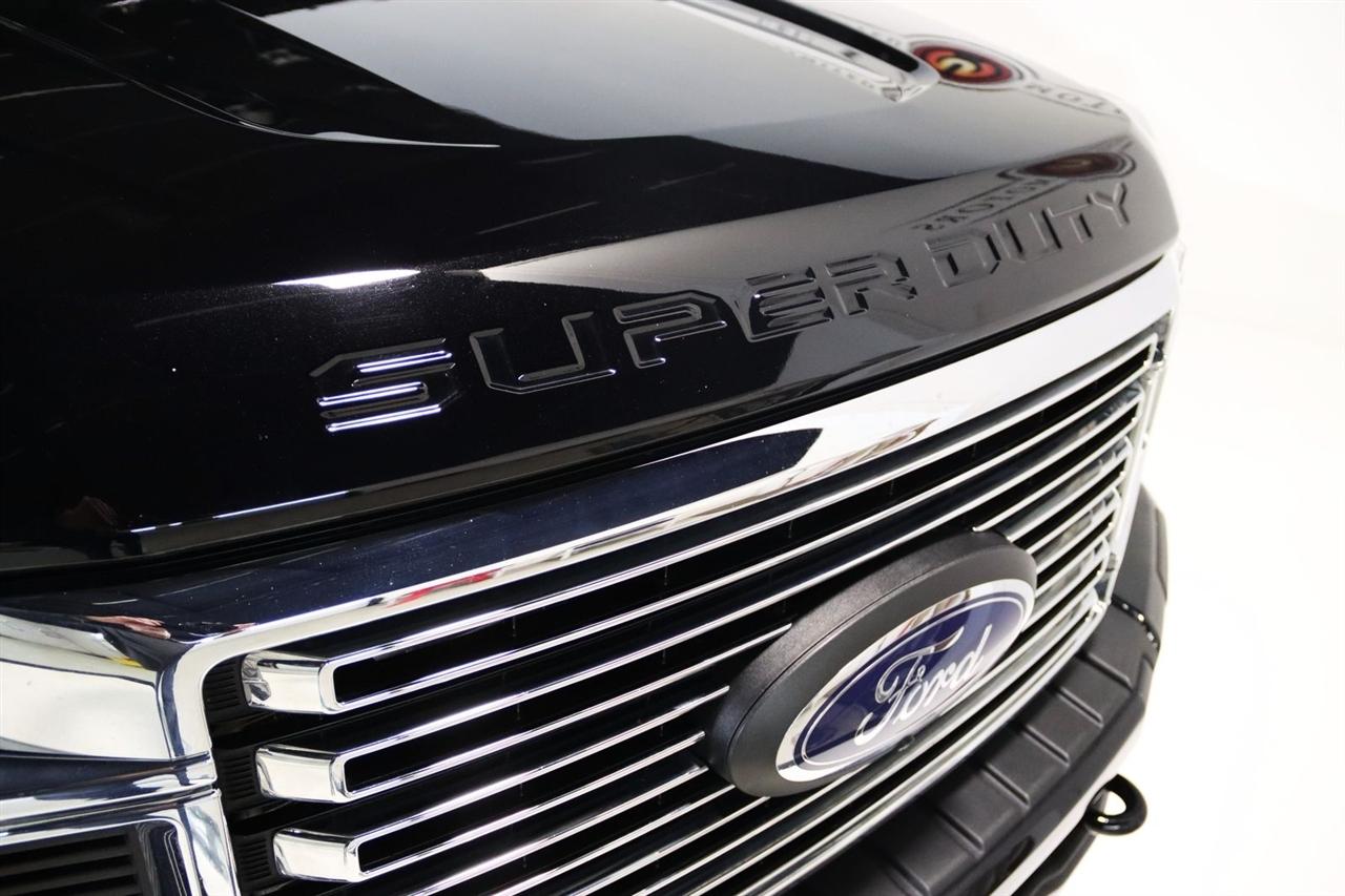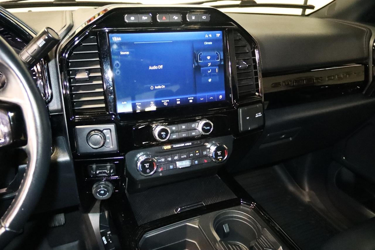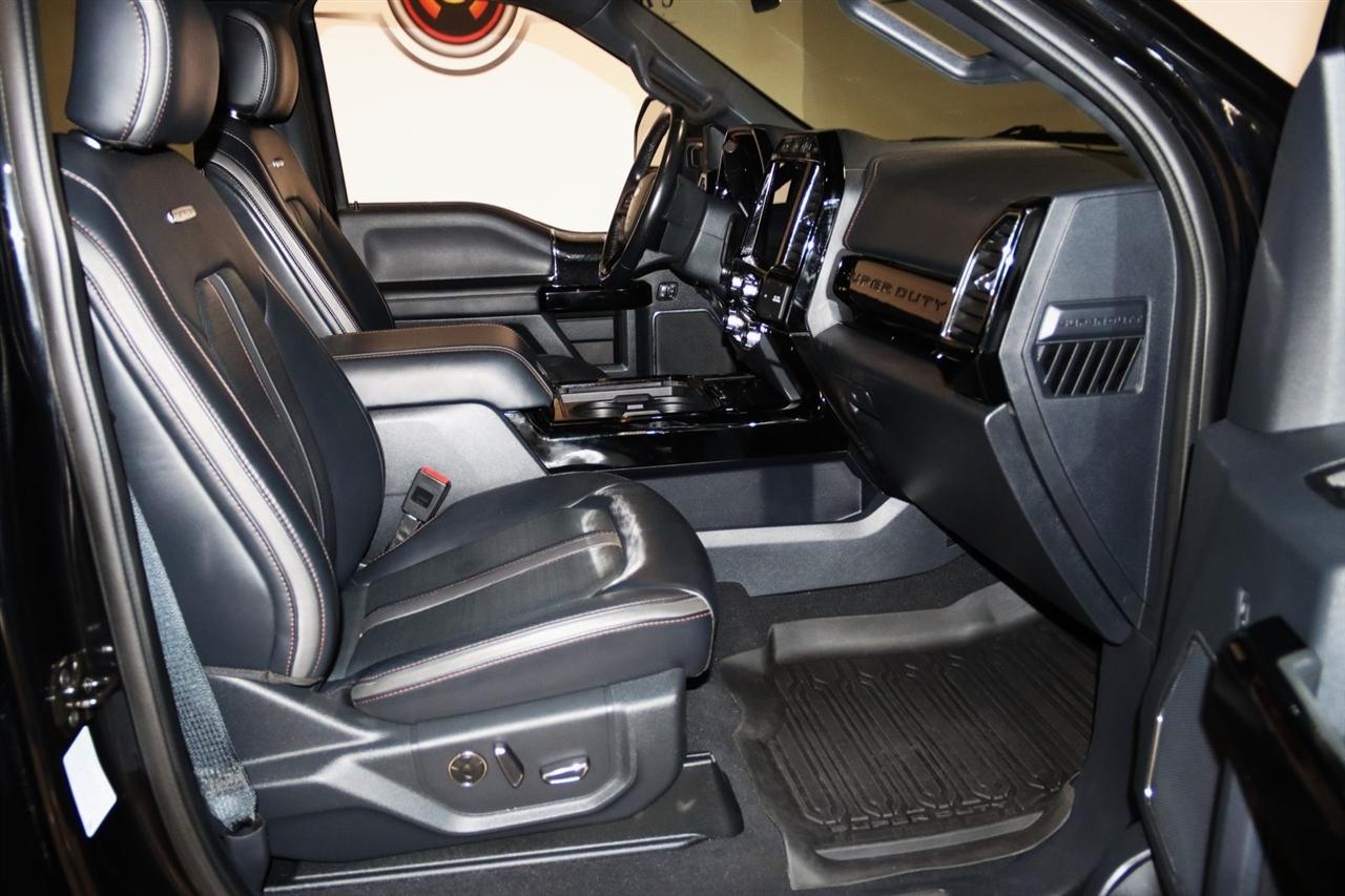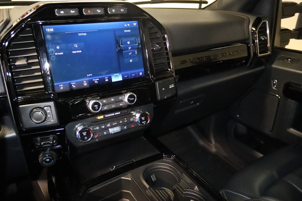 Navigation, Bluetooth, Back Up Camera, Panoramic Roof, Towing, Touch Screen, 10 Speakers, 17" Forged Polished Aluminum Wheels, 397 Amp Alternator, 4-Wheel Disc Brakes, 5th Wheel/Gooseneck Hitch Prep Package, ABS brakes, Adjustable pedals, Advanced Security Pack Inclination Sensor Removal, Air Conditioning, Alloy wheels, AM/FM radio: SiriusXM with 360L, Auto High-beam Headlights, Auto tilt-away steering wheel, Auto-dimming Rear-View mirror, Automatic temperature control, Bed Step, Brake assist, Bumpers: body-color, Compass, Delay-off headlights, Driver door bin, Driver vanity mirror, Dual front impact airbags, Dual front side impact airbags, Dual rear wheels, Electronic Stability Control, Emergency communication system: SYNC 4 911 Assist, Engine Block Heater, Exterior Parking Camera Rear, Flow-Through Console, Front anti-roll bar, Front Bucket Seats, Front Center Armrest, Front dual zone A/C, Front fog lights, Front reading lights, Fully automatic headlights, FX4 Off-Road Package, Garage door transmitter, Gooseneck Hitch Kit (Pre-Installed), GVWR: 14,000 lb Payload Package, Heated door mirrors, Heated front seats, Heated rear seats, Heated steering wheel, Heavy-Service Front Suspension Package, Hill Descent Control, Illuminated entry, Leather steering wheel, Limited Slip w/3.55 Axle Ratio, Low tire pressure warning, Memory seat, Navigation system: Connected Navigation, Off-Road Specifically Tuned Shock Absorbers, Order Code 723A, Outside temperature display, Overhead airbag, Overhead console, Panic alarm, Passenger door bin, Passenger vanity mirror, Pedal memory, Power door mirrors, Power driver seat, Power passenger seat, Power steering, Power windows, Radio data system, Radio: B&O Sound System by Bang & Olufsen, Rain sensing wipers, Rapid-Heat Supplemental Cab Heater, Rear anti-roll bar, Rear Parking Sensors, Rear reading lights, Rear seat center armrest, Rear step bumper, Rear window defroster, Remote keyless entry, Security system, SiriusXM Radio w/360L, Speed control, Speed-sensing steering, Split folding rear seat, Steering wheel memory, Steering wheel mounted A/C controls, Steering wheel mounted audio controls, Stowable Loading Ramps (Pre-Installed), SYNC 4 w/Enhanced Voice Recognition, Tachometer, Telescoping steering wheel, Tilt steering wheel, Traction control, Trip computer, Turn signal indicator mirrors, Twin Panel Power Moonroof, Unique FX4 Off-Road Box Decal, Unique Platinum Leather 40/Console/40 Seats, Upfitter Switches (6), Variably intermittent wipers, Ventilated front seats. CARFAX One-Owner.
