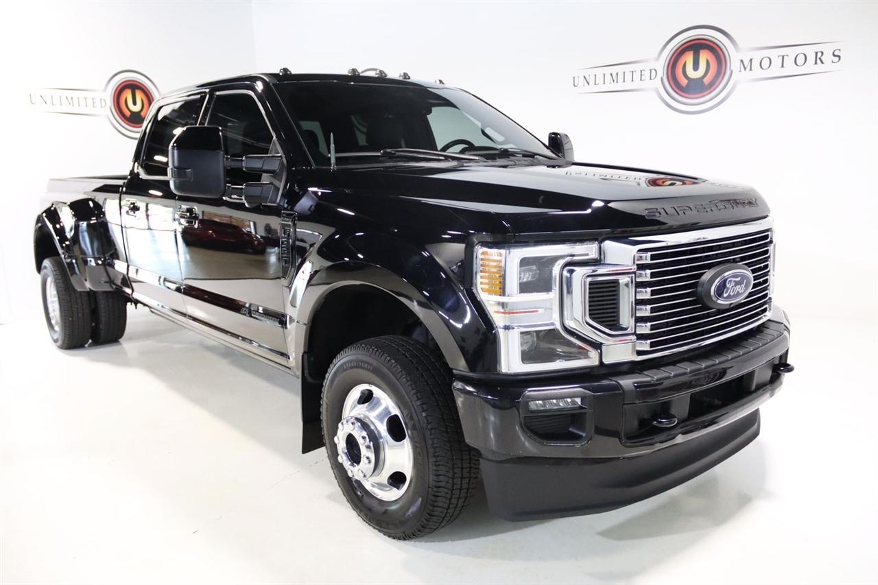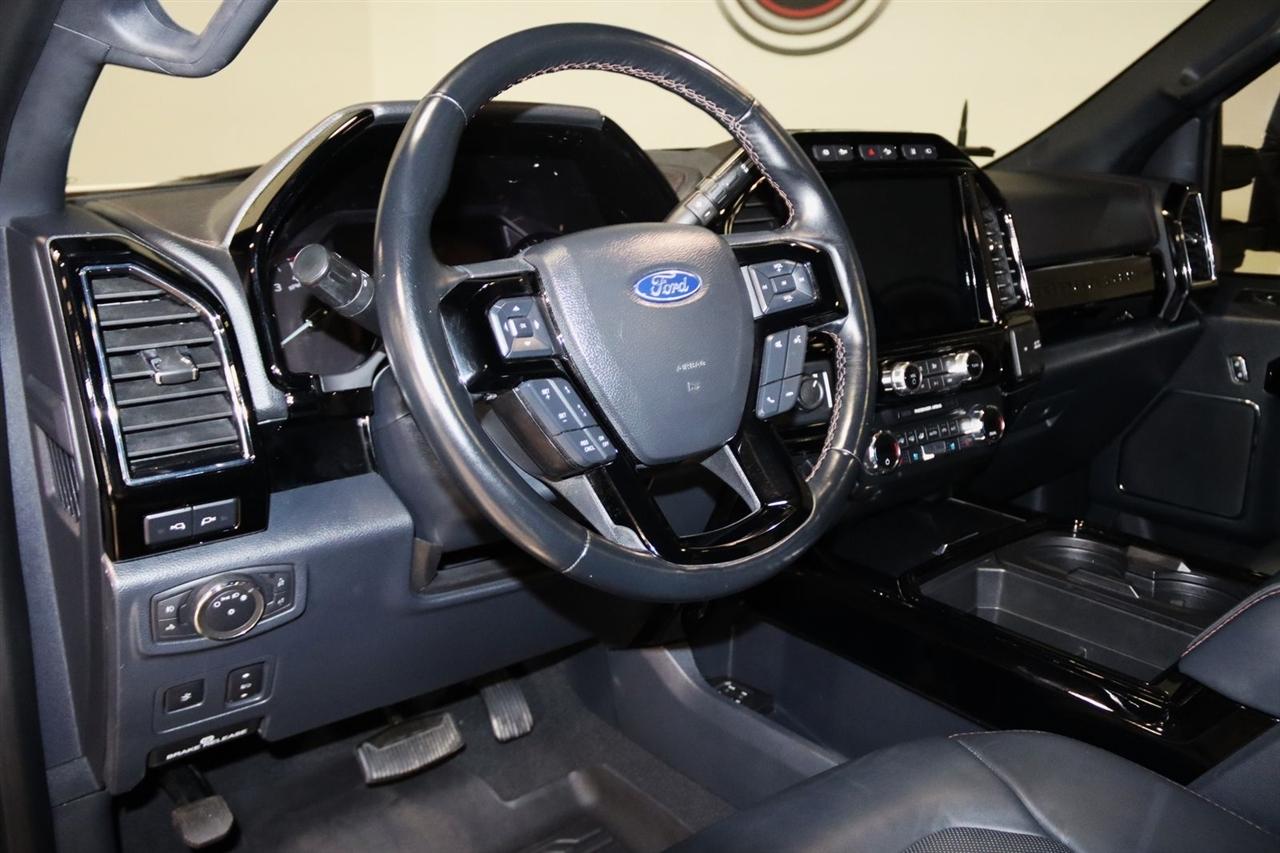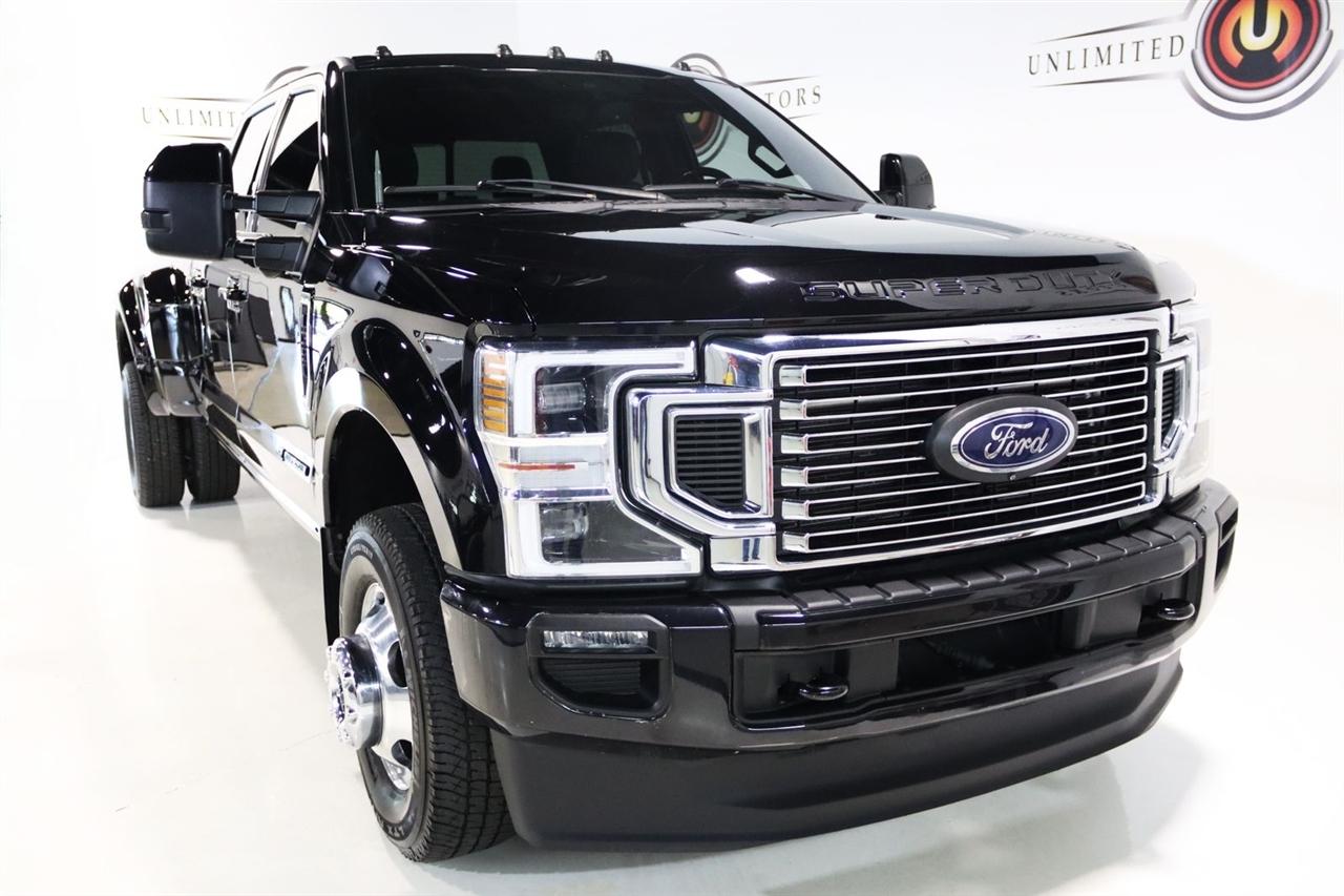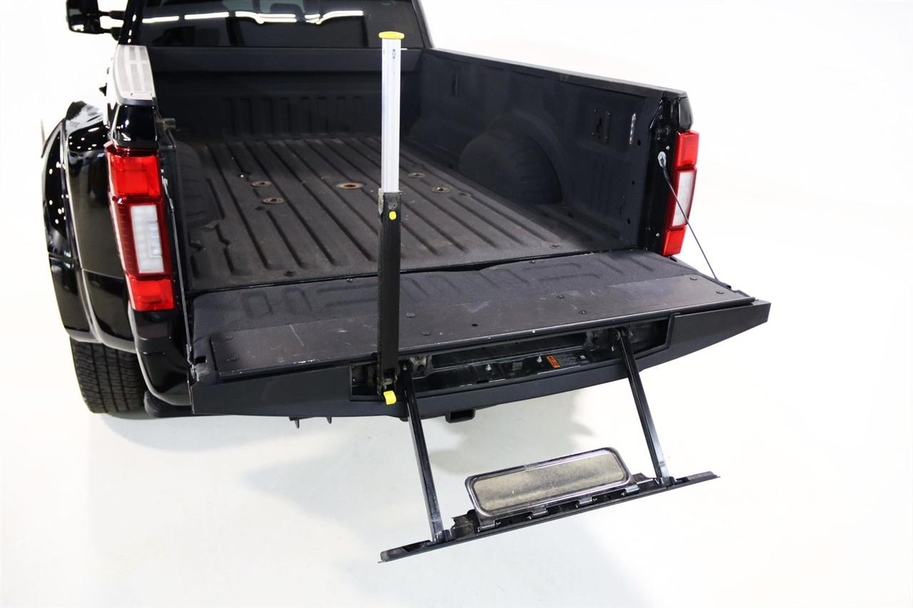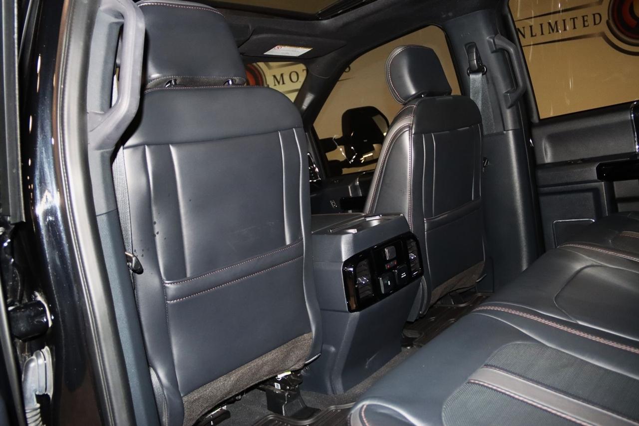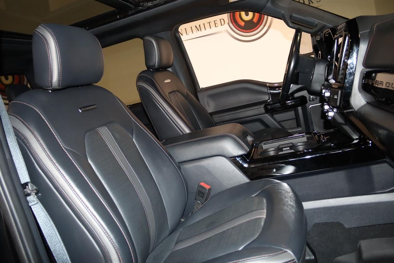 Navigation, Bluetooth, Back Up Camera, Panoramic Roof, Towing, Touch Screen, 10 Speakers, 17" Forged Polished Aluminum Wheels, 397 Amp Alternator, 4-Wheel Disc Brakes, 5th Wheel/Gooseneck Hitch Prep Package, ABS brakes, Adjustable pedals, Advanced Security Pack Inclination Sensor Removal, Air Conditioning, Alloy wheels, AM/FM radio: SiriusXM with 360L, Auto High-beam Headlights, Auto tilt-away steering wheel, Auto-dimming Rear-View mirror, Automatic temperature control, Bed Step, Brake assist, Bumpers: body-color, Compass, Delay-off headlights, Driver door bin, Driver vanity mirror, Dual front impact airbags, Dual front side impact airbags, Dual rear wheels, Electronic Stability Control, Emergency communication system: SYNC 4 911 Assist, Engine Block Heater, Exterior Parking Camera Rear, Flow-Through Console, Front anti-roll bar, Front Bucket Seats, Front Center Armrest, Front dual zone A/C, Front fog lights, Front reading lights, Fully automatic headlights, FX4 Off-Road Package, Garage door transmitter, Gooseneck Hitch Kit (Pre-Installed), GVWR: 14,000 lb Payload Package, Heated door mirrors, Heated front seats, Heated rear seats, Heated steering wheel, Heavy-Service Front Suspension Package, Hill Descent Control, Illuminated entry, Leather steering wheel, Limited Slip w/3.55 Axle Ratio, Low tire pressure warning, Memory seat, Navigation system: Connected Navigation, Off-Road Specifically Tuned Shock Absorbers, Order Code 723A, Outside temperature display, Overhead airbag, Overhead console, Panic alarm, Passenger door bin, Passenger vanity mirror, Pedal memory, Power door mirrors, Power driver seat, Power passenger seat, Power steering, Power windows, Radio data system, Radio: B&O Sound System by Bang & Olufsen, Rain sensing wipers, Rapid-Heat Supplemental Cab Heater, Rear anti-roll bar, Rear Parking Sensors, Rear reading lights, Rear seat center armrest, Rear step bumper, Rear window defroster, Remote keyless entry, Security system, SiriusXM Radio w/360L, Speed control, Speed-sensing steering, Split folding rear seat, Steering wheel memory, Steering wheel mounted A/C controls, Steering wheel mounted audio controls, Stowable Loading Ramps (Pre-Installed), SYNC 4 w/Enhanced Voice Recognition, Tachometer, Telescoping steering wheel, Tilt steering wheel, Traction control, Trip computer, Turn signal indicator mirrors, Twin Panel Power Moonroof, Unique FX4 Off-Road Box Decal, Unique Platinum Leather 40/Console/40 Seats, Upfitter Switches (6), Variably intermittent wipers, Ventilated front seats. CARFAX One-Owner.