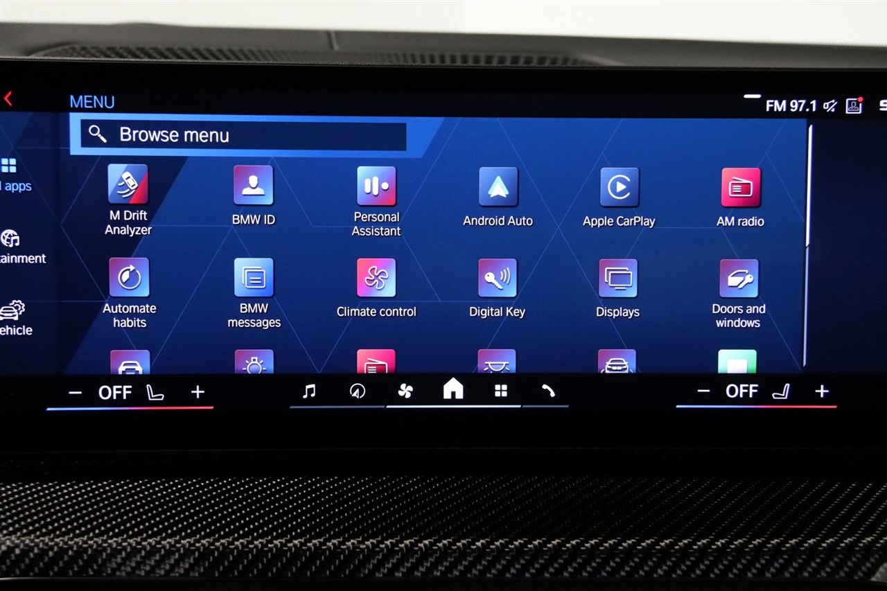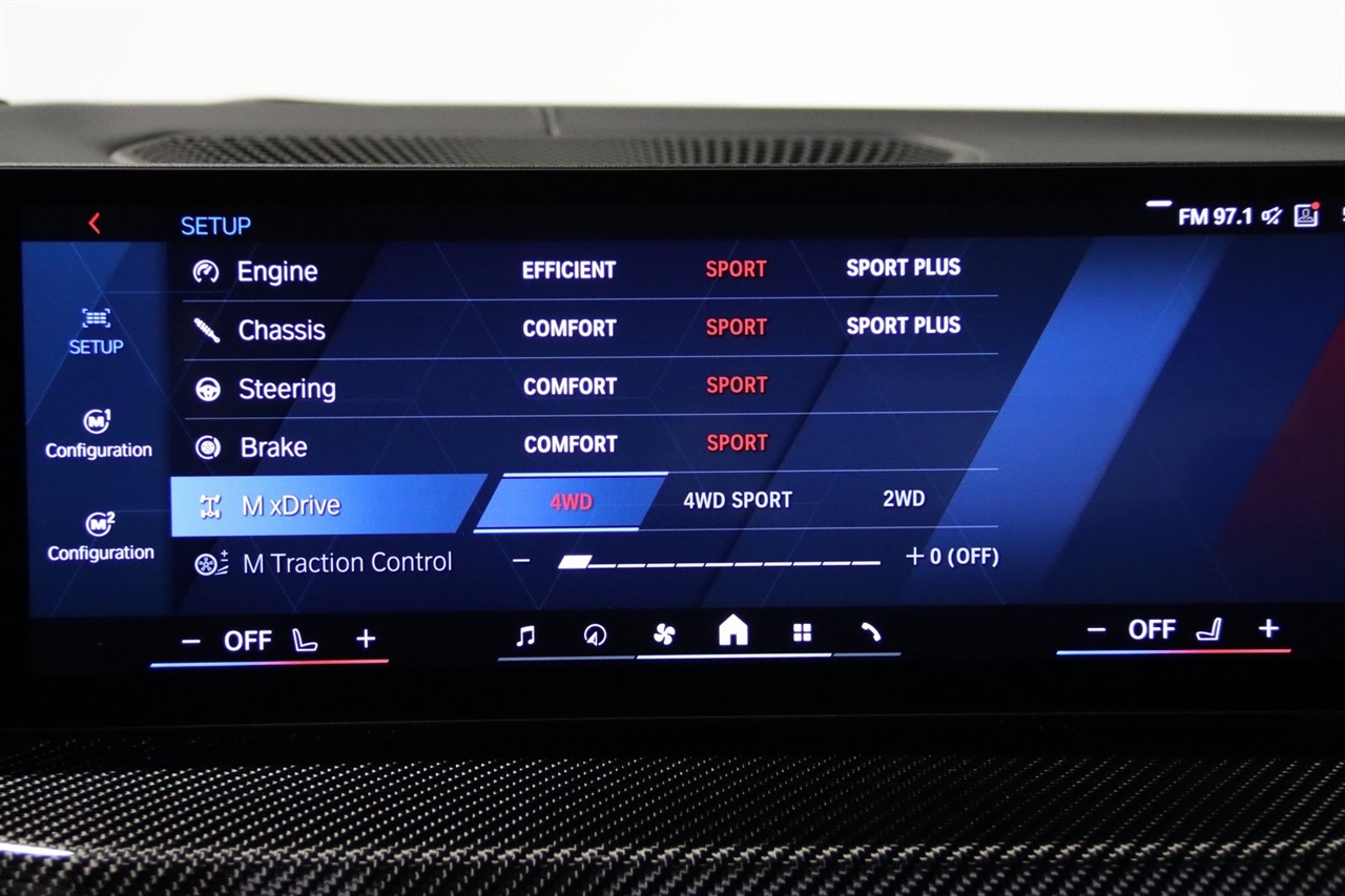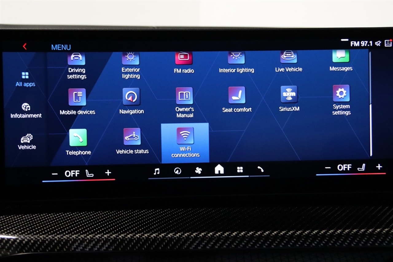 Navigation, Bluetooth, Back Up Camera, Heated Seats, Touch Screen, 16 Speakers, 4-Wheel Disc Brakes, ABS brakes, Adaptive suspension, Air Conditioning, Alloy wheels, AM/FM radio: SiriusXM with 360L, Apple CarPlay & Android Auto Compatibility, Audio memory, Auto High-beam Headlights, Auto-dimming door mirrors, Auto-dimming Rear-View mirror, Automatic temperature control, BMW Assist eCall, BMW TeleServices, Brake assist, Bumpers: body-color, Compass, Connected Package Pro, ConnectedDrive Services, Delay-off headlights, Driver door bin, Driver vanity mirror, Dual front impact airbags, Dual front side impact airbags, Electronic Stability Control, Emergency communication system: BMW Assist eCall, Exterior Parking Camera Rear, Four wheel independent suspension, Front anti-roll bar, Front Bucket Seats, Front Center Armrest, Front dual zone A/C, Front reading lights, Full Merino Leather Upholstery (X3), Fully automatic headlights, Garage door transmitter, harman/kardon Surround Sound System, harman/kardon® Speakers, Heads-Up Display, Heated door mirrors, Heated Front Seats, Heated front seats, HVAC memory, Illuminated entry, Knee airbag, Leather Shift Knob, Low tire pressure warning, M Carbon Bucket Seats, M Compound Brakes w/Black Calipers, Memory seat, Navigation, Navigation System, Occupant sensing airbag, Outside temperature display, Overhead airbag, Overhead console, Panic alarm, Passenger door bin, Passenger vanity mirror, Personal eSIM 5G, Power door mirrors, Power driver seat, Power Front Seats, Power passenger seat, Power steering, Power windows, Radio data system, Radio: AM/FM Audio System, Rain sensing wipers, Rear anti-roll bar, Rear reading lights, Rear seat center armrest, Rear window defroster, Remote keyless entry, Security system, SiriusXM w/360L, Speed control, Speed-sensing steering, Speed-Sensitive Wipers, Split folding rear seat, Spoiler, Sport steering wheel, Steering wheel mounted audio controls, Tachometer, Telescoping steering wheel, Tilt steering wheel, Traction control, Trip computer, Turn signal indicator mirrors, Variably intermittent wipers, Widescreen Display. CARFAX One-Owner.