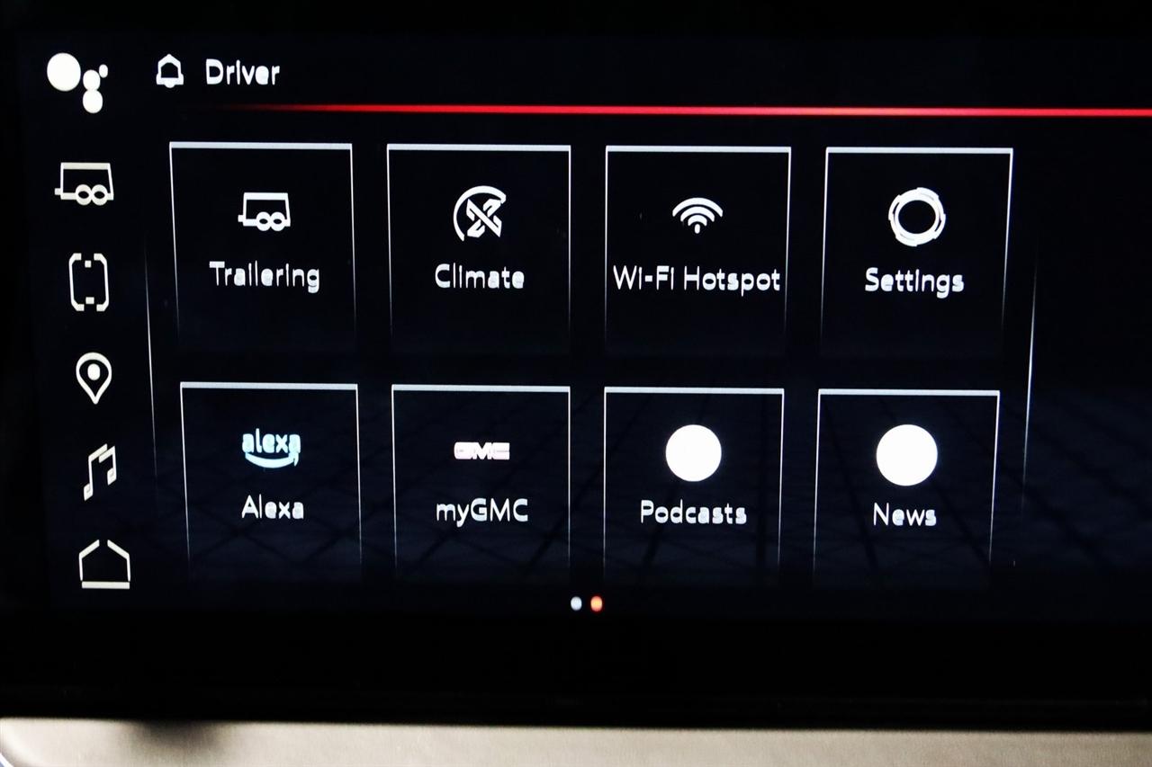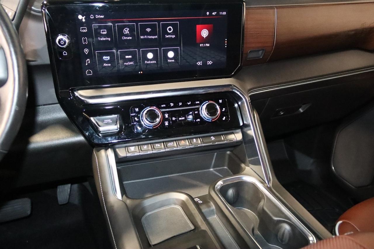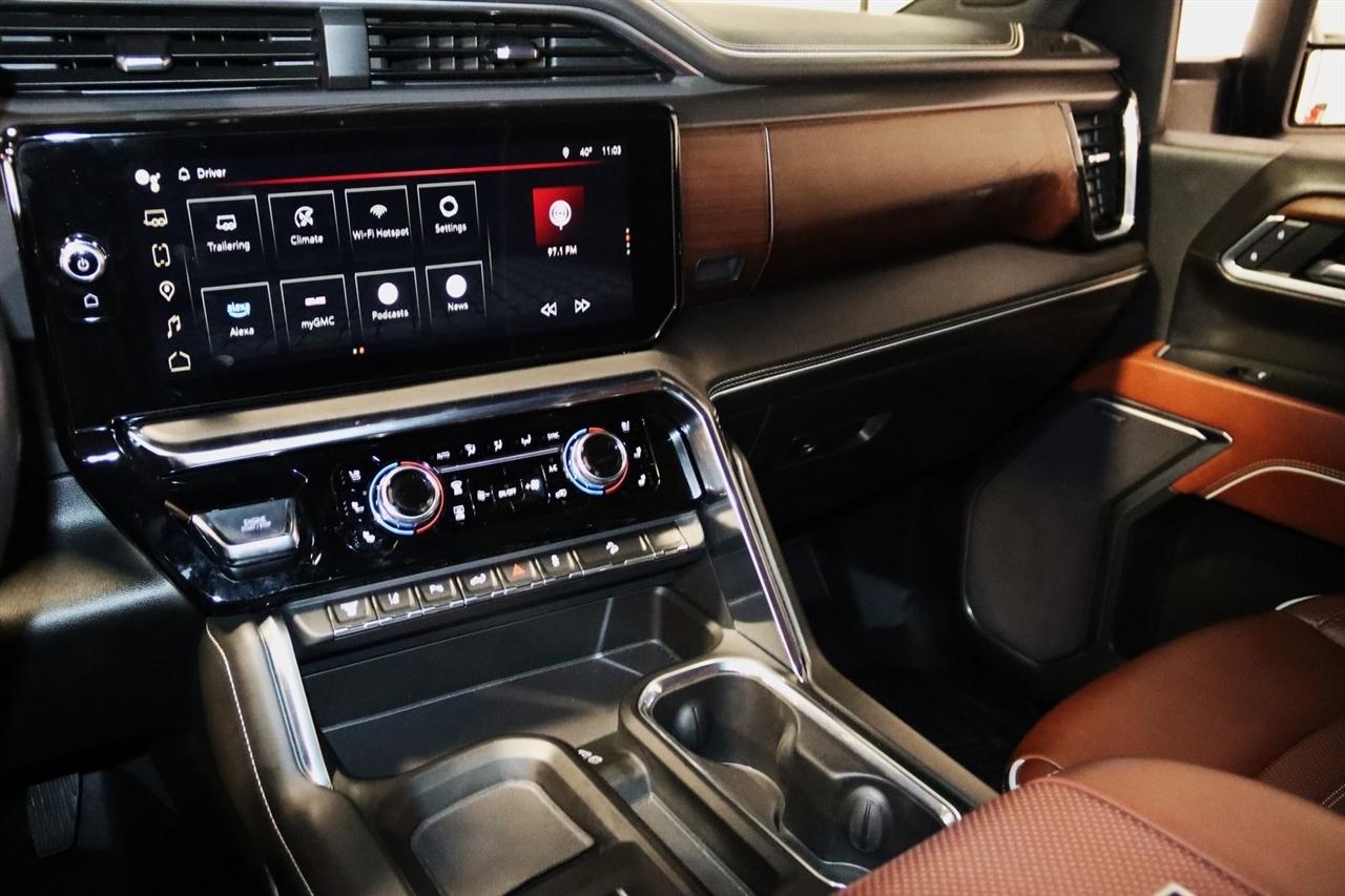 Navigation, Bluetooth, Sun/Moon Roof, Towing, Heated Seats, Touch Screen, 12 Speakers, 120-Volt Bed Mounted Power Outlet, 120-Volt Instrument Panel Power Outlet, 16-Way Power Driver Seat Adjuster w/Lumbar, 16-Way Power Passenger Seat Adjuster w/Lumbar, 2 Charge-Only Rear USB Ports, 2 Charge/Data USB Ports Inside Center Console, 2 USB Ports, 2-Speed Active Transfer Case, 220 Amp Alternator, 3.42 Rear Axle Ratio, 4-Wheel Disc Brakes, ABS brakes, Alloy wheels, AM/FM radio: SiriusXM with 360L, Apple CarPlay/Android Auto, Auto High-beam Headlights, Auto-dimming door mirrors, Auto-Dimming Inside Rearview Mirror w/Camera, Auto-dimming Rear-View mirror, Automatic Emergency Braking, Automatic temperature control, Bed View Camera w/2 Trailer Camera Provisions, Block heater, Bose Premium Series 12-Speaker System, Brake assist, Buckle to Drive, Bumpers: body-color, Compass, Console-Mounted Safe (LPO), Deep-Tinted Glass, Delay-off headlights, Driver door bin, Driver Memory, Driver vanity mirror, Dual front impact airbags, Dual front side impact airbags, Dual Heavy-Duty 70 Amp-Hr Battery, Electric Rear-Window Defogger, Electronic Stability Control, Emergency communication system: OnStar and GMC connected services capable, Floor-Mounted Center Console, Following Distance Indicator, Forward Collision Alert, Front anti-roll bar, Front Bucket Seats, Front Center Armrest, Front dual zone A/C, Front fog lights, Front License Plate Kit, Front Pedestrian Braking, Front Rain-Sensing Wipers, Front reading lights, Front wheel independent suspension, Full Grain Leather Seat Trim, Fully automatic headlights, Garage door transmitter, Genuine wood dashboard insert, Genuine wood door panel insert, GMC Premium 13.4" Diagonal Information Display, Gooseneck/5th Wheel Prep Package, HD Surround Vision, Heads-Up Display, Heated 2nd Row Outboard Seats, Heated door mirrors, Heated Driver & Front Outboard Passenger Seats, Heated front seats, Heated rear seats, Heated steering wheel, Hitch Guidance w/Hitch View, Illuminated entry, In-Vehicle Trailering App, Integrated Trailer Brake Controller, IntelliBeam Automatic High Beam On/Off, Keyless Open & Start, Lane Departure Warning System, Leather steering wheel, LED Cargo Area Lighting, LED Smoked Amber Roof Marker Lamps, Low tire pressure warning, Manual Tilt-Wheel/Telescoping Steering Column, Memory seat, Multicolor 15" Diagonal Head-Up Display, Navigation System, Occupant sensing airbag, Outside temperature display, Overhead airbag, Overhead console, Panic alarm, Passenger door bin, Passenger vanity mirror, Pickup Bed, Power door mirrors, Power driver seat, Power Front Windows w/Passenger Express Up/Down, Power moonroof, Power passenger seat, Power Sliding Rear Window w/Defogger, Power steering, Power Sunroof, Power windows, Preferred Equipment Group 5SB, Premium audio system: Premium GMC Infotainment System, ProGrade Trailering System, Push Button Start, Radio: AM/FM w/Premium GMC Infotainment System, Rain sensing wipers, Rear Cross Traffic Alert, Rear reading lights, Rear seat center armrest, Rear step bumper, Rear Underseat Storage (LPO), Rear Wheelhouse Liners, Rear window defroster, Remote keyless entry, Remote Vehicle Starter System, Safety Alert Seat, Security system, Signature Denali Grille in Vader Chrome, SiriusXM w/360L, Snow Plow Prep/Camper Package, Speed control, Speed-sensing steering, Split folding rear seat, Spray-On Pickup Bedliner w/Denali Logo, Steering Wheel Audio Controls, Steering wheel mounted audio controls, Tachometer, Technology Package, Telescoping steering wheel, Tilt steering wheel, Traction control, Trailer Camera Provisions, Trailer Side Blind Zone Alert, Trailer Tire Pressure Monitor Sensors, Trip computer, Turn signal indicator mirrors, Ultrasonic Front & Rear Park Assist, Unauthorized Entry Theft-Deterrent System, Universal Home Remote, Variably intermittent wipers, Ventilated Driver & Front Passenger Seats, Ventilated front seats, Voltmeter, Wireless Charging, Wireless Phone Projec