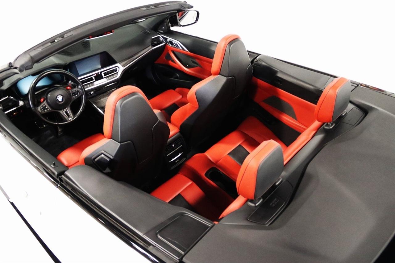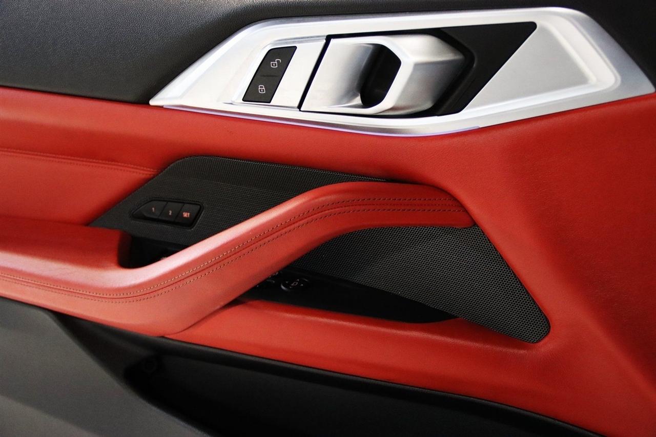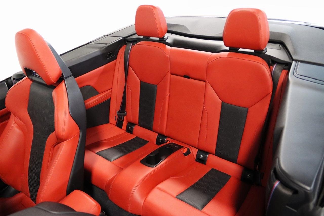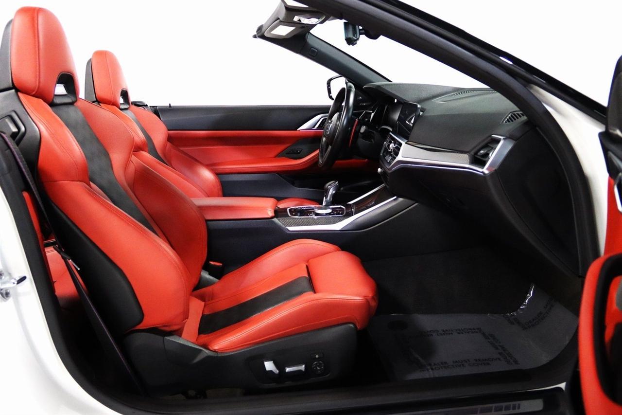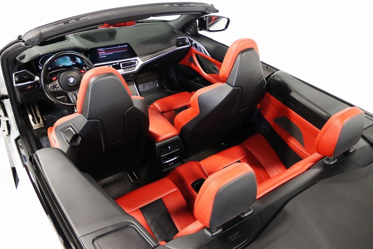 Navigation, Bluetooth, Back Up Camera, Soft Top, Heated Seats, Touch Screen, 16 Speakers, 4-Wheel Disc Brakes, ABS brakes, Active Driving Assistant Pro, Adaptive suspension, Air Conditioning, Alloy wheels, AM/FM radio: SiriusXM, Apple CarPlay & Android Auto Compatibility, Auto High-beam Headlights, Auto-dimming door mirrors, Auto-dimming Rear-View mirror, Automatic temperature control, BMW Assist eCall, BMW TeleServices, Brake assist, Bumpers: body-color, Carbon Fiber Trim, Compass, ConnectedDrive Services, Convertible roof lining, Convertible roof wind blocker, Delay-off headlights, Driver door bin, Driver vanity mirror, Driving Assistance Professional Package, Dual front impact airbags, Dual front side impact airbags, Electronic Stability Control, Emergency communication system: BMW Assist eCall, Enhanced USB/Bluetooth Plus Smartphone Integration, Executive Package, Extended Merino Leather Upholstery, Extended Traffic Jam Assistant, Exterior Parking Camera Rear, Four wheel independent suspension, Front anti-roll bar, Front Bucket Seats, Front Center Armrest, Front dual zone A/C, Front reading lights, Front Ventilated Seats, Fully automatic headlights, Garage door transmitter, Glass rear window, harman/kardon Surround Sound System, harman/kardon® Speakers, Head-Up Display, Heated door mirrors, Heated Front Seats, Heated front seats, Heated Steering Wheel, Icon Adaptive LED Headlights w/Laserlight, Illuminated entry, Integrated roll-over protection, Knee airbag, Leather Shift Knob, Live Cockpit Pro w/Navi, Low tire pressure warning, Lumbar Support, M Compound Brakes w/Red Calipers, M Shadowline Lights, M Sport Seats, Memory seat, Navigation System, Occupant sensing airbag, Outside temperature display, Overhead console, Panic alarm, Parking Assistance Package, Parking Assistant Plus, Passenger door bin, Passenger vanity mirror, Power convertible roof, Power door mirrors, Power driver seat, Power Front Seats, Power passenger seat, Power steering, Power windows, Radio data system, Radio: AM/FM Audio System, Rain sensing wipers, Rear air conditioning, Rear anti-roll bar, Rear reading lights, Rear seat center armrest, Rear window defroster, Remote Engine Start, Remote keyless entry, Security system, SiriusXM Satellite Radio, Speed control, Speed-sensing steering, Speed-Sensitive Wipers, Sport steering wheel, Steering wheel mounted audio controls, Tachometer, Telescoping steering wheel, Tilt steering wheel, Traction control, Trip computer, Turn signal indicator mirrors, Variably intermittent wipers, WiFi Hotspot, Wireless Charging. Clean CARFAX.