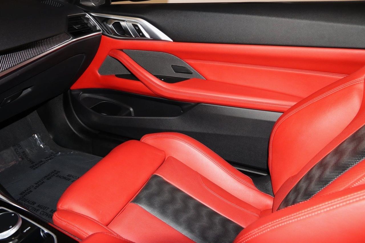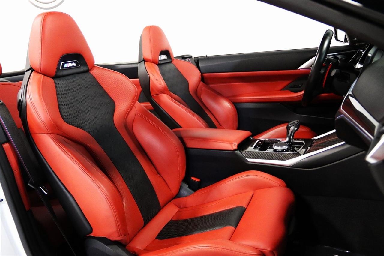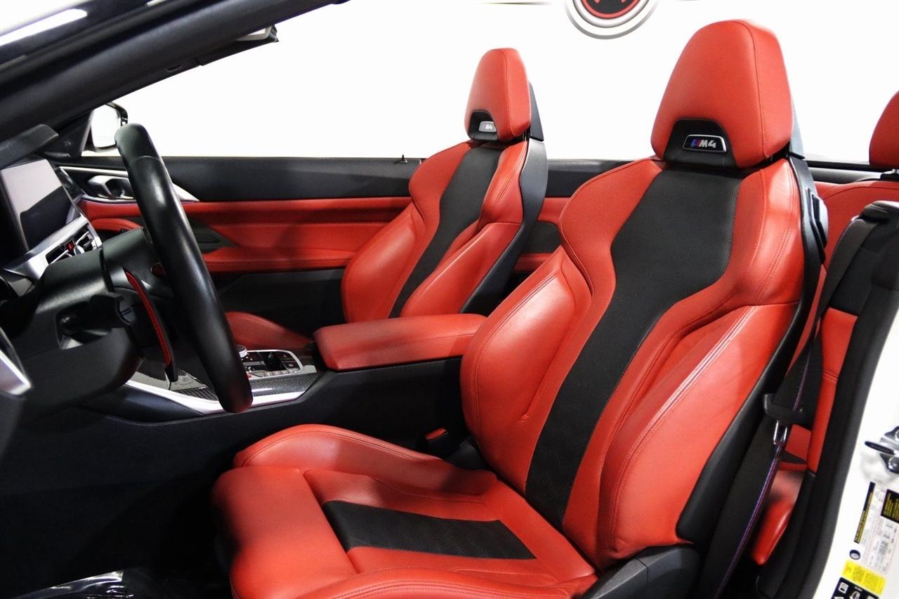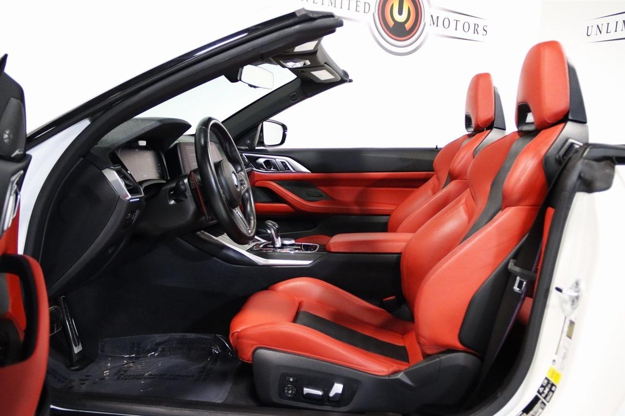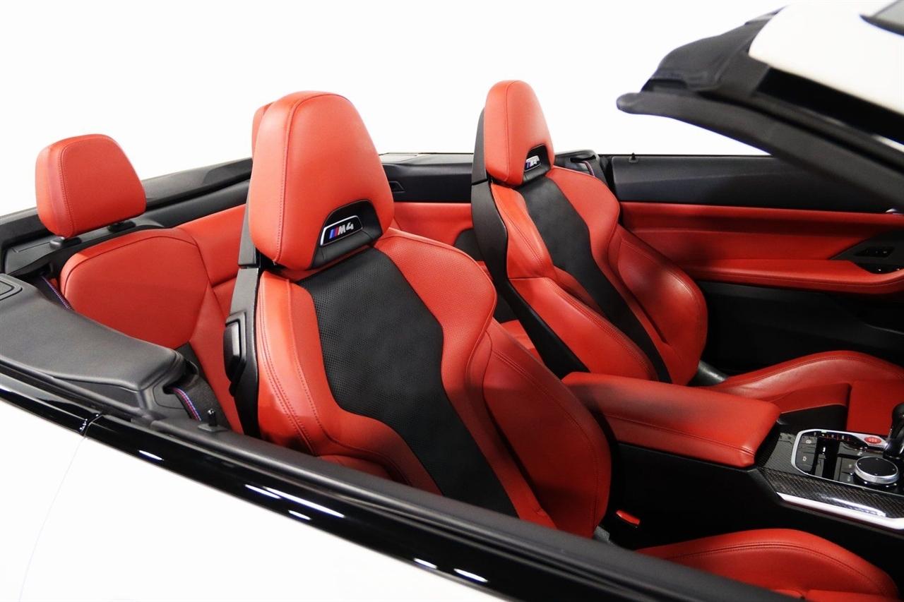 Navigation, Bluetooth, Back Up Camera, Soft Top, Heated Seats, Touch Screen, 16 Speakers, 4-Wheel Disc Brakes, ABS brakes, Active Driving Assistant Pro, Adaptive suspension, Air Conditioning, Alloy wheels, AM/FM radio: SiriusXM, Apple CarPlay & Android Auto Compatibility, Auto High-beam Headlights, Auto-dimming door mirrors, Auto-dimming Rear-View mirror, Automatic temperature control, BMW Assist eCall, BMW TeleServices, Brake assist, Bumpers: body-color, Carbon Fiber Trim, Compass, ConnectedDrive Services, Convertible roof lining, Convertible roof wind blocker, Delay-off headlights, Driver door bin, Driver vanity mirror, Driving Assistance Professional Package, Dual front impact airbags, Dual front side impact airbags, Electronic Stability Control, Emergency communication system: BMW Assist eCall, Enhanced USB/Bluetooth Plus Smartphone Integration, Executive Package, Extended Merino Leather Upholstery, Extended Traffic Jam Assistant, Exterior Parking Camera Rear, Four wheel independent suspension, Front anti-roll bar, Front Bucket Seats, Front Center Armrest, Front dual zone A/C, Front reading lights, Front Ventilated Seats, Fully automatic headlights, Garage door transmitter, Glass rear window, harman/kardon Surround Sound System, harman/kardon® Speakers, Head-Up Display, Heated door mirrors, Heated Front Seats, Heated front seats, Heated Steering Wheel, Icon Adaptive LED Headlights w/Laserlight, Illuminated entry, Integrated roll-over protection, Knee airbag, Leather Shift Knob, Live Cockpit Pro w/Navi, Low tire pressure warning, Lumbar Support, M Compound Brakes w/Red Calipers, M Shadowline Lights, M Sport Seats, Memory seat, Navigation System, Occupant sensing airbag, Outside temperature display, Overhead console, Panic alarm, Parking Assistance Package, Parking Assistant Plus, Passenger door bin, Passenger vanity mirror, Power convertible roof, Power door mirrors, Power driver seat, Power Front Seats, Power passenger seat, Power steering, Power windows, Radio data system, Radio: AM/FM Audio System, Rain sensing wipers, Rear air conditioning, Rear anti-roll bar, Rear reading lights, Rear seat center armrest, Rear window defroster, Remote Engine Start, Remote keyless entry, Security system, SiriusXM Satellite Radio, Speed control, Speed-sensing steering, Speed-Sensitive Wipers, Sport steering wheel, Steering wheel mounted audio controls, Tachometer, Telescoping steering wheel, Tilt steering wheel, Traction control, Trip computer, Turn signal indicator mirrors, Variably intermittent wipers, WiFi Hotspot, Wireless Charging. Clean CARFAX.
